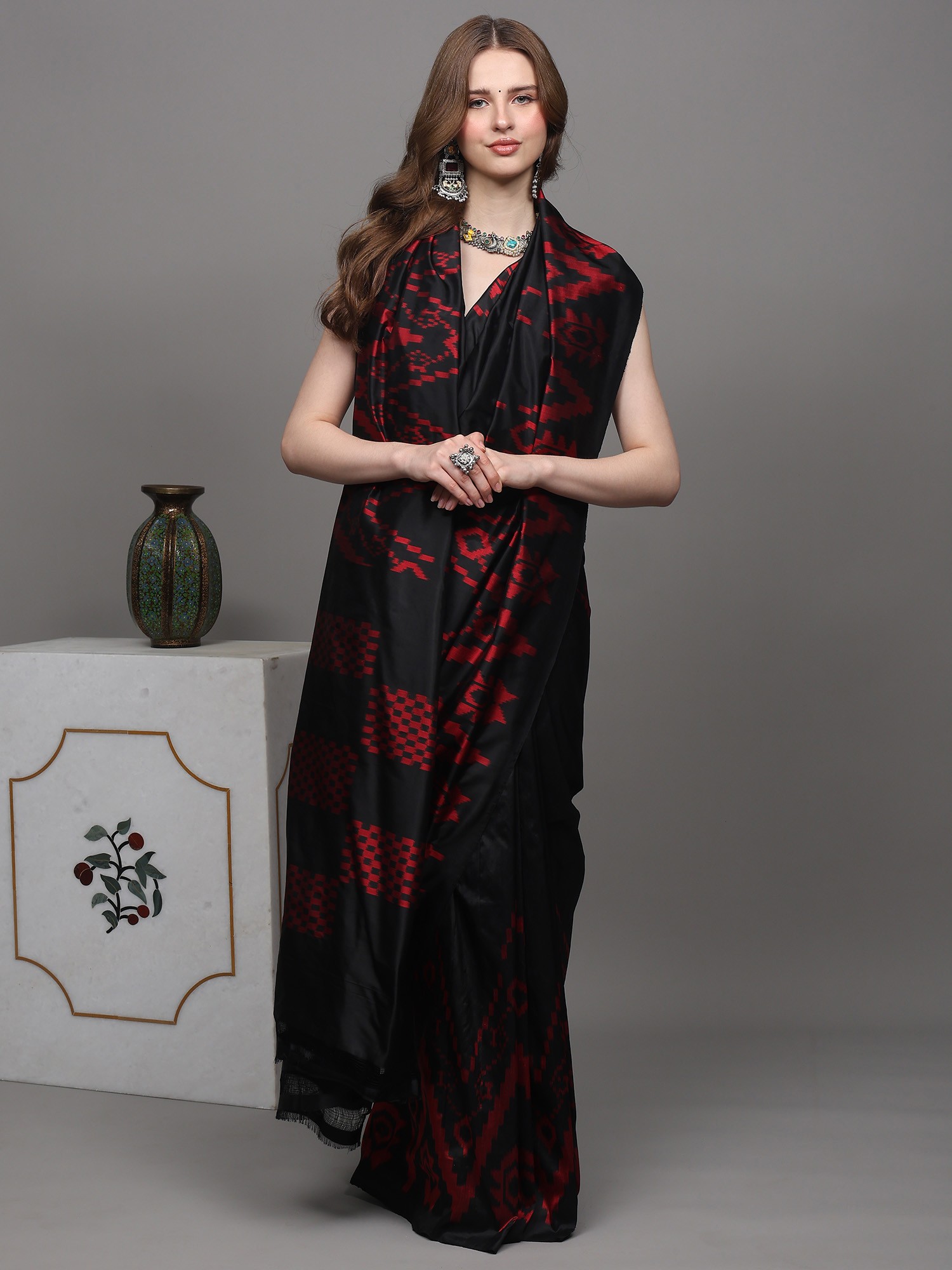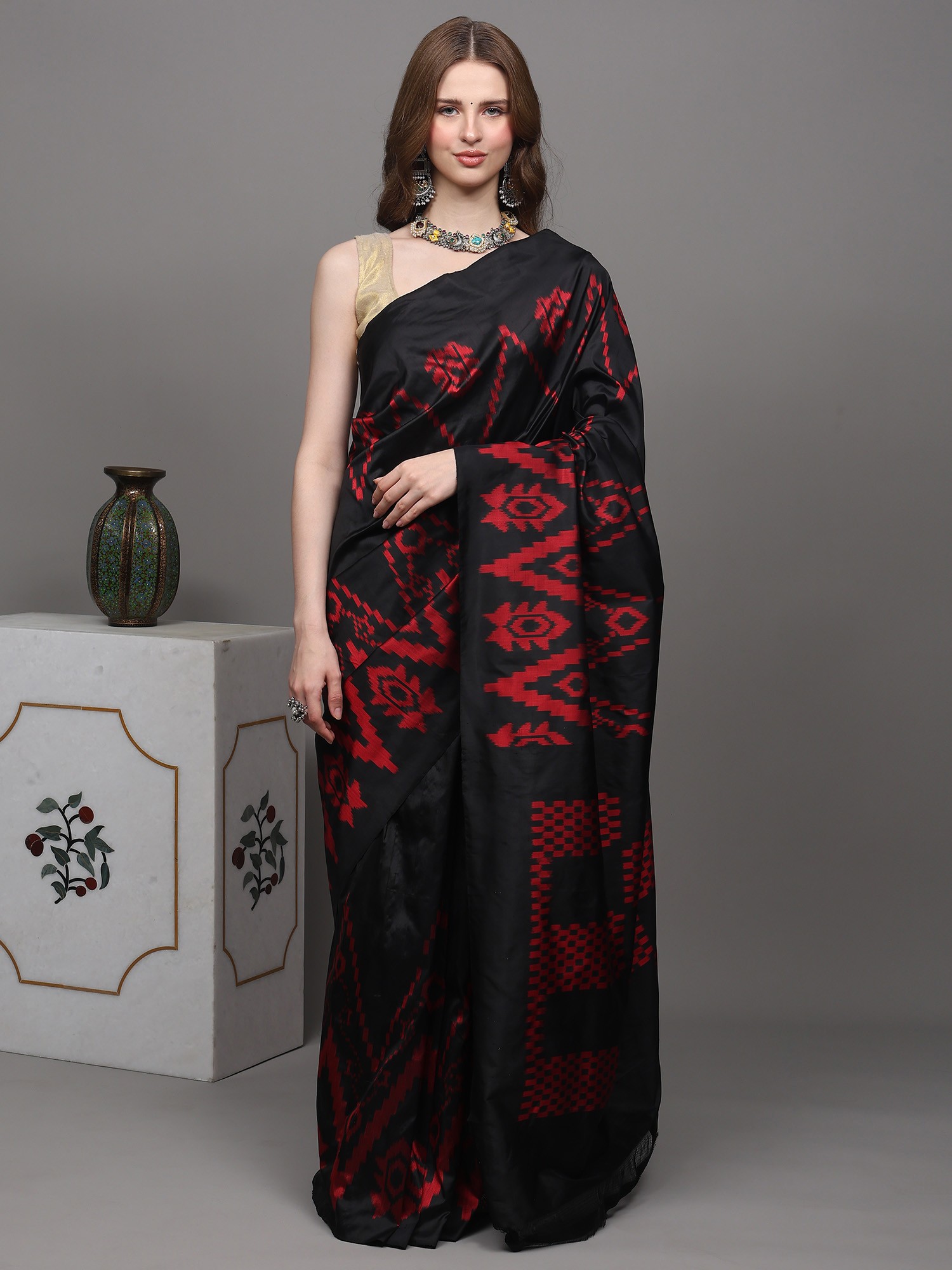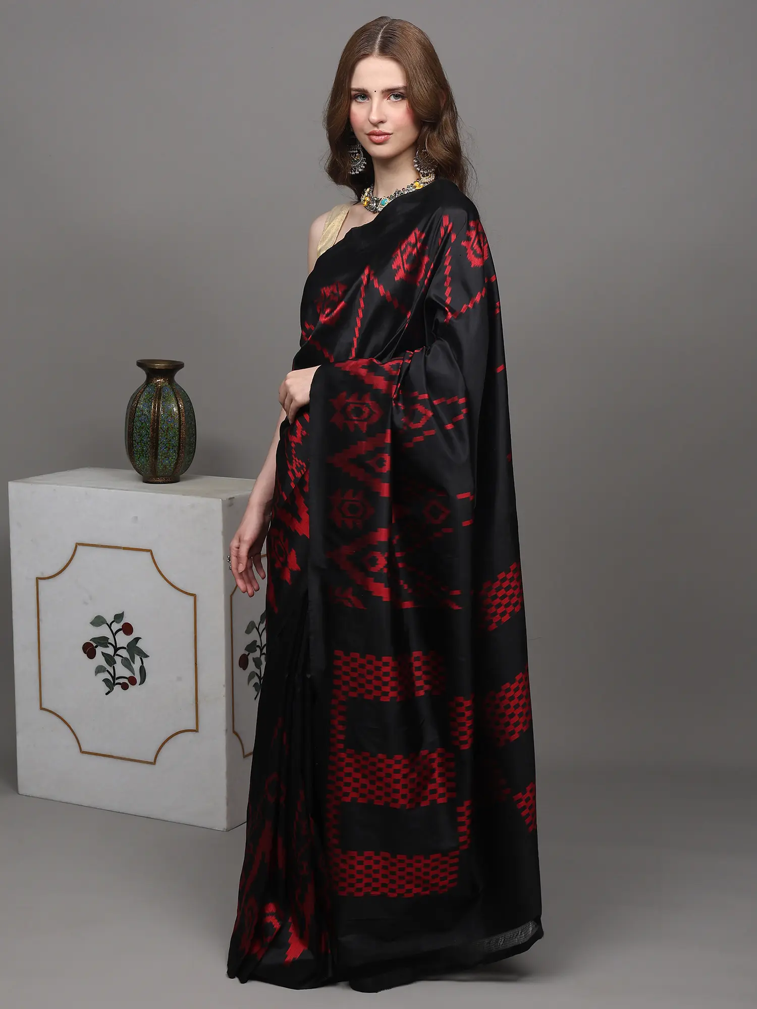 The richness of pure silk finds a beautiful feel in this Jet-black handloom saree from Pochampally. The single Ikat weave patterns bloom brilliantly on the border and the pallu, with the loveliness of red hue which gorgeously balances the mystical appeal of black. The Pochampally Ikat sarees are prized pieces for their symmetrical beauty of patterns, traditionally known as Paagadu Bandhu, which finds a lovely expression on the silken field of this saree.