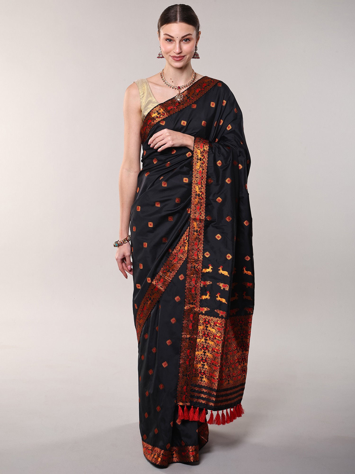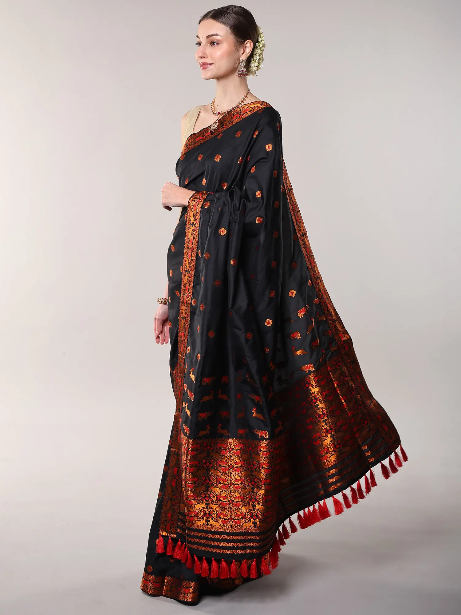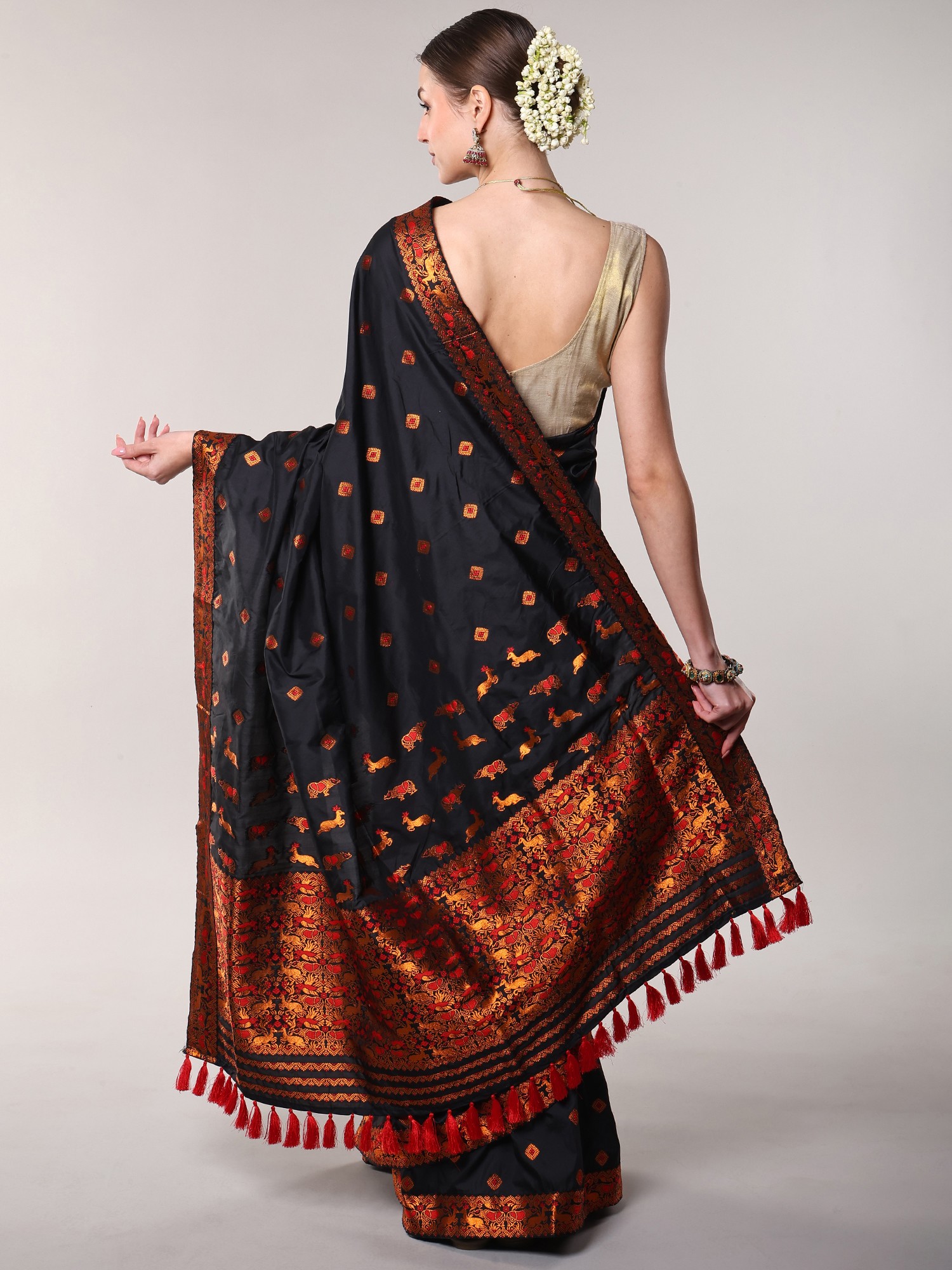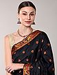 Bristol-Black Saree with Contrast Thread Woven Motifs and Tassles Pallu from Assam