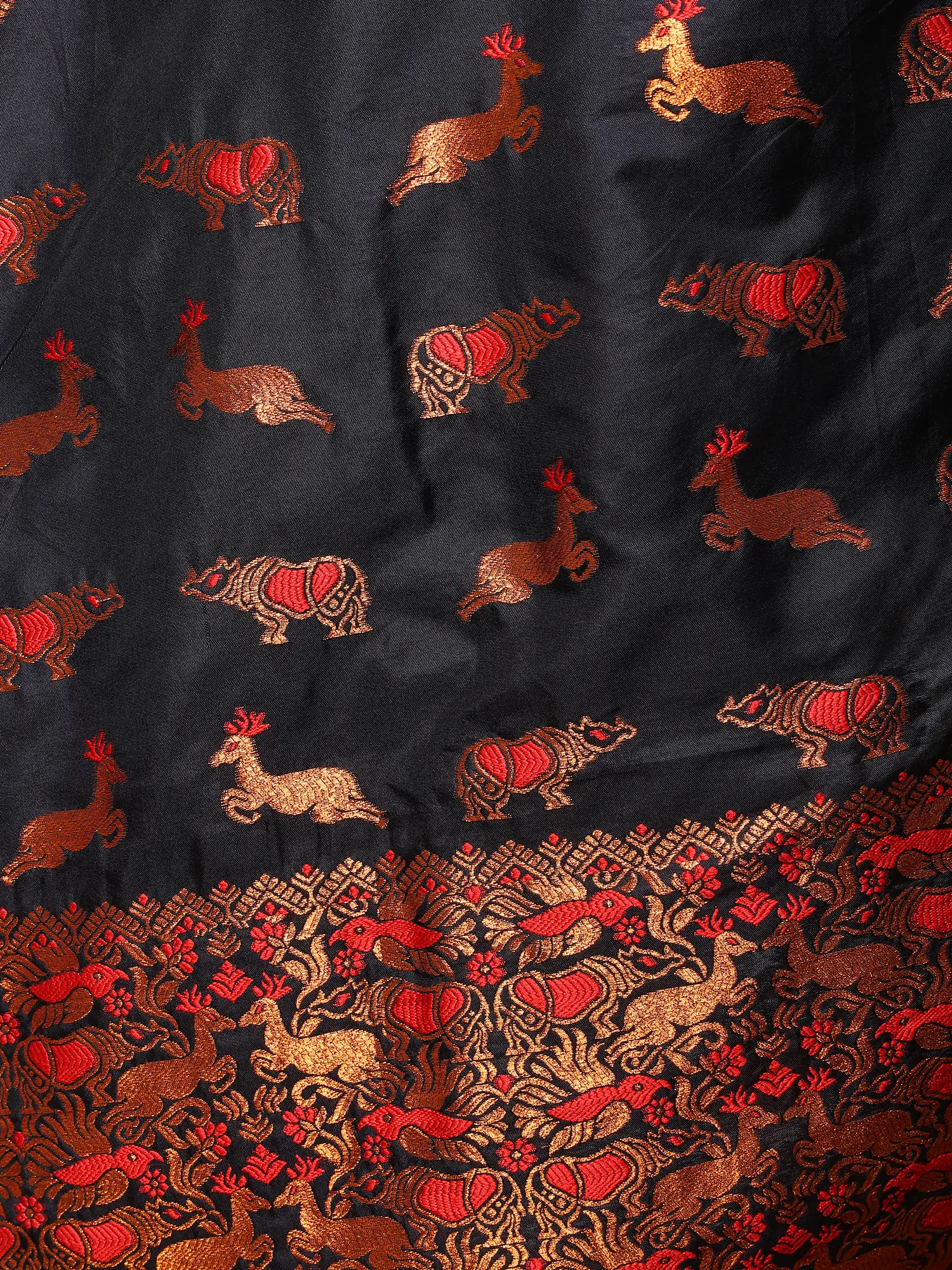 The deep, enigmatic black of the pure silk provides a sophisticated foundation, allowing the intricate woven bootis to truly stand out. These small, geometric motifs, rendered in radiant copper thread, create a subtle yet captivating texture that draws the eye. The border and the magnificent pallu are a spectacle of artistry, featuring a rich tapestry of woven patterns, including striking animal motifs, all framed by the warm glow of the copper threads. You will feel the luxurious weight and silken glide of the fabric as it drapes elegantly, enhancing your silhouette with every movement. The accompanying blouse and underskirt are tailored to perfectly complement the drape and style of the main garment.