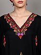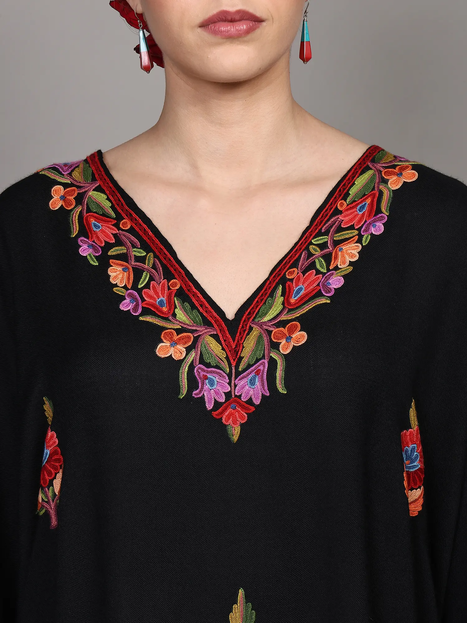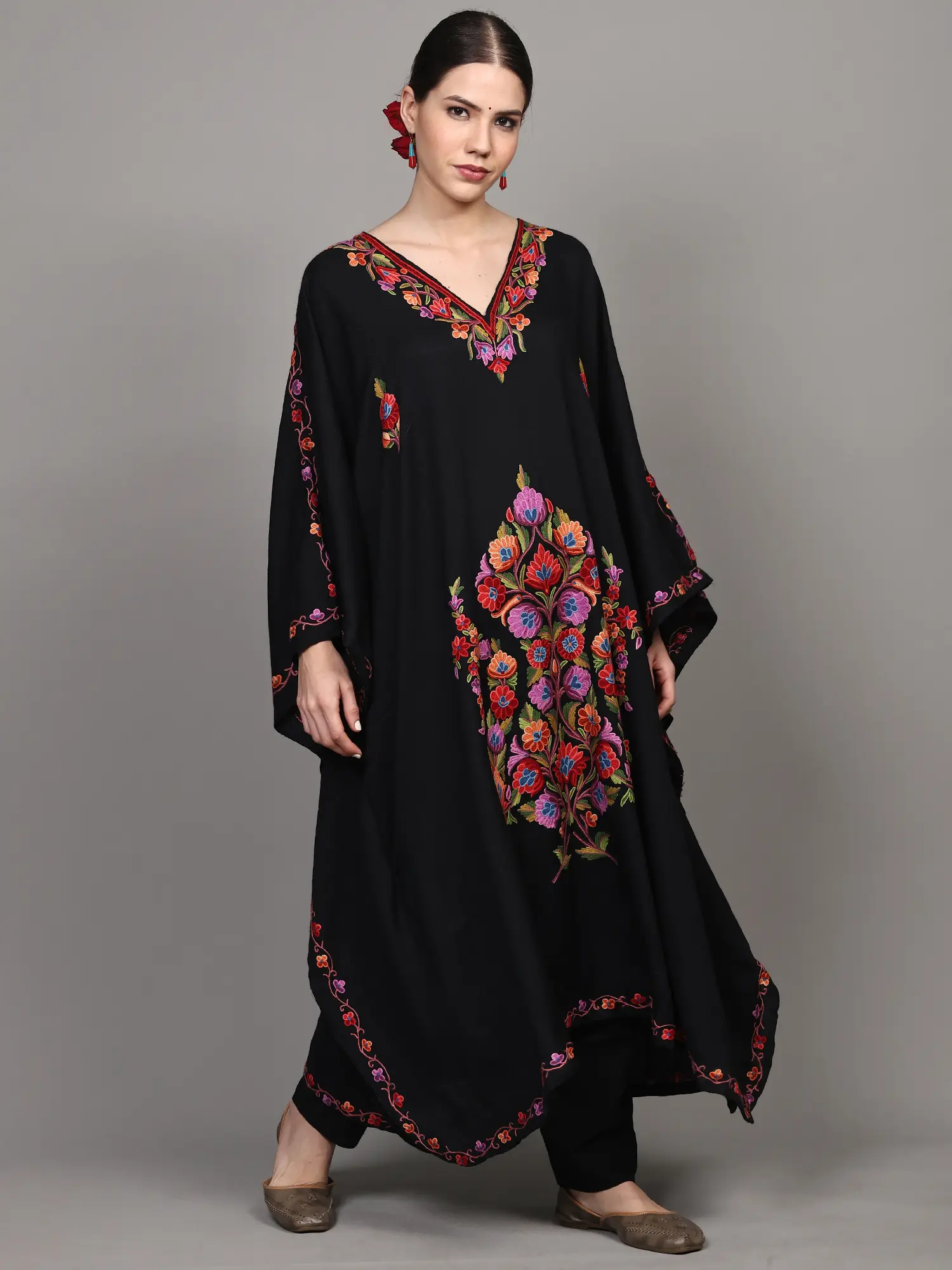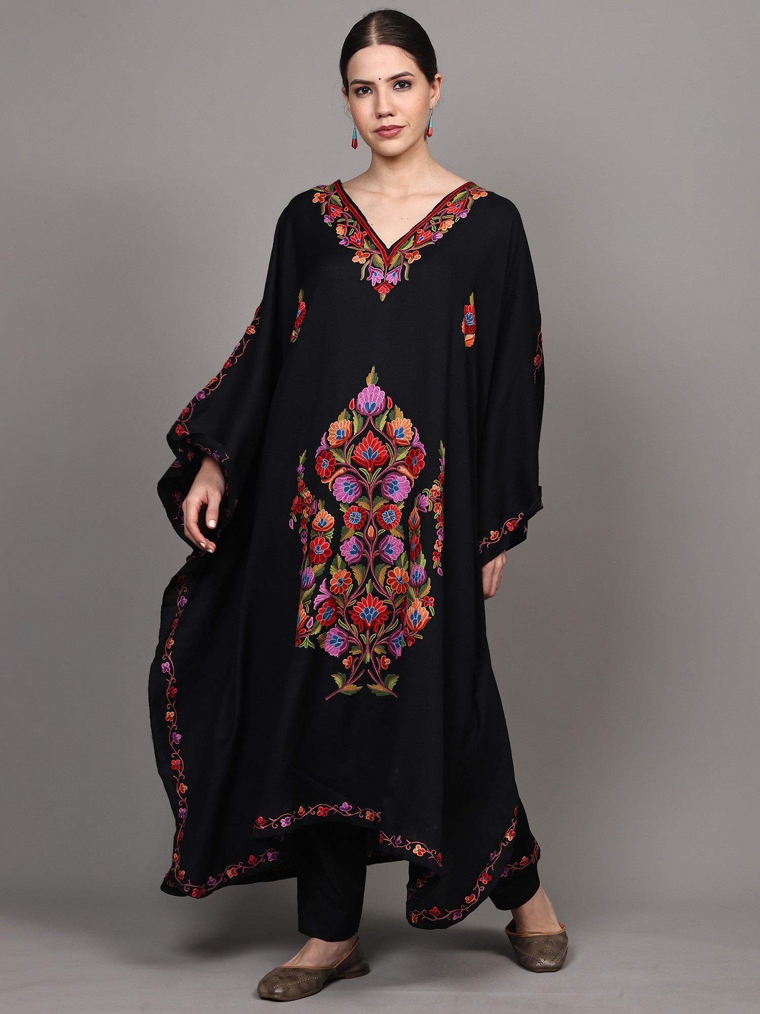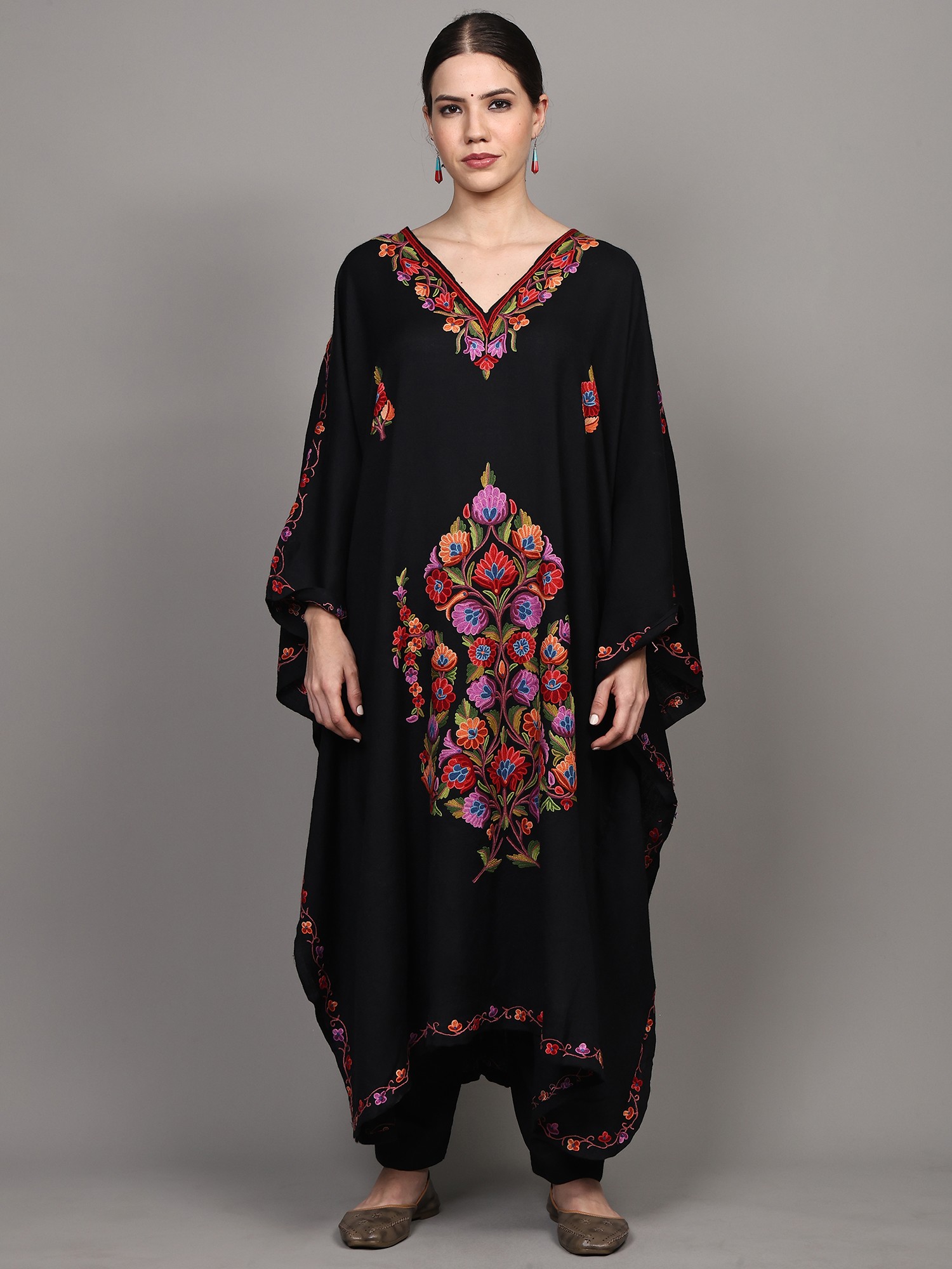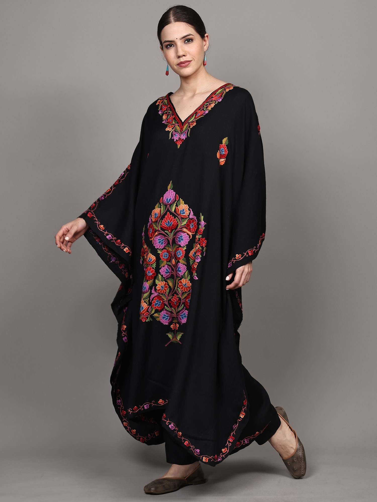 Caviar-Black Digital Floral Printed Kaftan from Kashmir with Aari-Embroidery on Neck