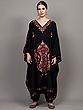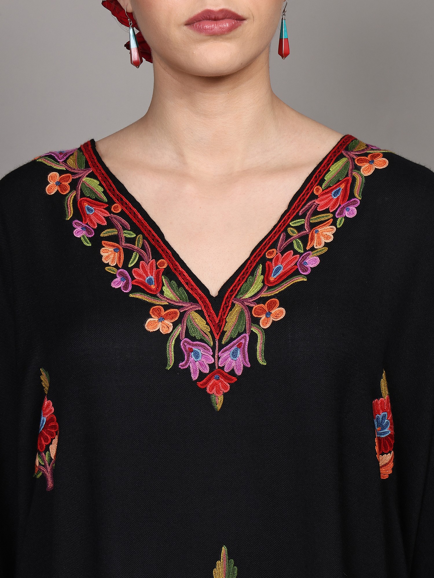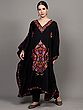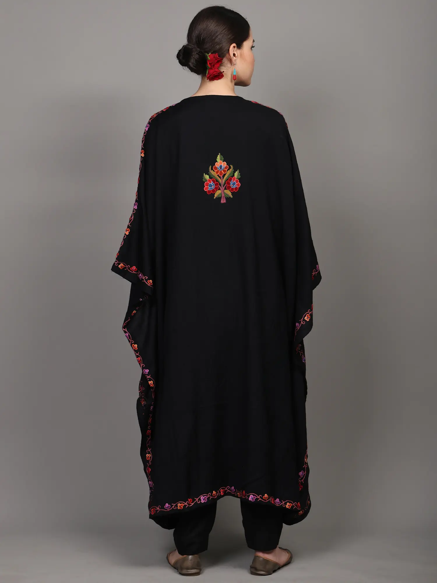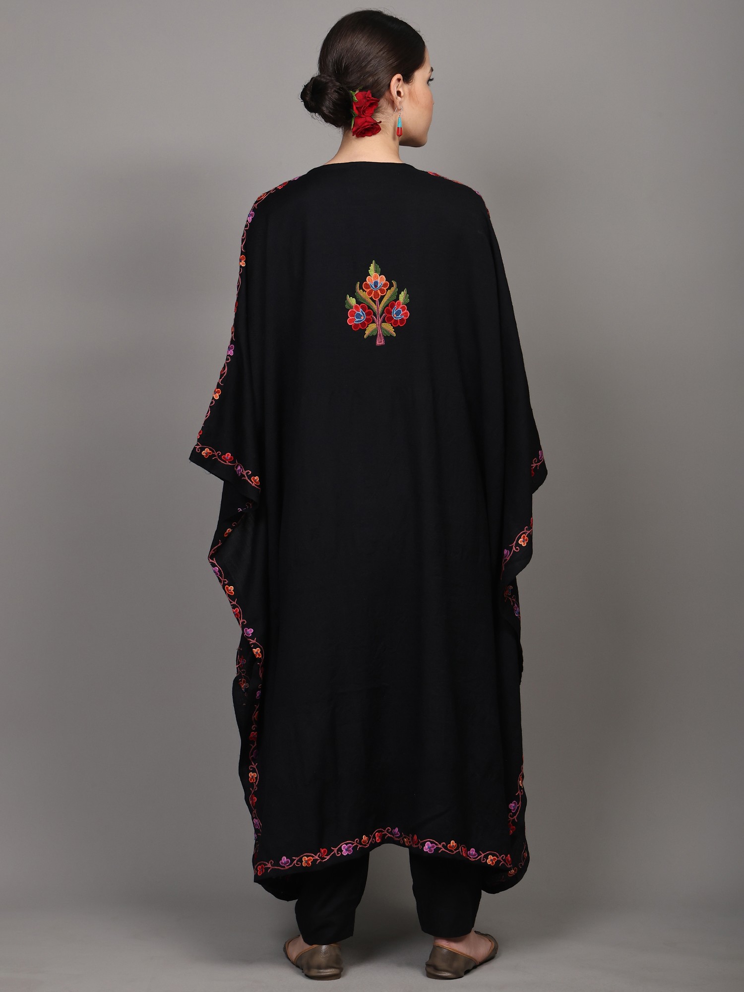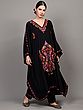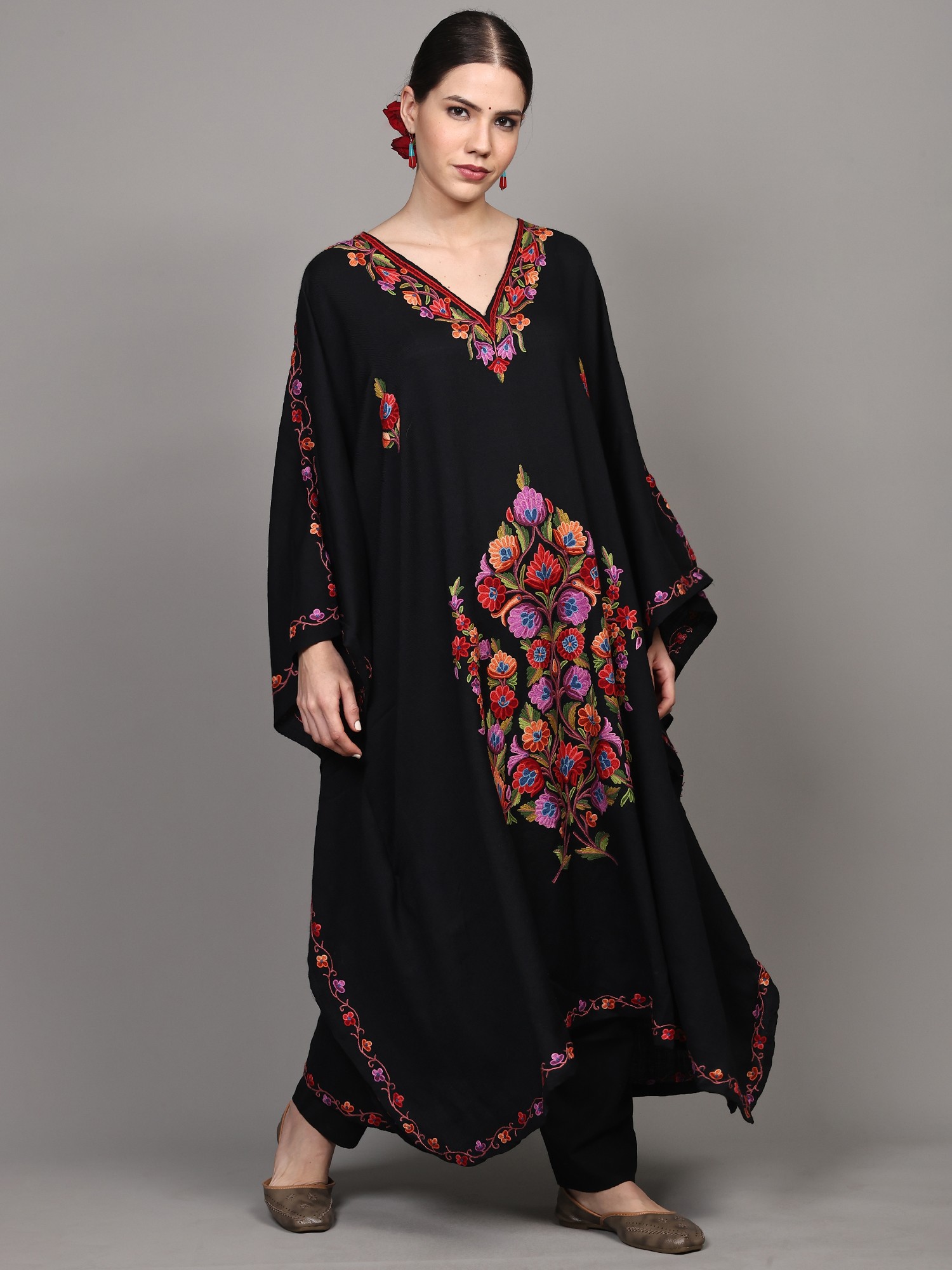 Black-Beauty Long Kaftan from Kashmir with Aari Embroidered Paisleys in Multicolor Thread