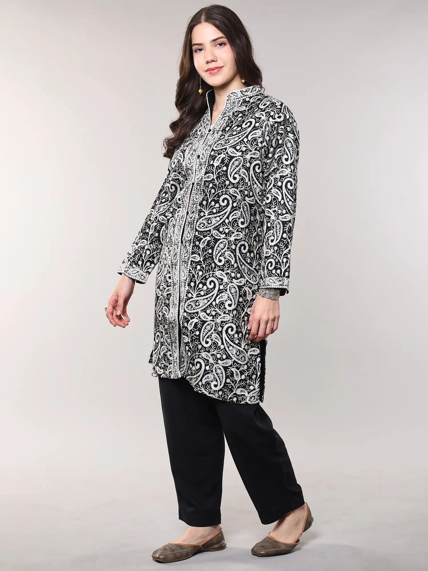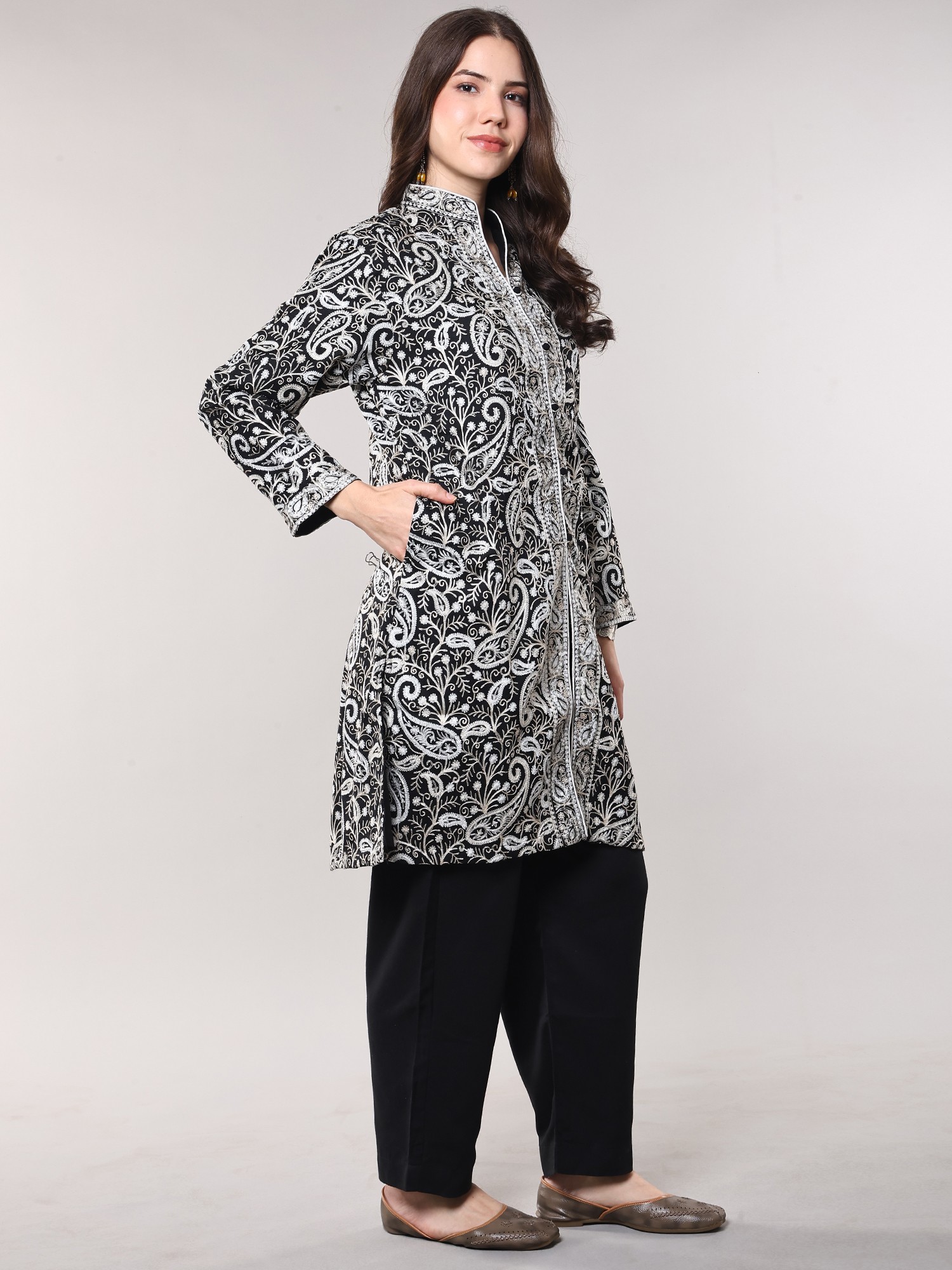 This design draws inspiration from the rich cultural tapestry of Kashmir, a region renowned for its unparalleled textile heritage and intricate embroidery. The paisley, a motif deeply rooted in Persian and Indian art, symbolizes life and vitality, adding a layer of meaningful beauty to your wardrobe. Wearing this piece connects you to a legacy of artistry and tradition that has been cherished for centuries.
