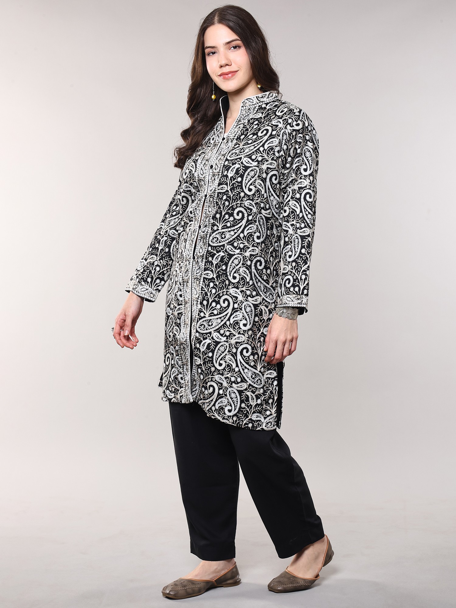 Black-Sand Wool Long Jacket from Kashmir with Chain Stitch Aari Embroidered Patterns
