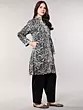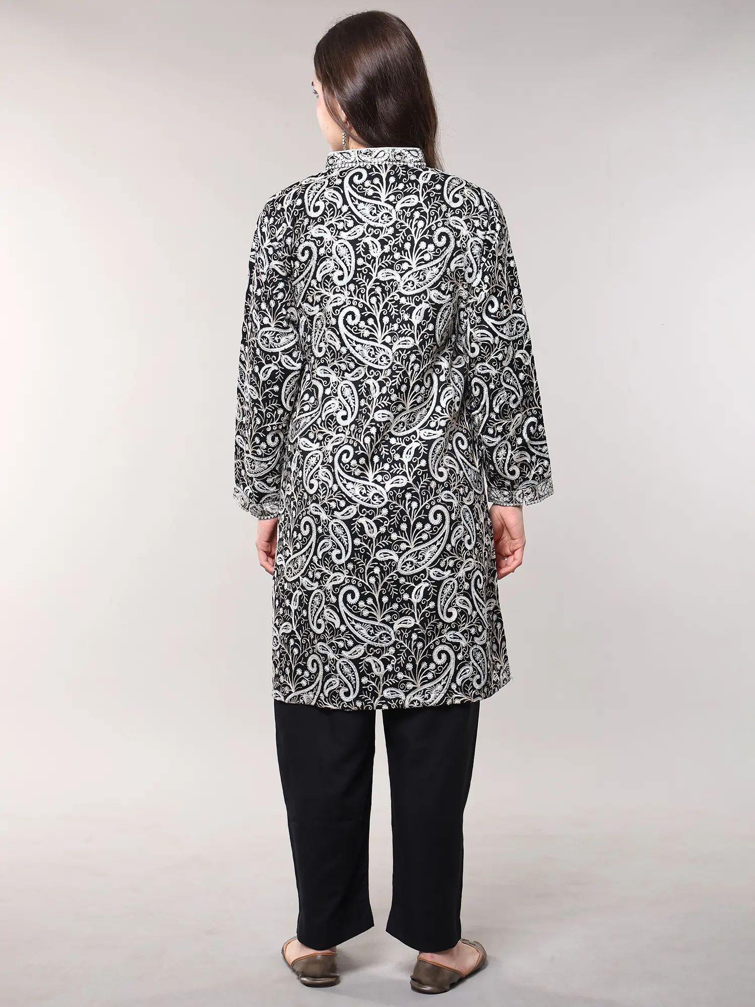 The jet-black pure wool provides a dramatic canvas for the all-over Aari embroidered paisleys, creating a striking visual contrast that captivates the eye. The generous cut, with a bust of 42 inches and a length of 38 inches, ensures a graceful drape that flatters various body types. The 17-inch shoulders and 21-inch sleeve length contribute to a silhouette that is both contemporary and classic, offering a comfortable yet polished aesthetic.