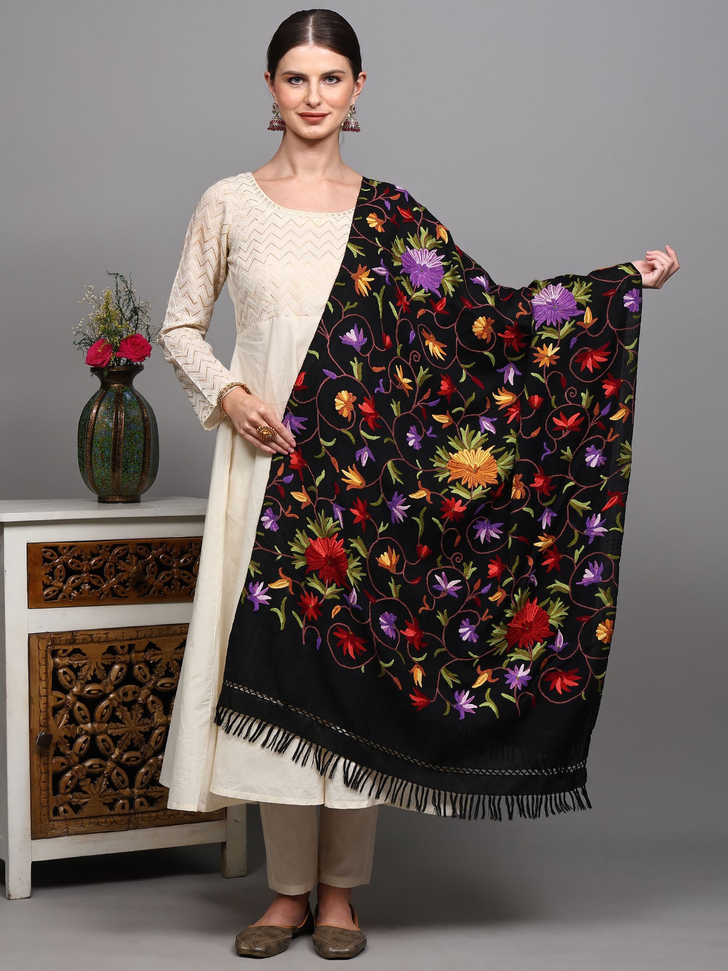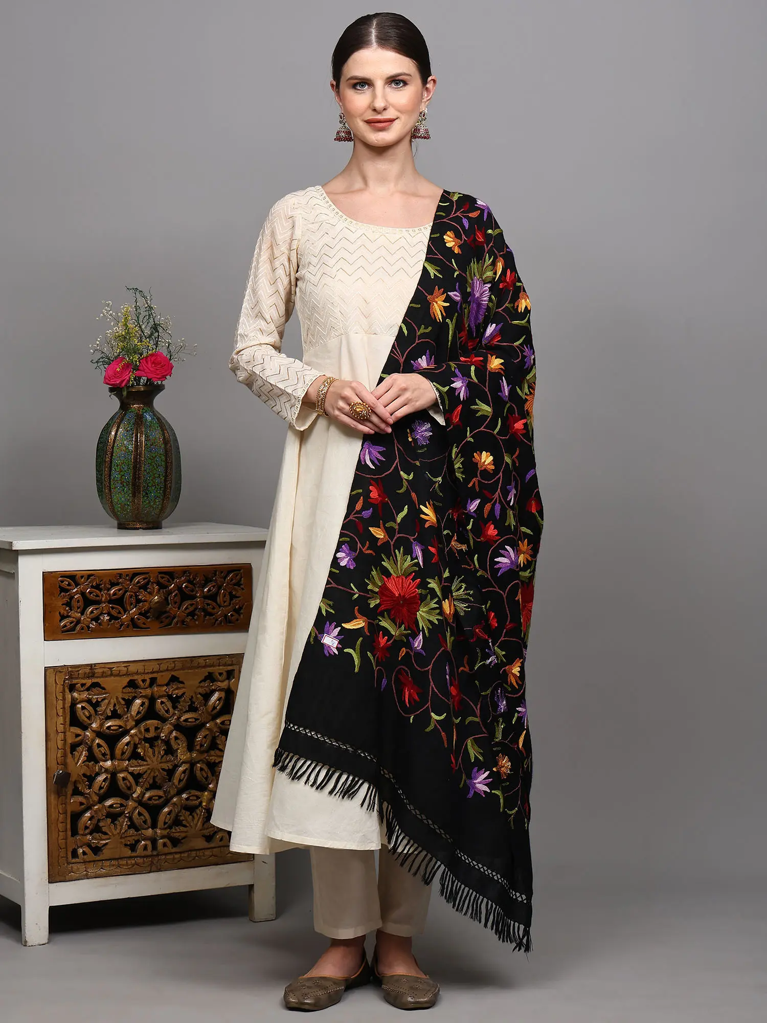 Wool Stole with Chain Stitch Aari Embroidered Floral Vines