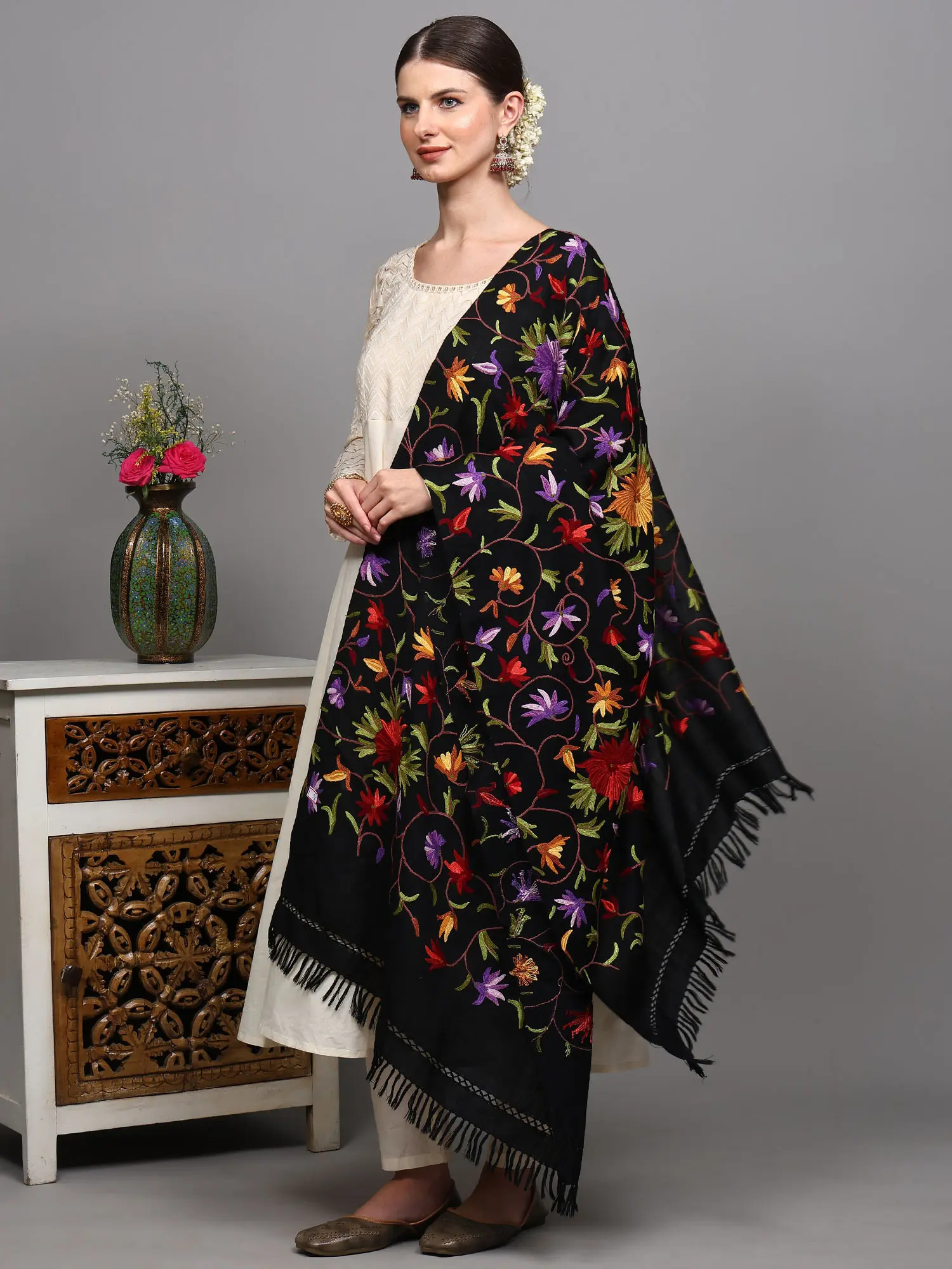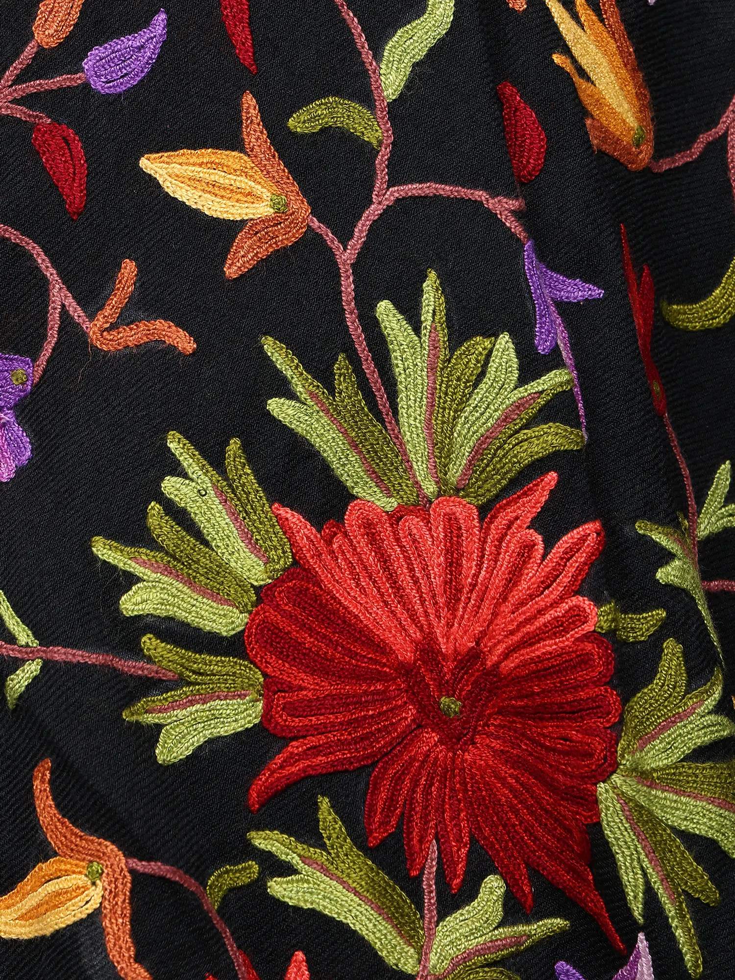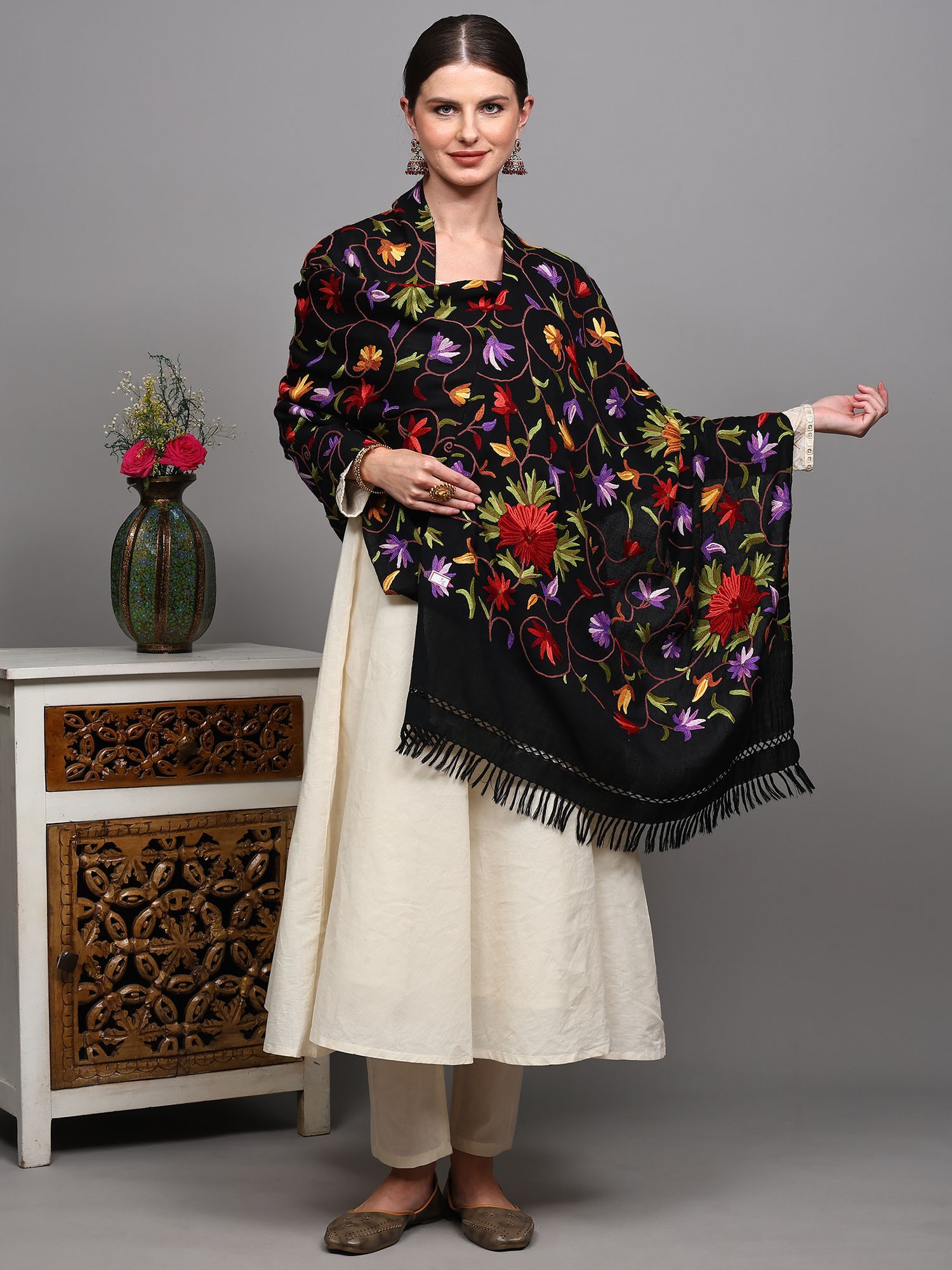 Bristol-Black Pure Wool Stole with Aari Detailed Hand-Embroidered Peacock and Flowers from Kashmir
