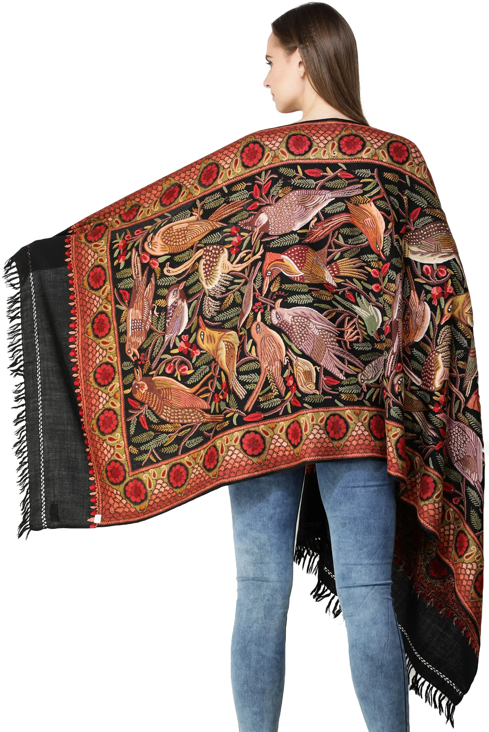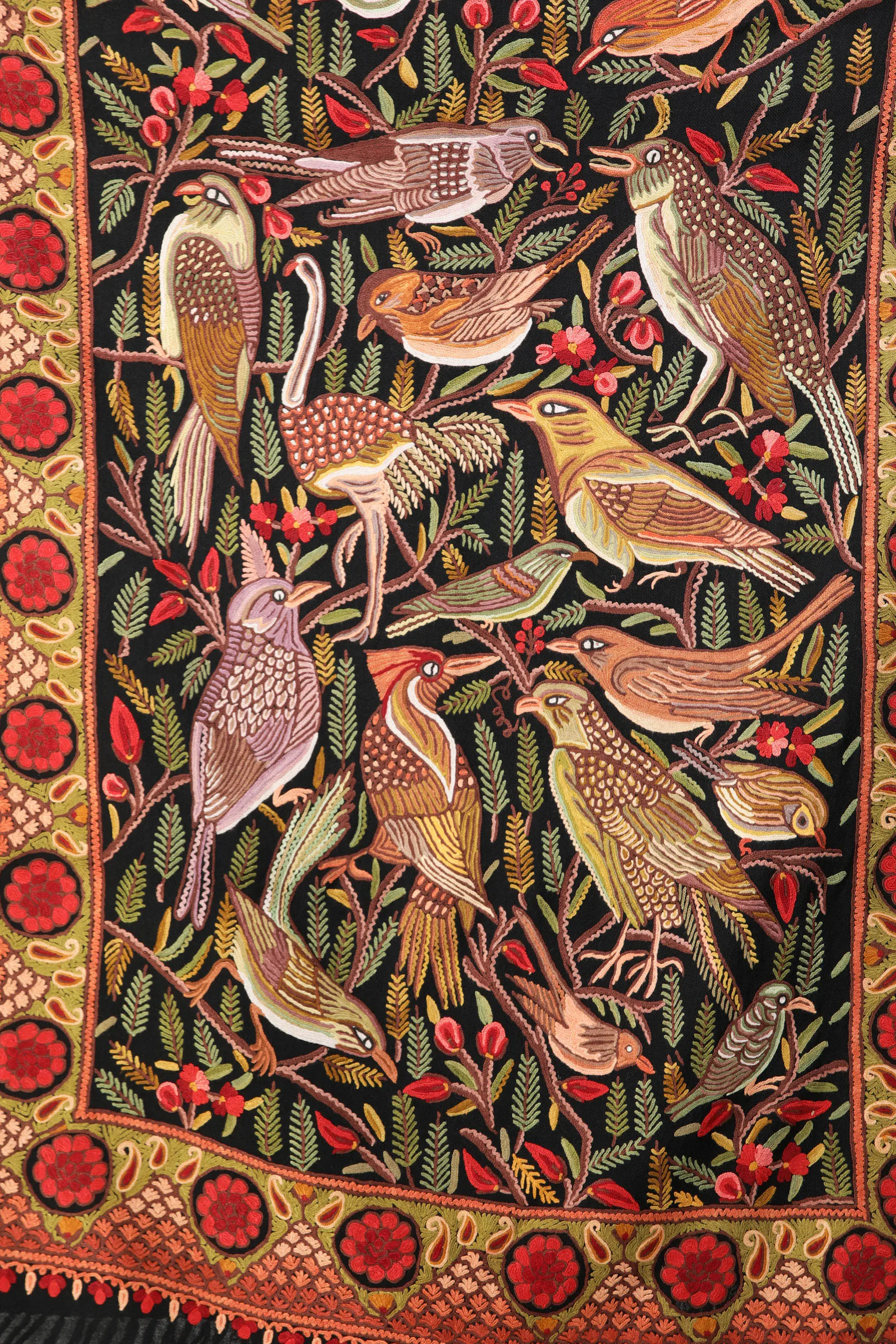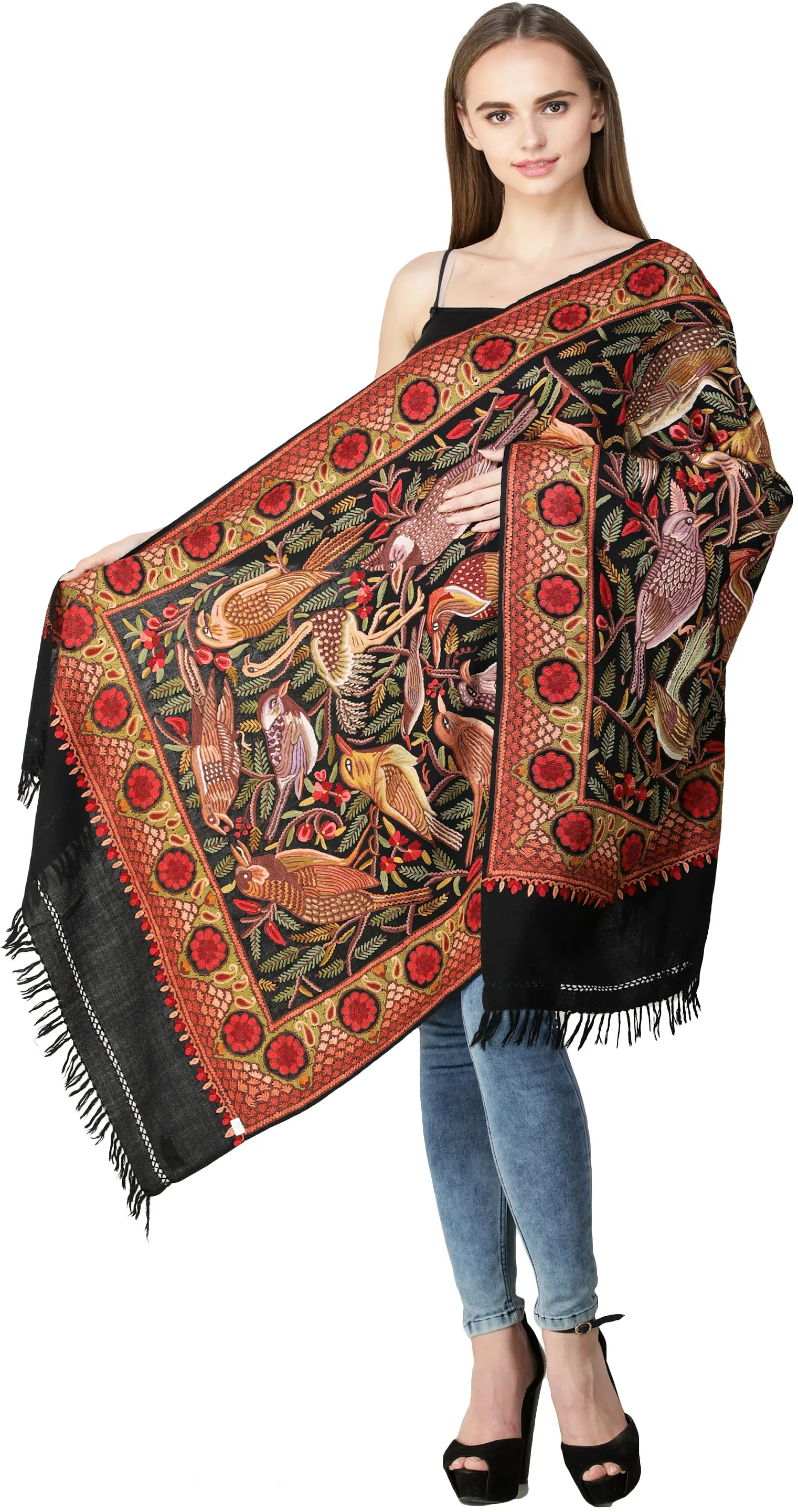 Jet-Black Stole from Kashmir with Aari Embroidered Birds and Flowers