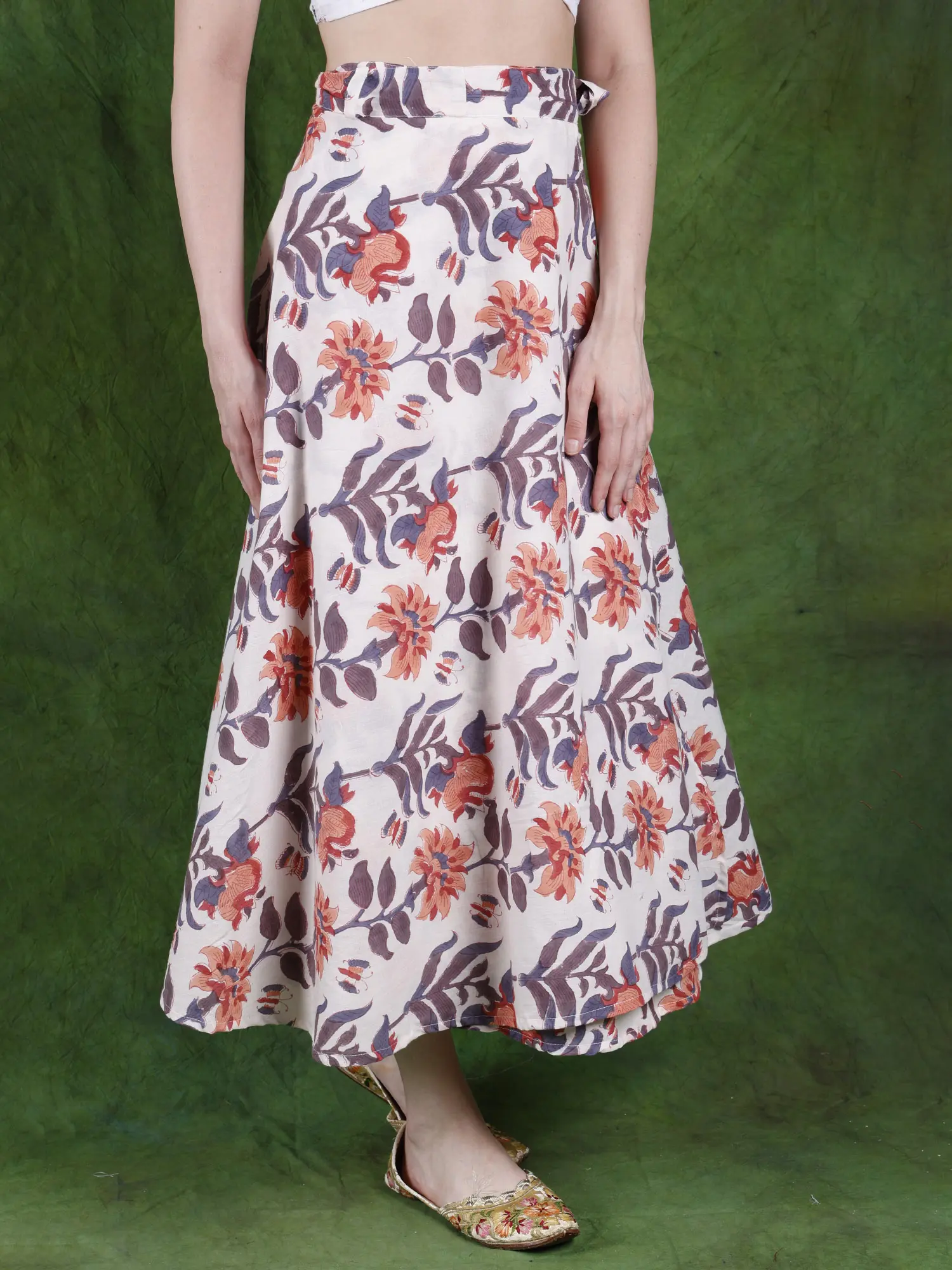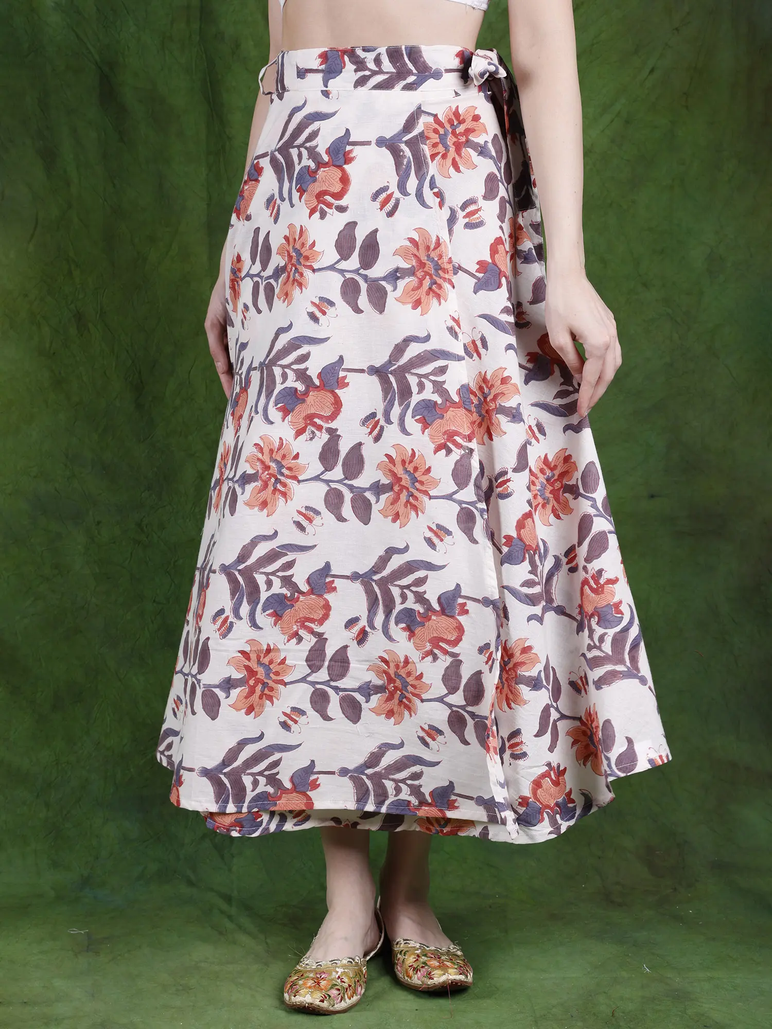The Jet-Stream Wrap-On Long Skirt in pure cotton showcases a pristine white color adorned with bold block-printed floral vines. This elegant design enhances the natural appeal of the cotton fabric, providing a comfortable and breathable feel.