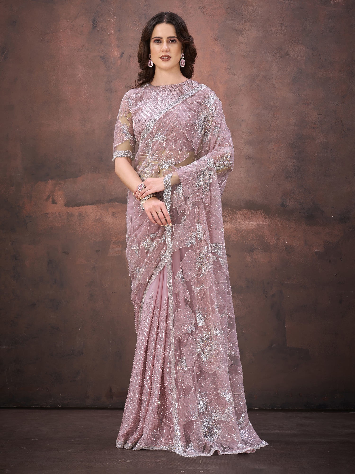 Jimmy Choo Mono Net Sequins Beads Applique Embellished Designer Partywear Saree For Wedding And Reception Functions