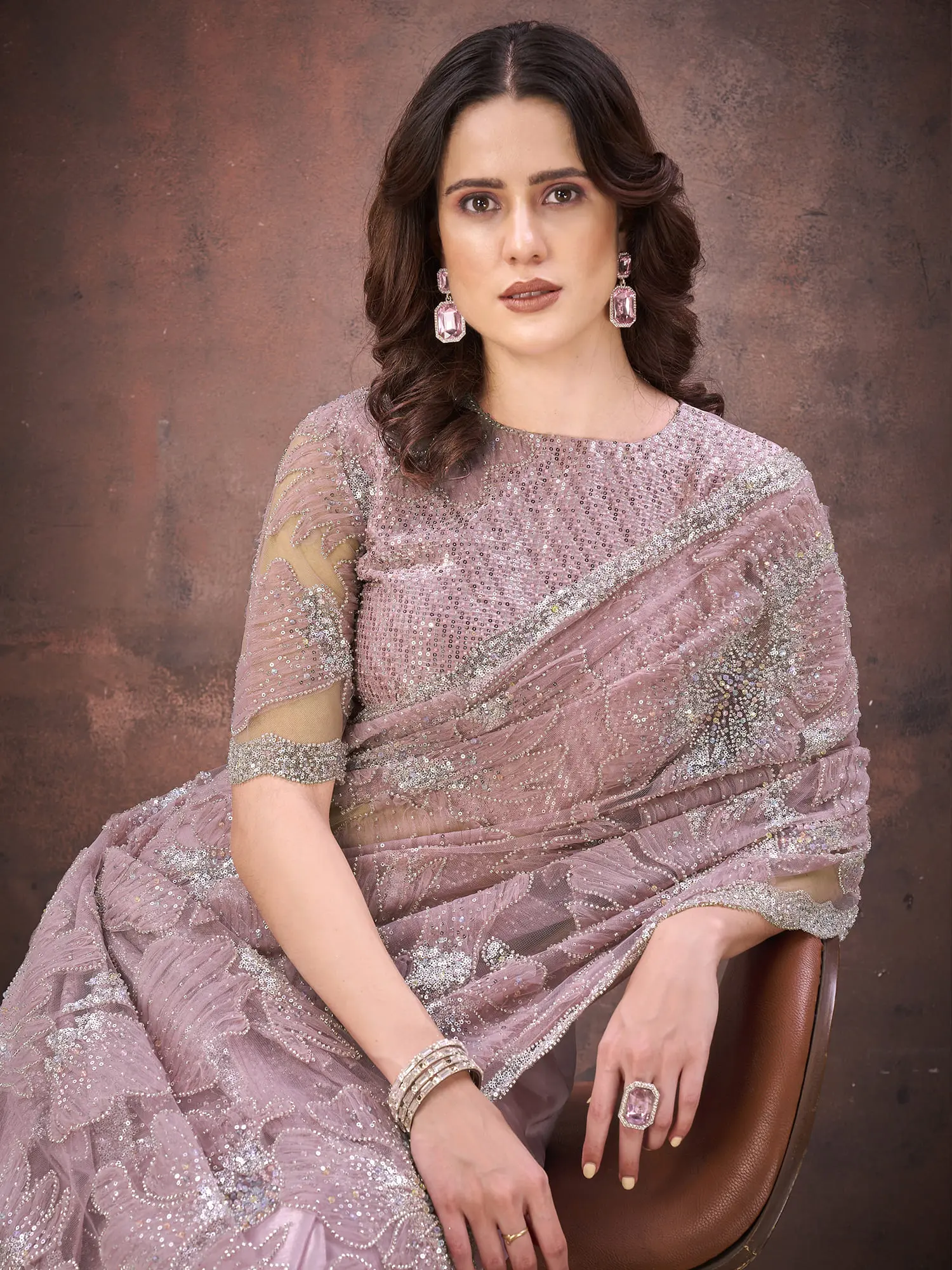 Crush Satin Mononet Saree With Beads Dual Sequins Embellishment Designer Partywear For Wedding Reception