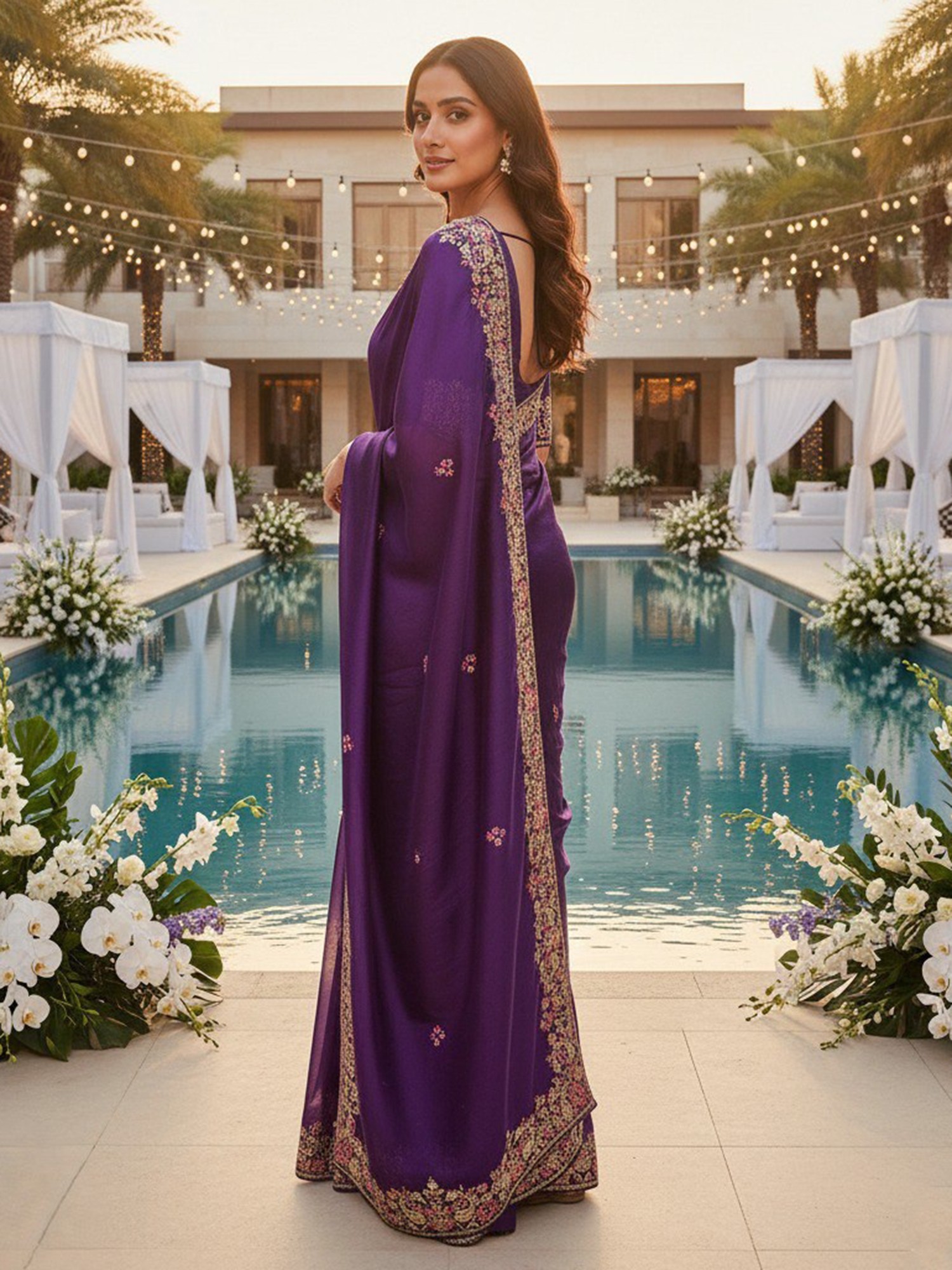 Luxurious Zari Organza Satin Saree With Exquisite Thread Embroidery Stone Handwork And Delicate Border Detailing