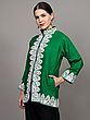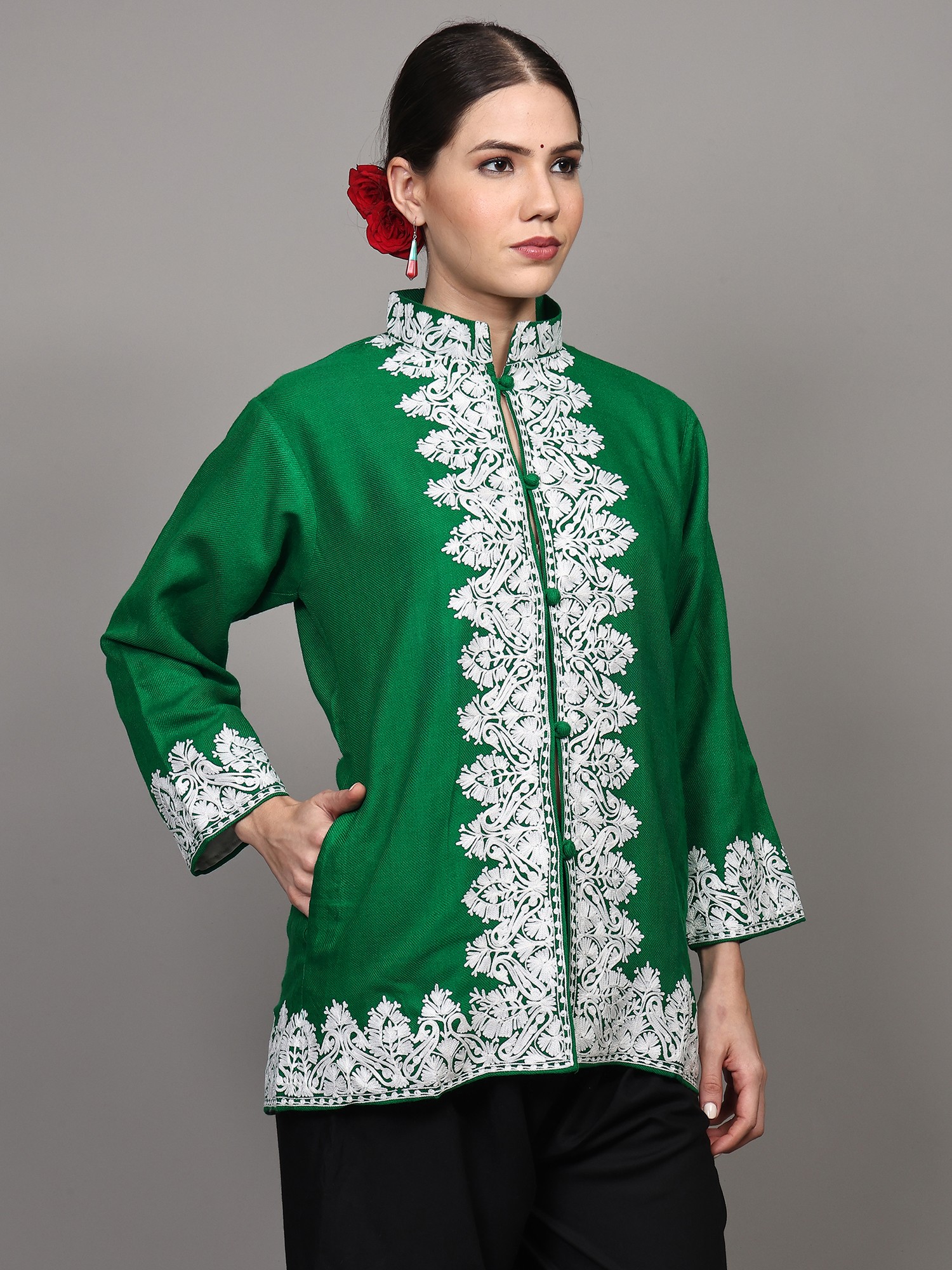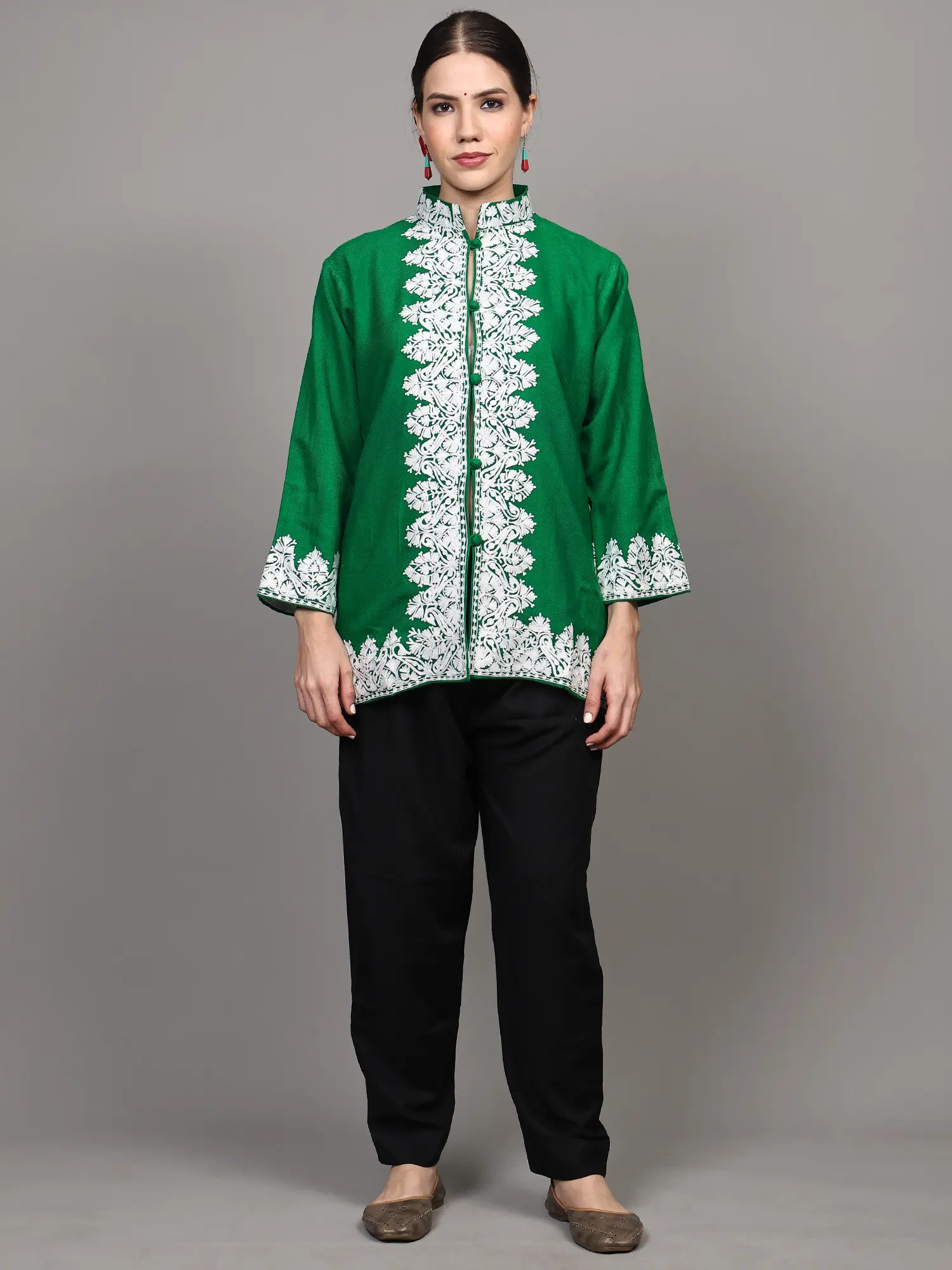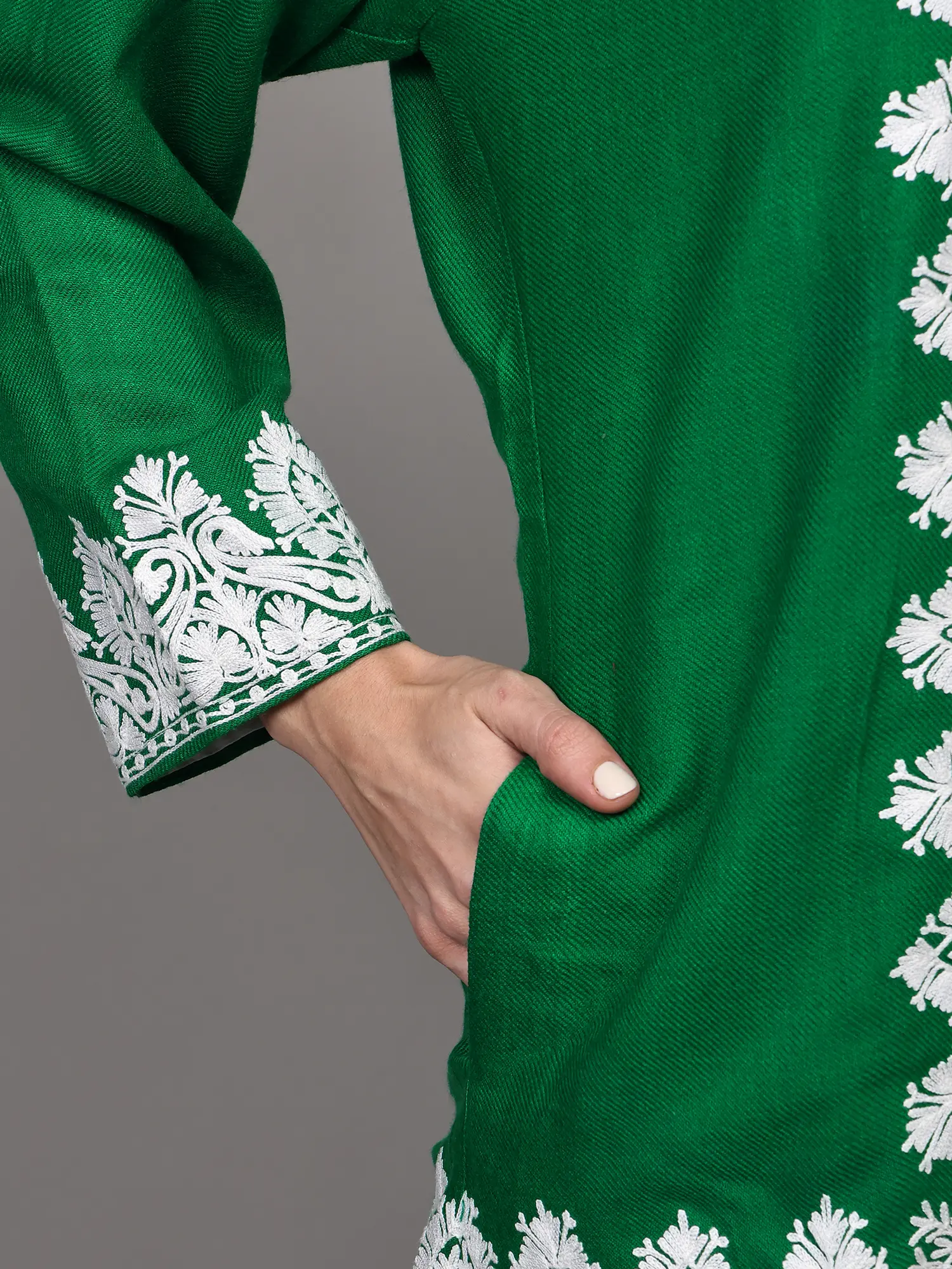 Summer-Green Long Kaftan from Kashmir with Aari Embroidered Flowers