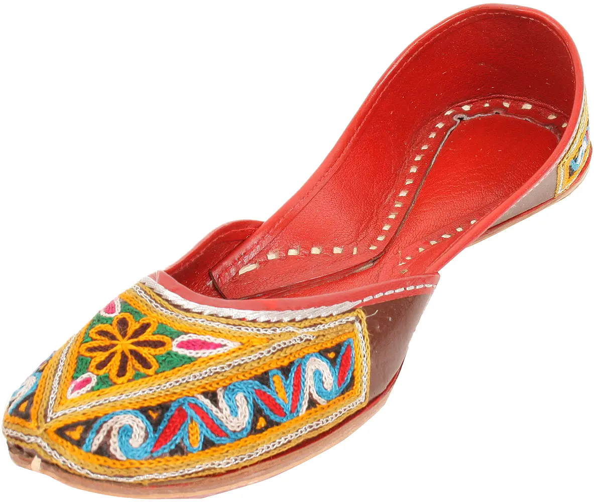 Indian traditional footwear, known as Jutti, has been around since 200 BC. From being a typical footwear brand, Jutti's has transformed into a custom-made, ethical essential. They are spherical or M-shaped and cover the front portion of the feet. This Jootis with Floral Aari-Embroidery in Multi-Color Thread carries forward the traditional craft. It is made of leather that has been painted in a bright red color. The colorful aari work on the red leather base creates a spring-like view and generates happy vibes. This Jutti is the perfect footwear to go with a bright shalwar kameez or saree.