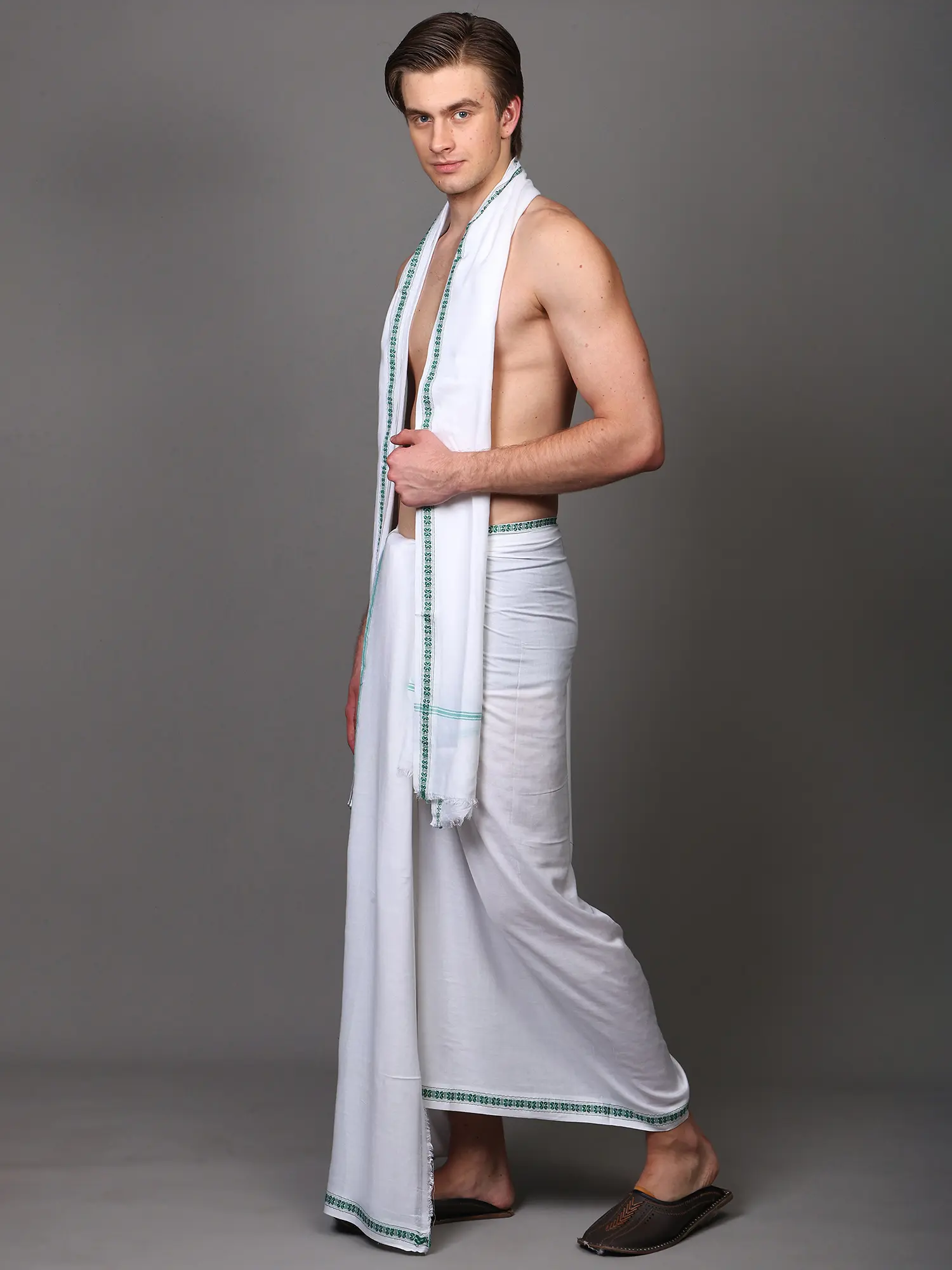 Bright-White Pure Cotton Dhoti-Veshti Drape Set With Woven Border