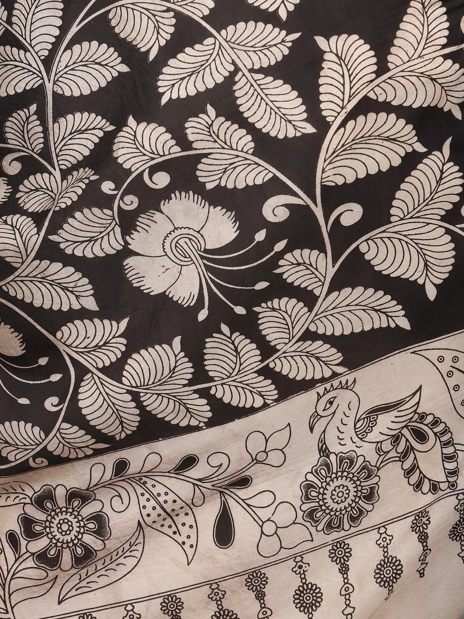 Mojave and Green Kalamkari Sari from Seemandhra with Painted Flowers and Peacocks