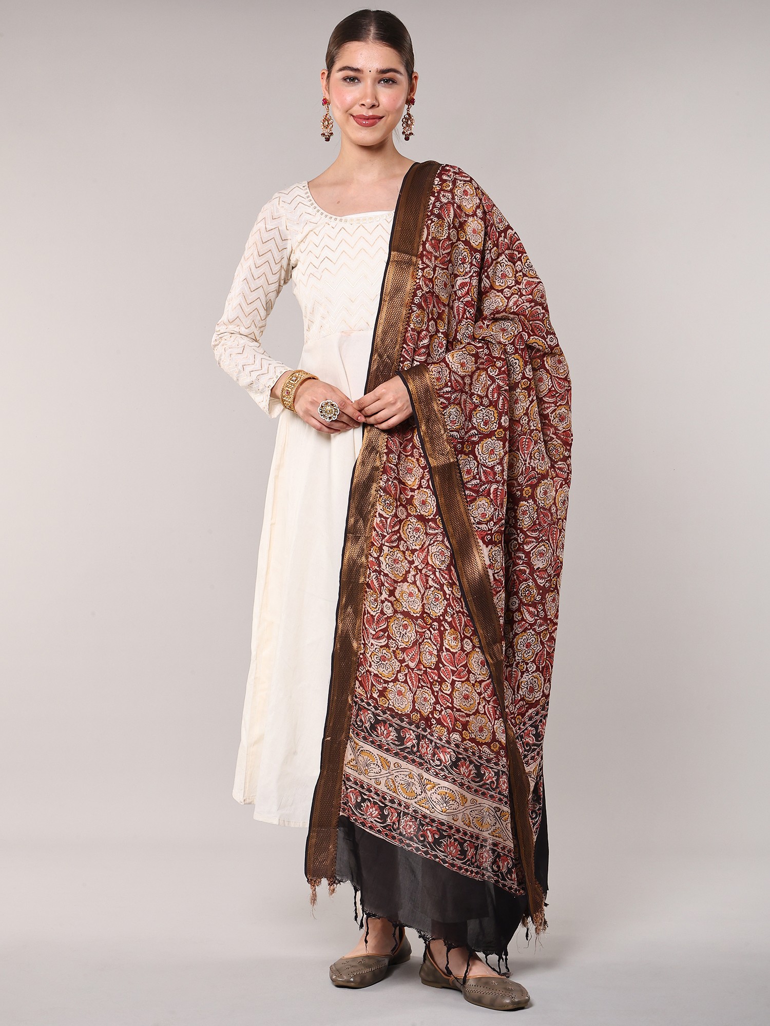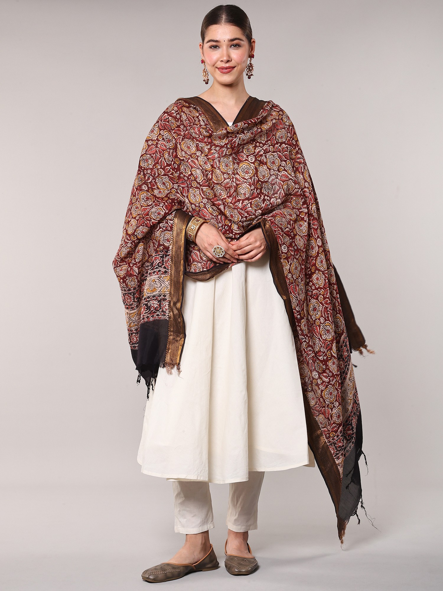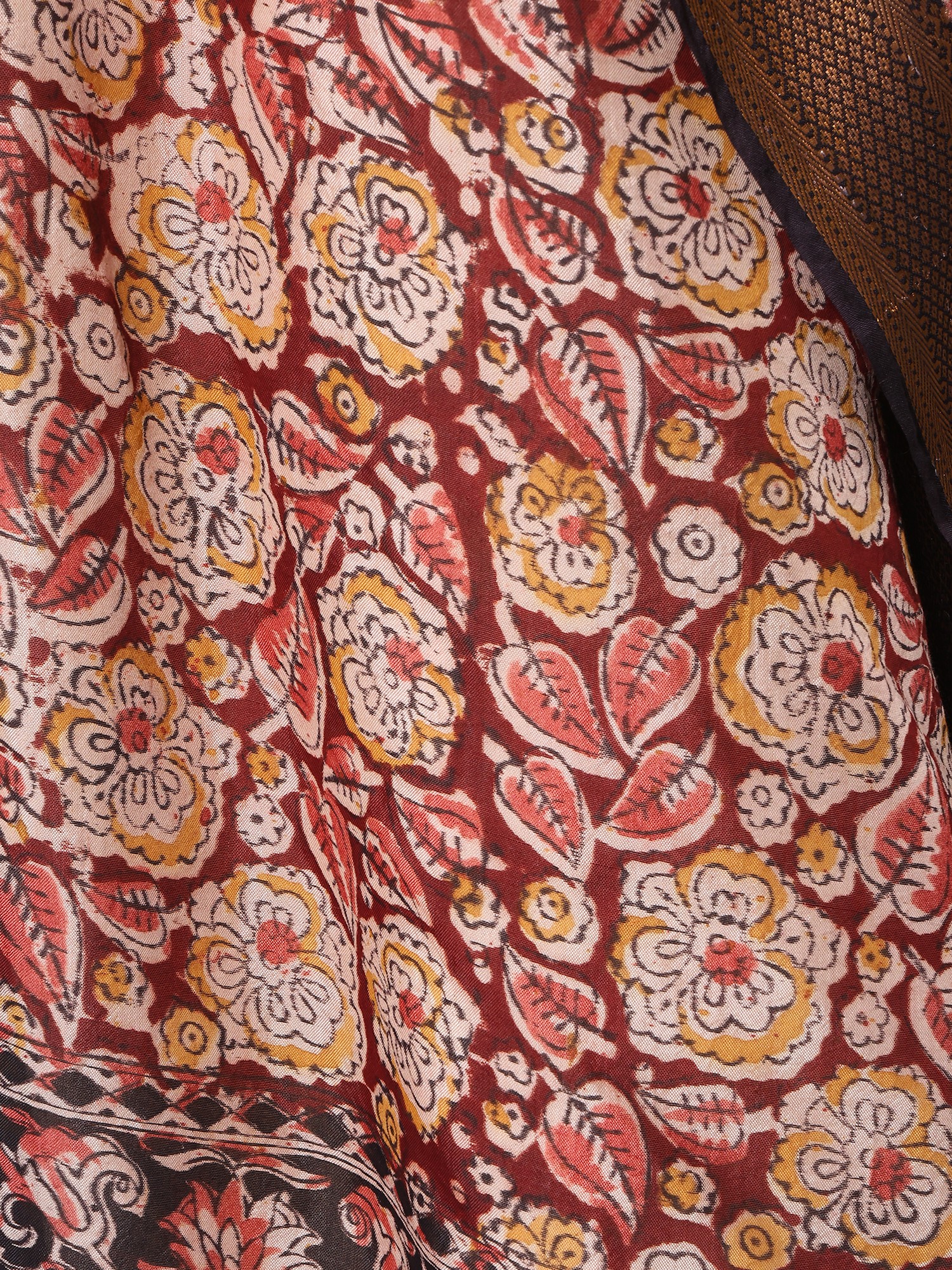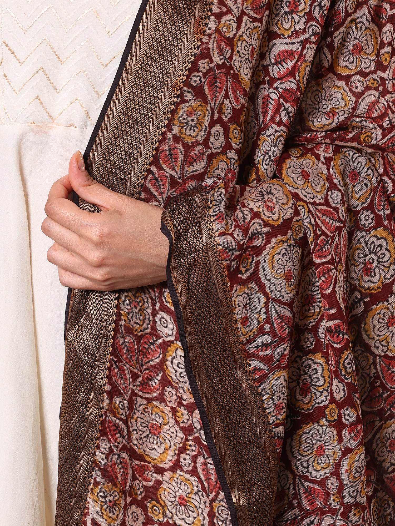 Crafted from luxurious silk, this dupatta drapes beautifully, offering a luxurious feel against the skin. The subtle sheen of the silk enhances the vibrancy of the Kalamkari print, creating a mesmerizing interplay of light and shadow. Adding to its opulent appeal is the elegantly woven zari border. The golden zari thread delicately outlines the dupatta's edges, providing a stunning contrast to the rich red and creating a frame for the exquisite Kalamkari artwork within. The combination of silk and zari makes this dupatta a true masterpiece of textile craftsmanship.