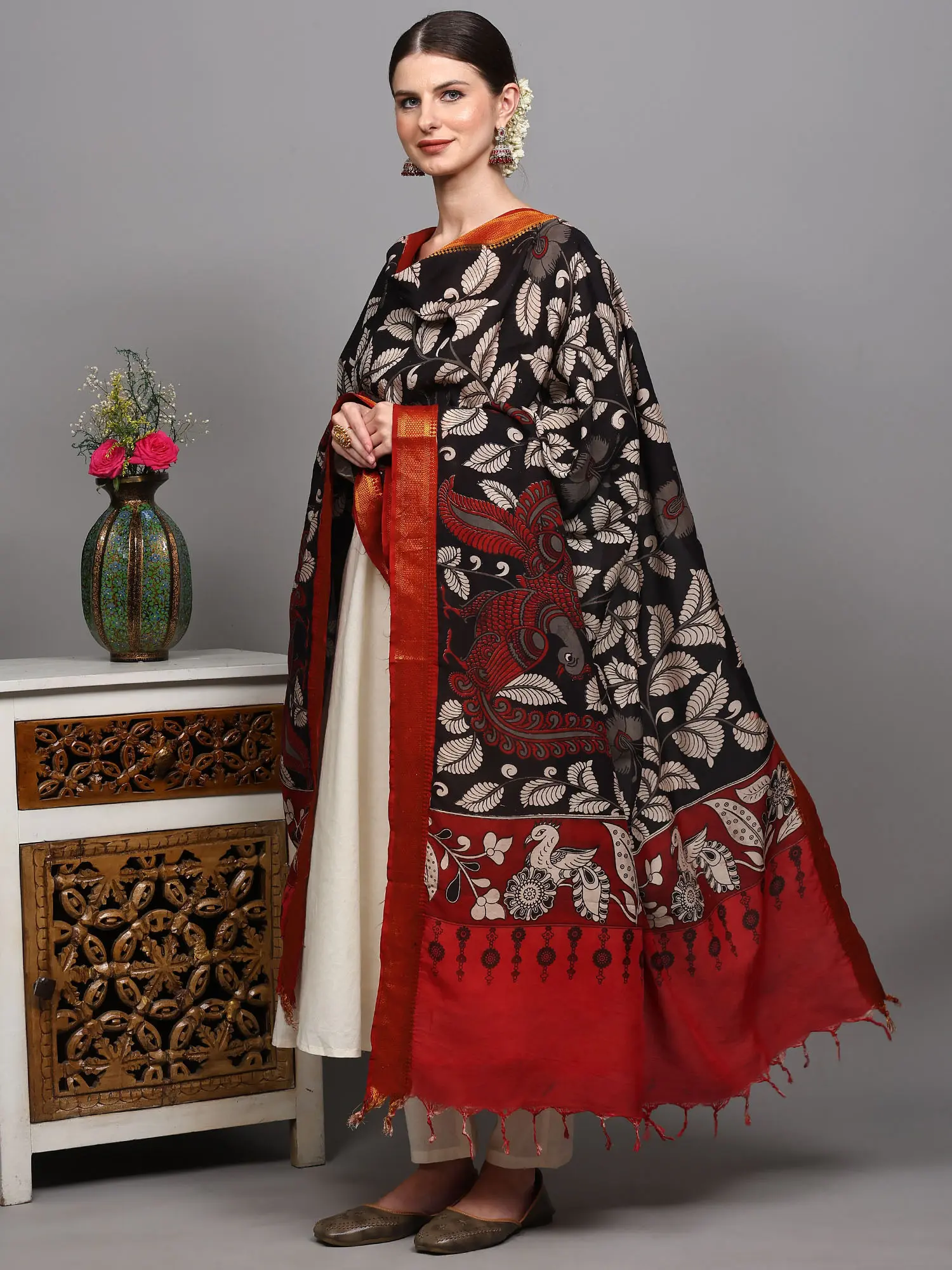 Solitary-Star Kalamkari Aari Embroidered Stole with Printed Flowers from Amritsar