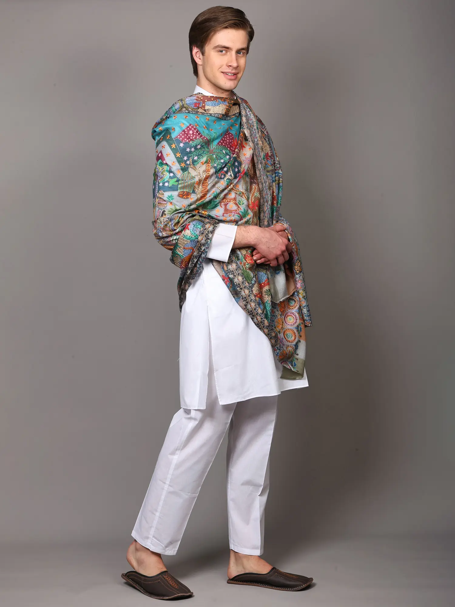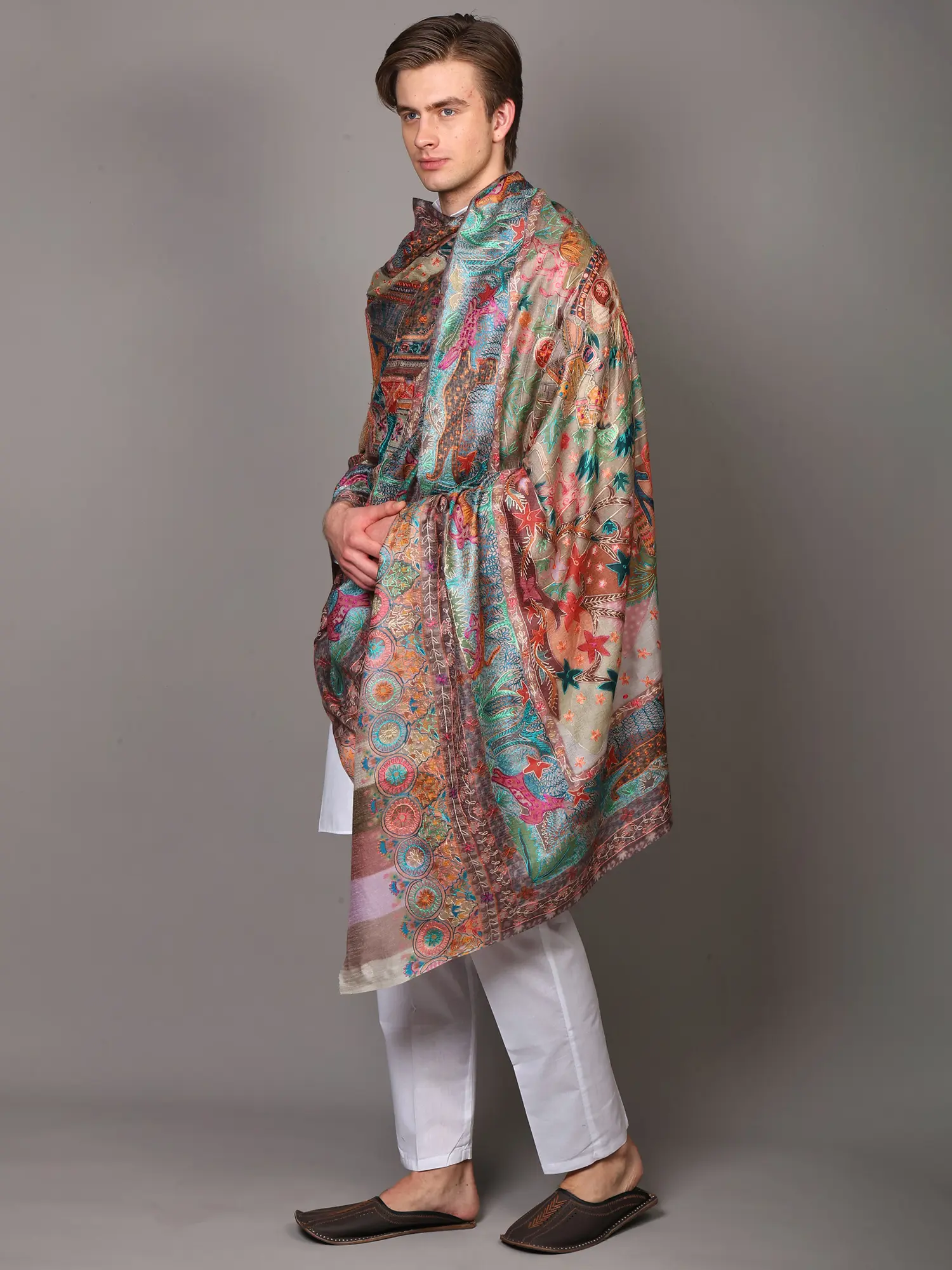 Multicolor Kalamkari Embroidered Shawl with Giant Paisley Motifs