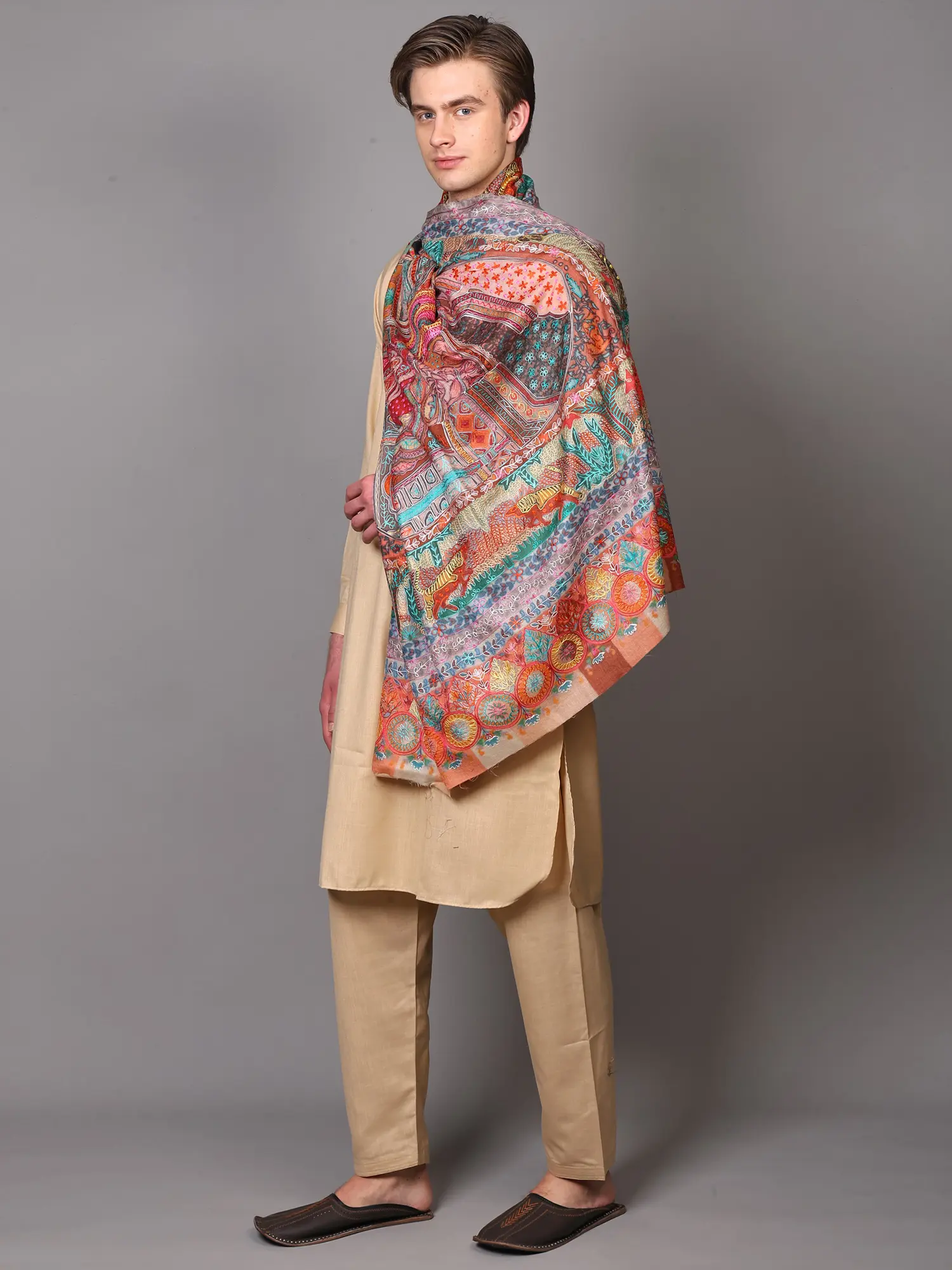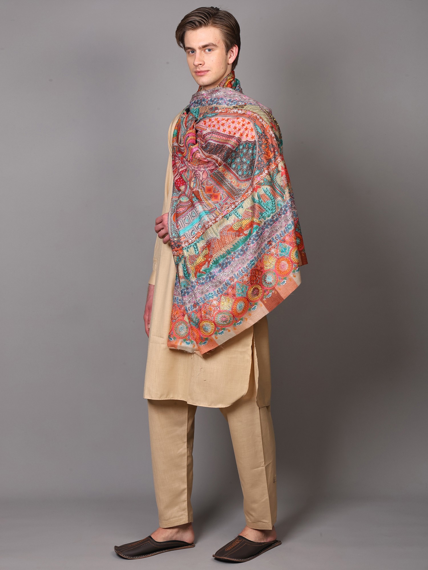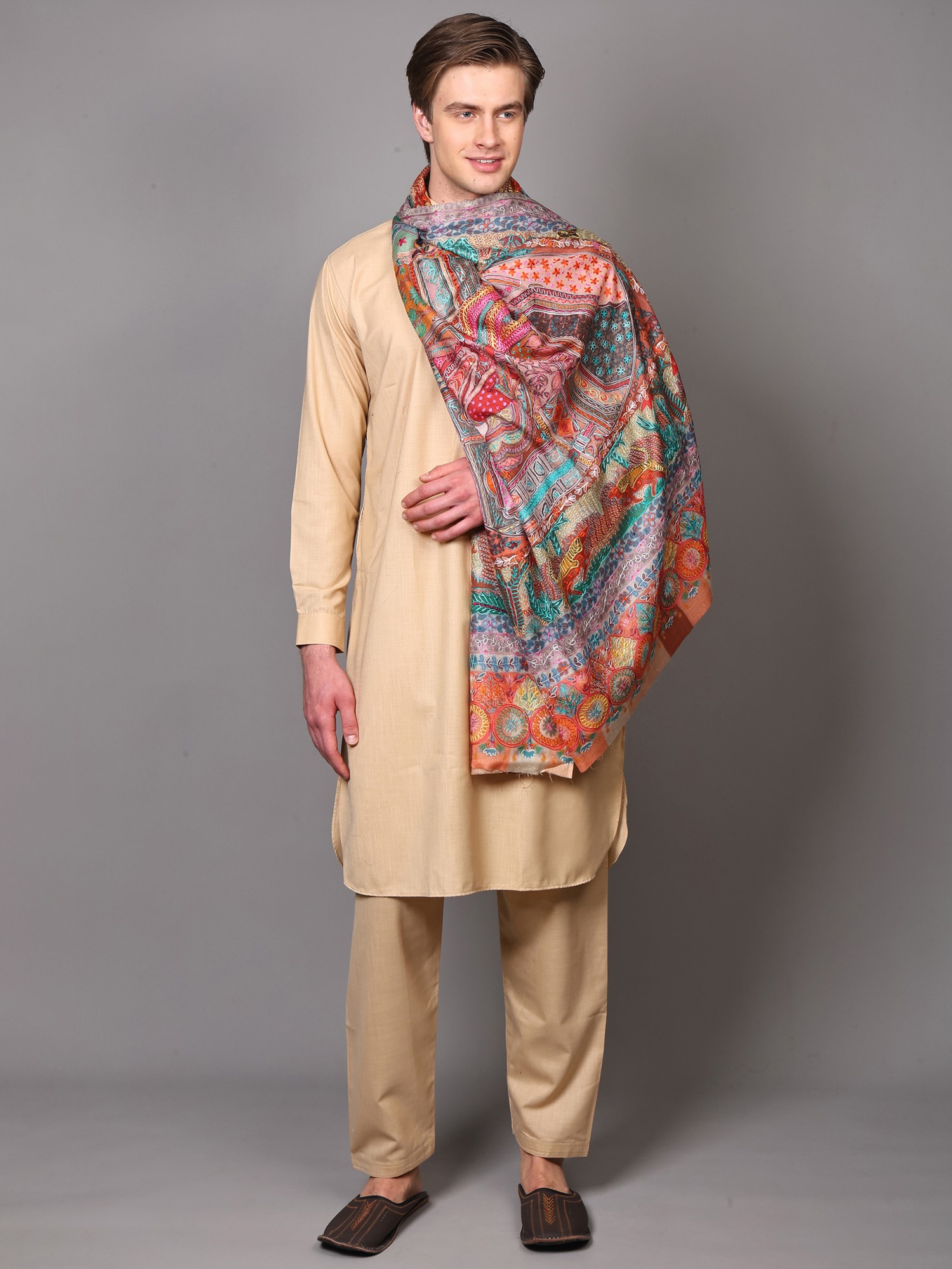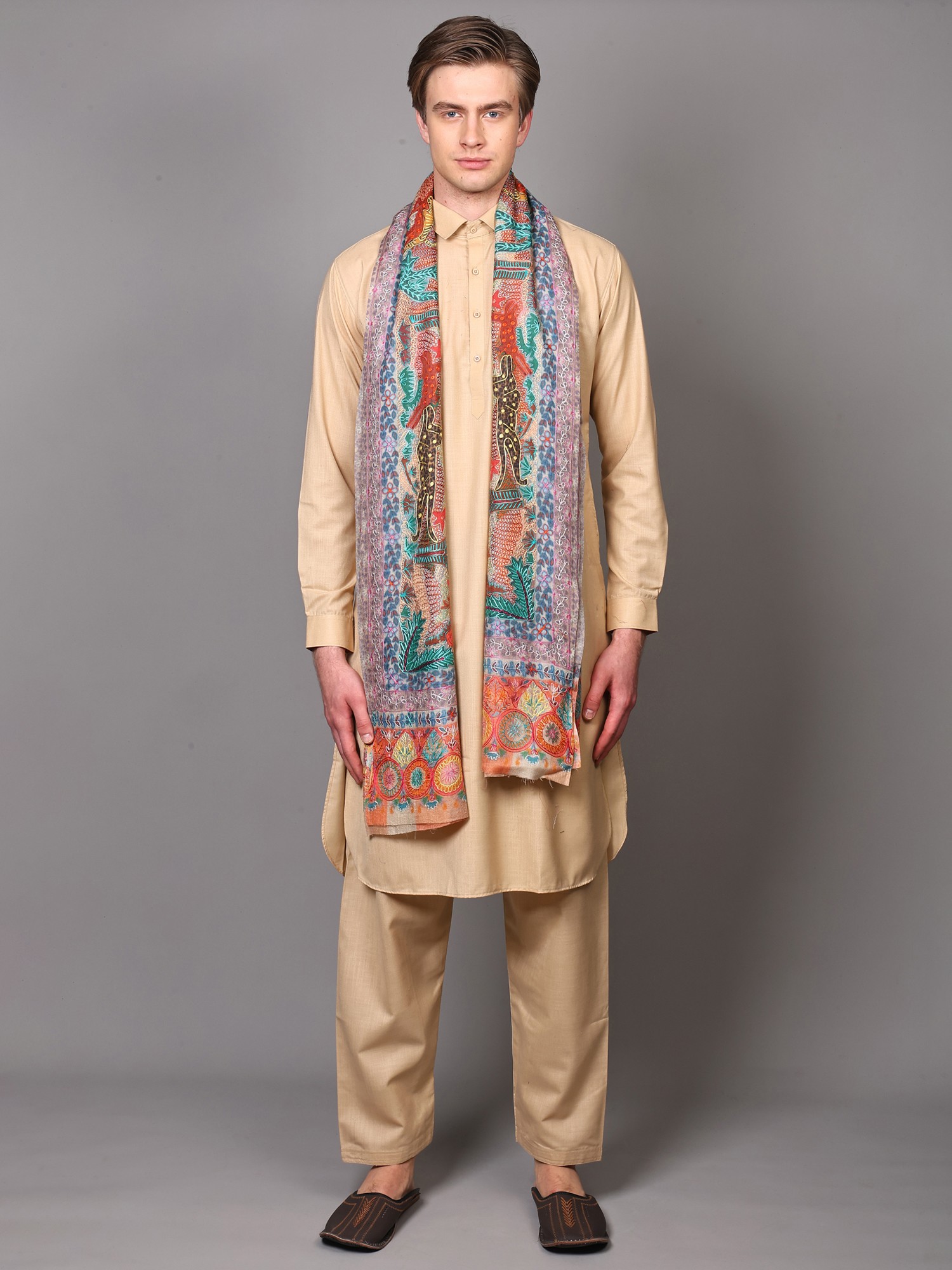 This shawl is designed for the discerning gentleman who appreciates heritage and contemporary style. It effortlessly complements traditional Indian attire, such as kurtas and sherwanis, adding a touch of regal flair. For a more modern aesthetic, it can be layered over simpler outfits, transforming a casual look into something extraordinary. The intricate patterns and rich color palette make it a conversation starter, reflecting a refined taste and an appreciation for craftsmanship. Whether attending a wedding, a cultural event, or simply seeking to add an element of distinguished luxury to your wardrobe, this Kalamkari embroidered shawl is an unparalleled choice. It is a testament to the enduring legacy of Indian artistry and a symbol of enduring style.