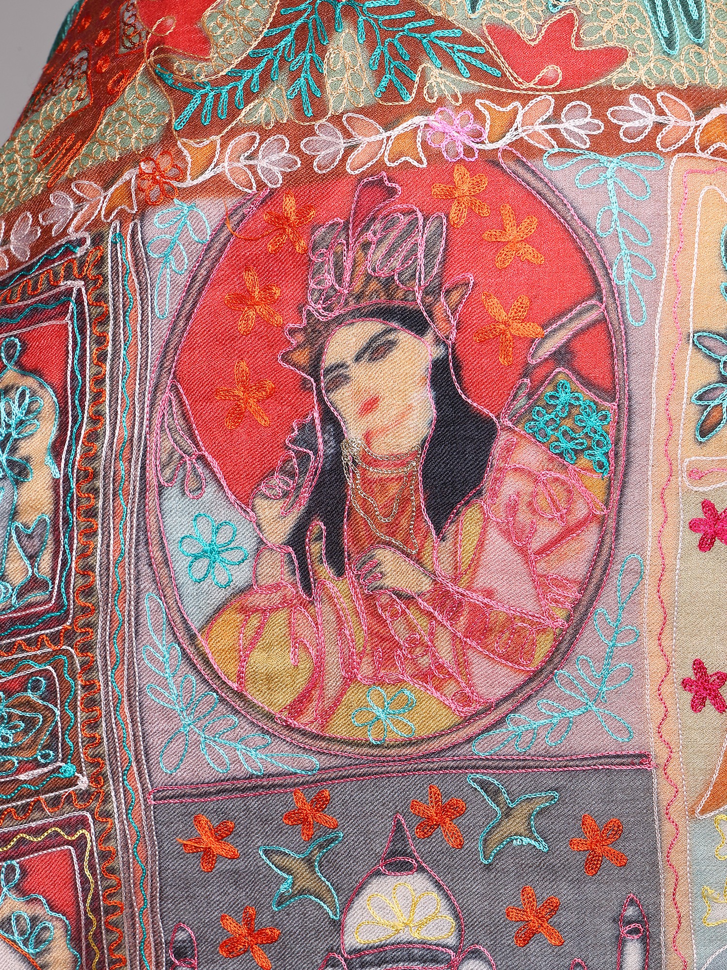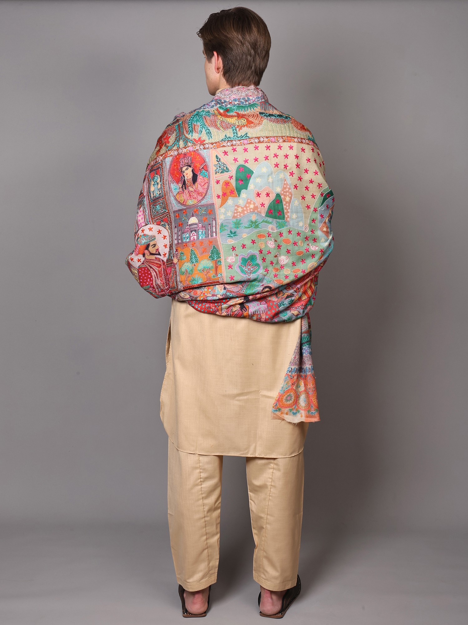 Multicolor Kalamkari Shawl with Aari Embroidery and Giant Paisley Motifs from Amritsar