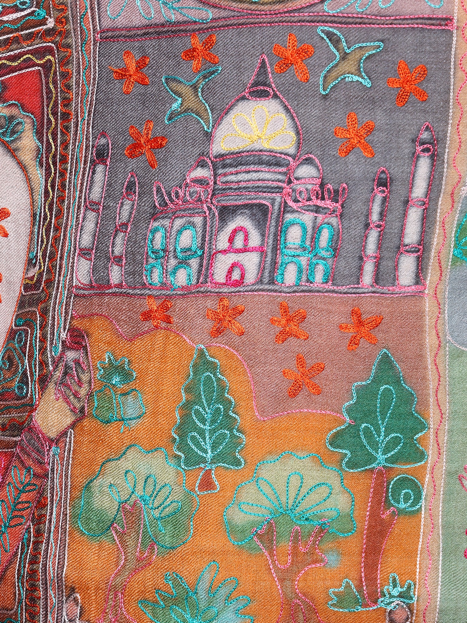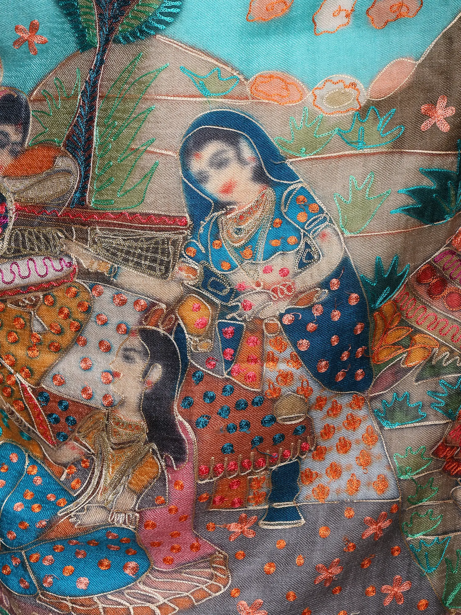 Village Scene Kalamkari Shawl with Chain Stitch Embroidery from Punjab