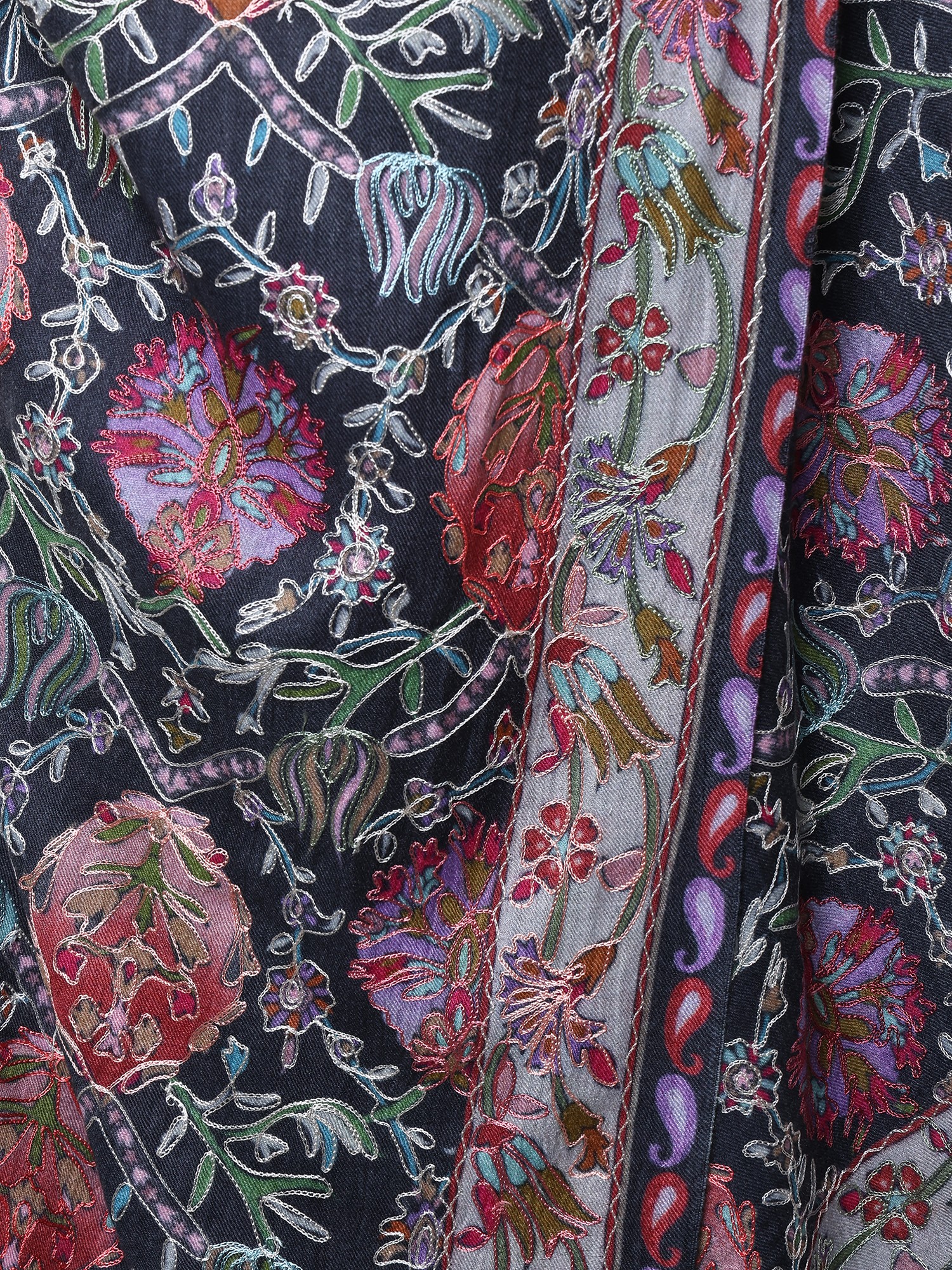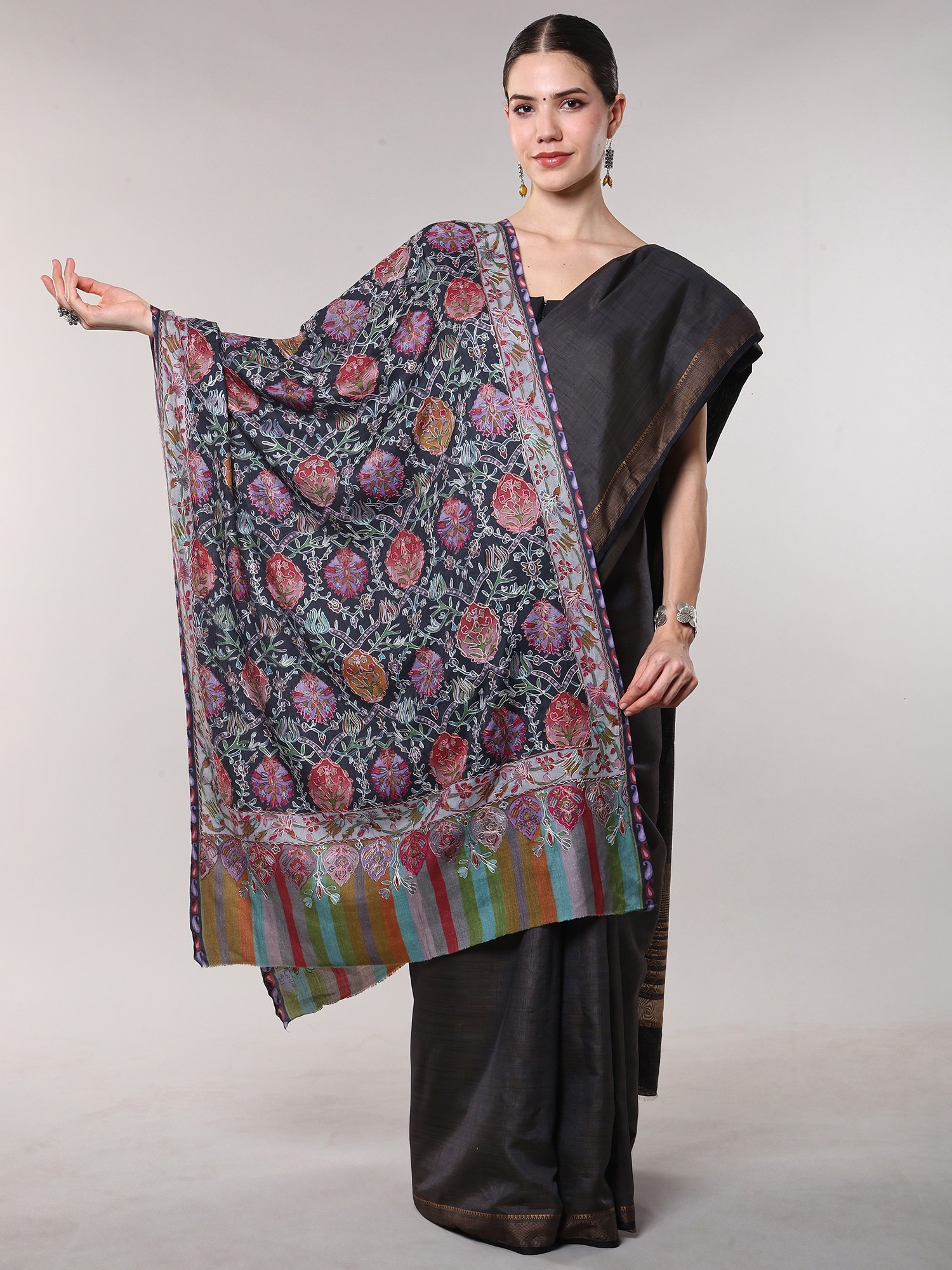 Multicolor Floral Motif Kalamkari Shawl with Chain Stitch Embroidery