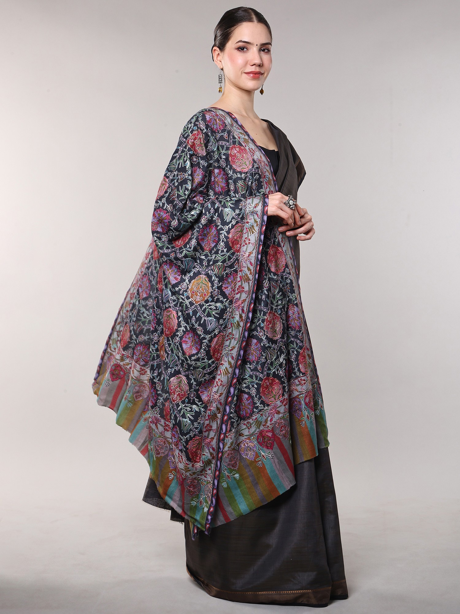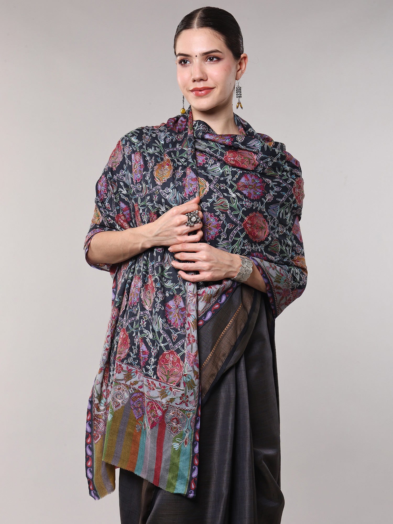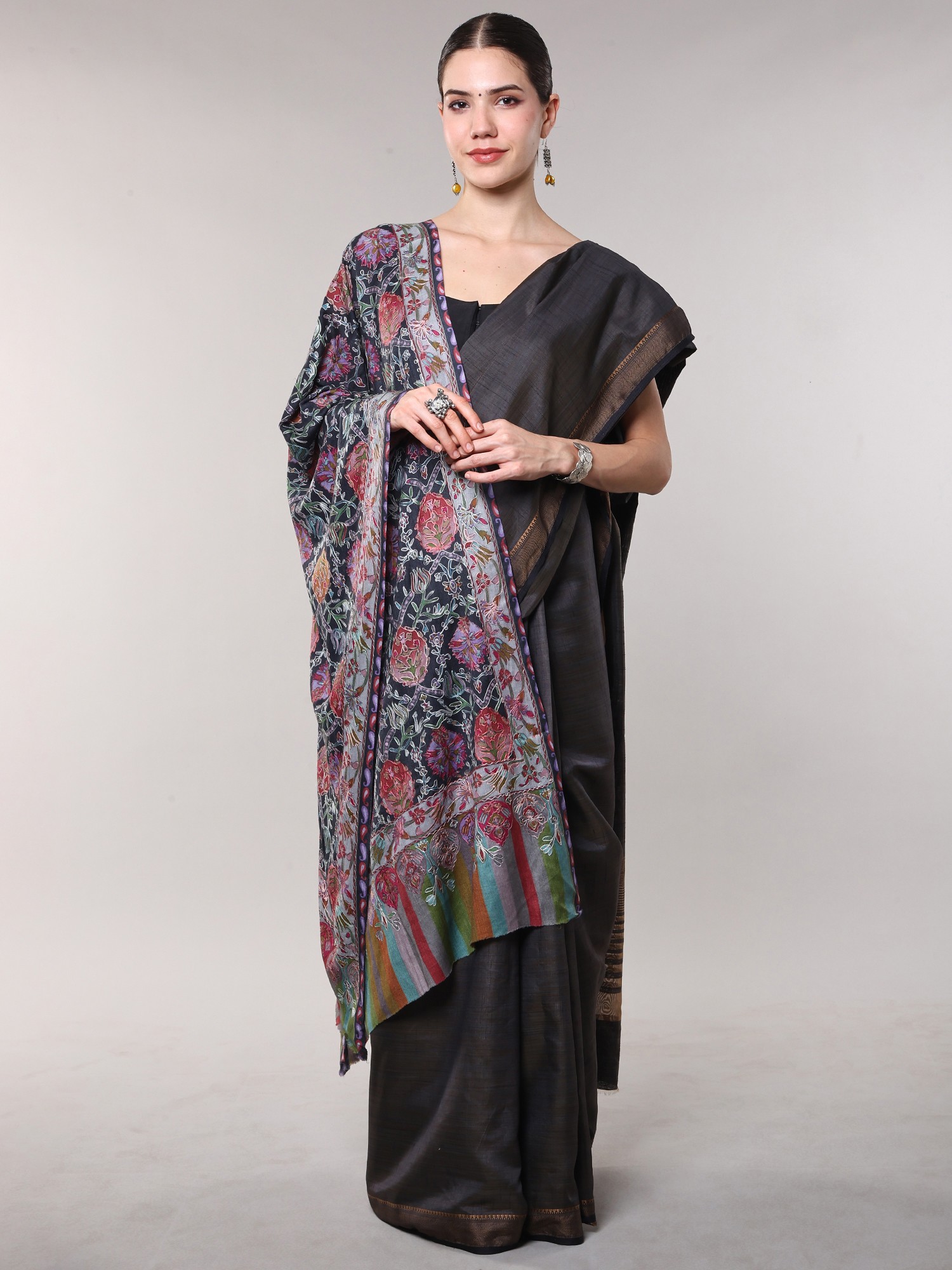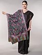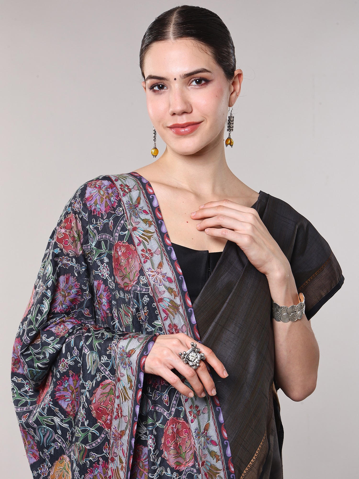 Black-Oyster Kalamkari Shawl with Printed Floral Vines and Chain Stitch Aari Embroidery