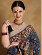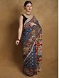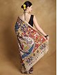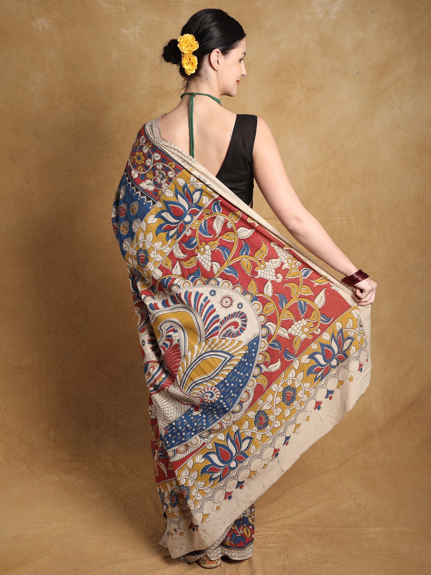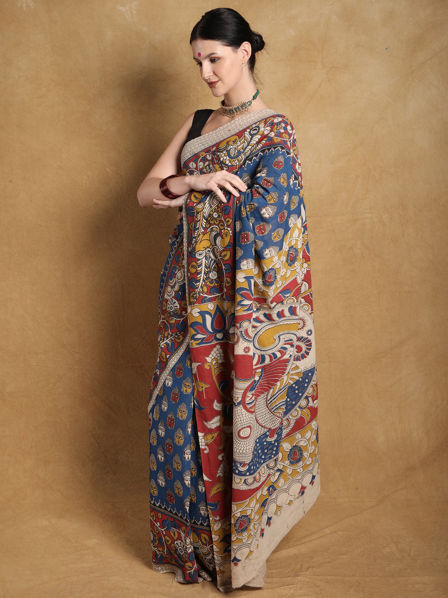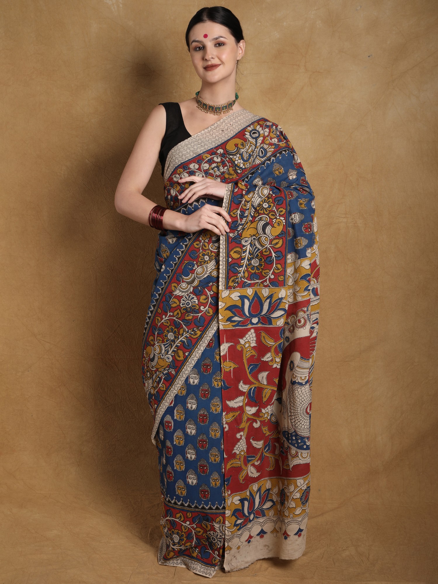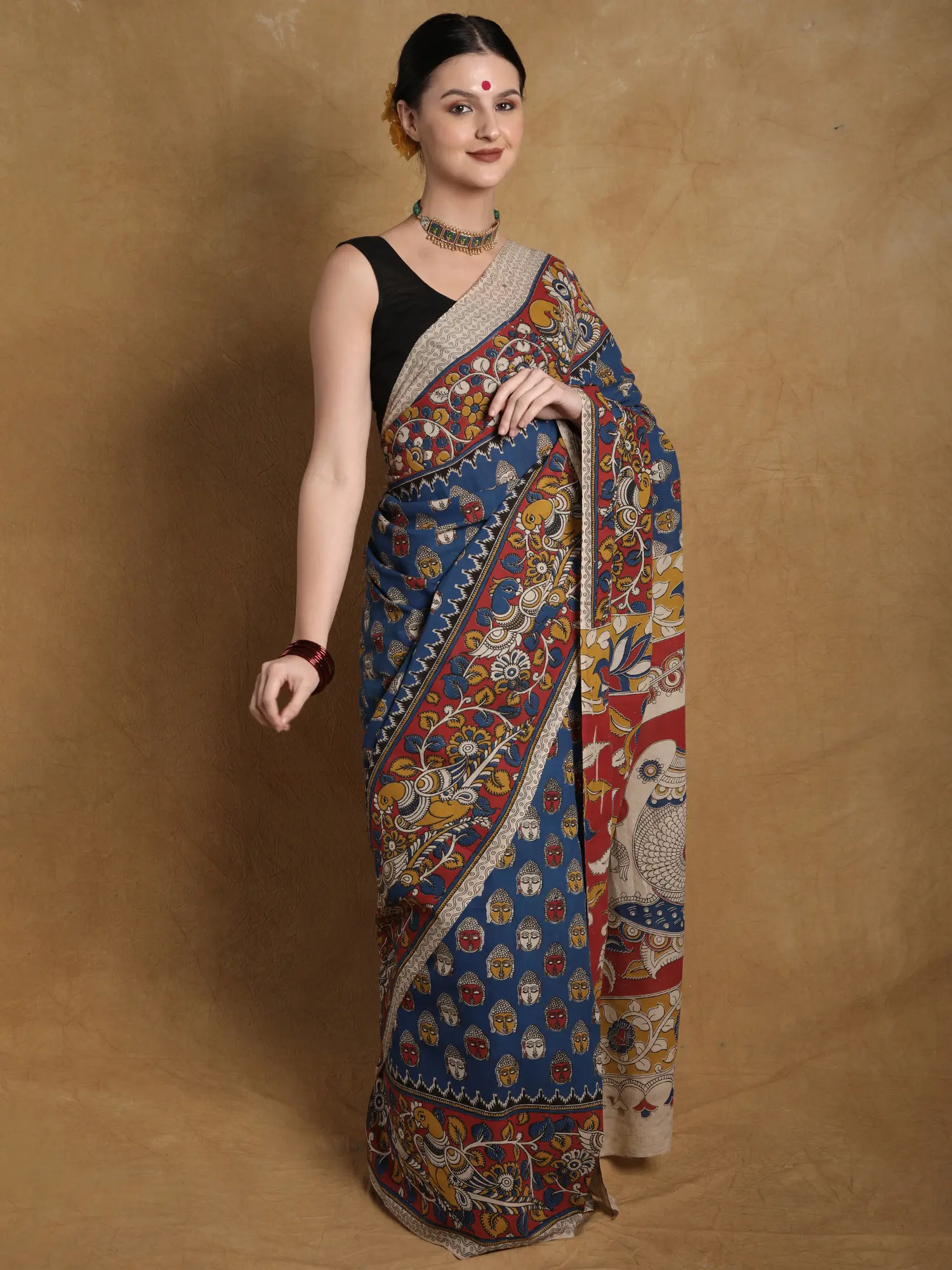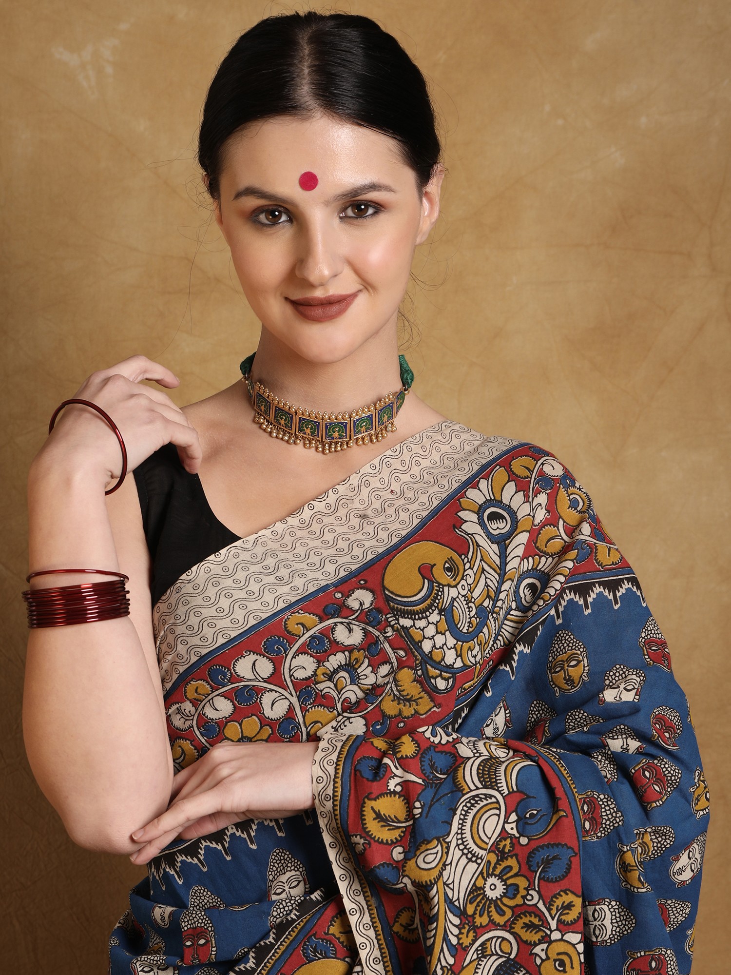 Drape yourself in comfort and culture with this gorgeous pure cotton saree from Telangana, transformed into an aesthetic scroll that exhibits the beauty of traditional Kalamkari painting. Cotton becomes the perfect canvas for the hand-painted patterns on the field of the saree. Buddha heads cover the entire drape, giving it a serene charm, amplified by the beauty of peacocks and floral vines on the border and pallu.