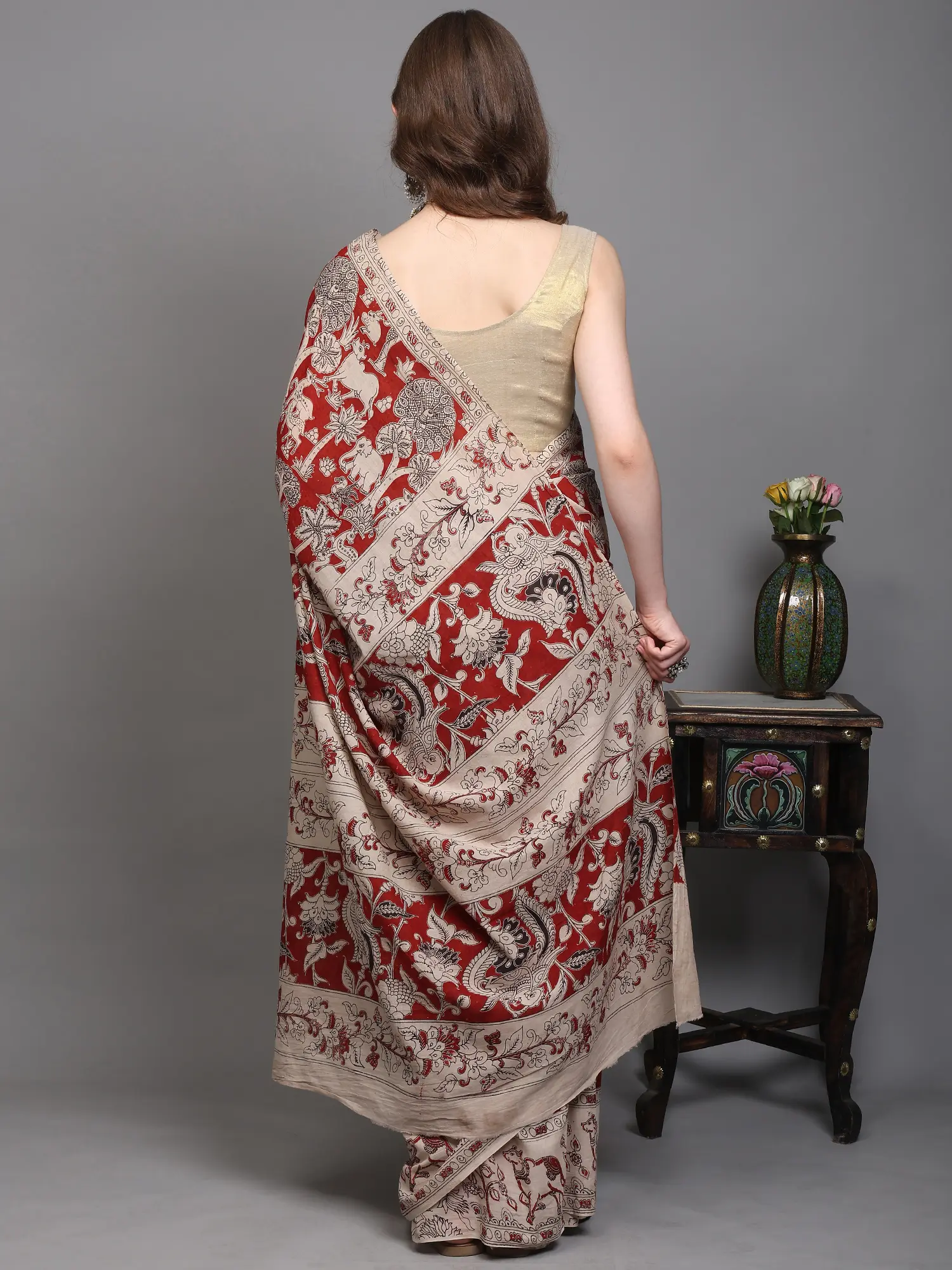 Burnt-Brick Pure Cotton Buddha with Fauna-Flora Printed Kalamkari Saree and Zari Border