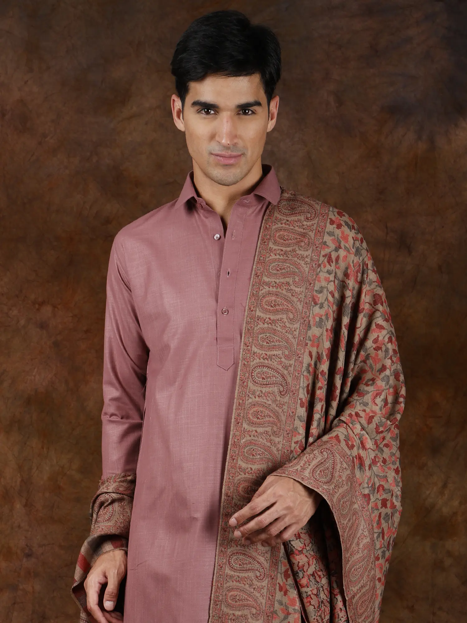 Dusty-Pink Pure Pashmina Sozni Outline Hand-Embroidered Jamawar Kani Border Shawl With Fringe