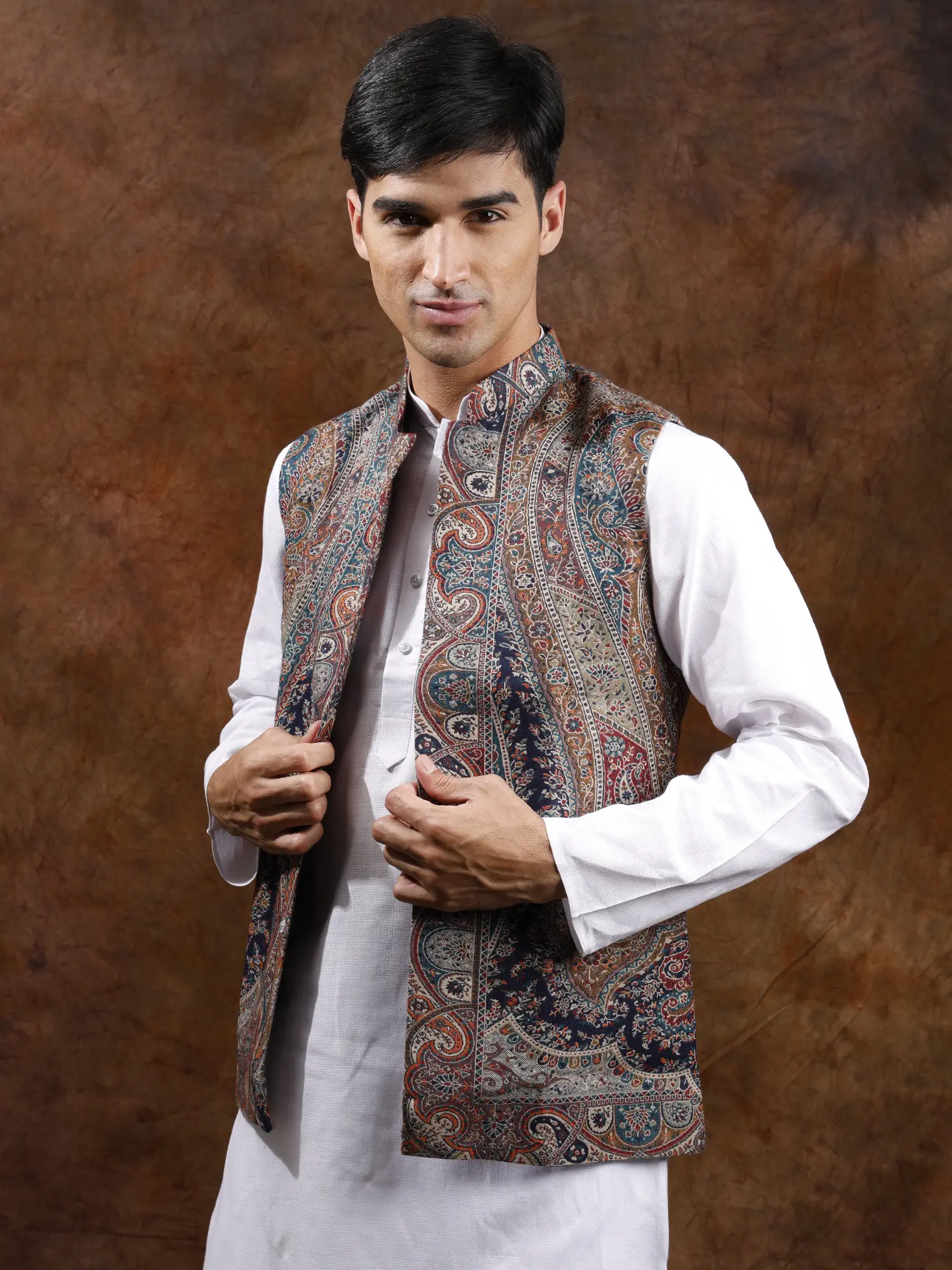 Three-Piece Kurta Pajama Set with Brocaded Front Open Waistcoat