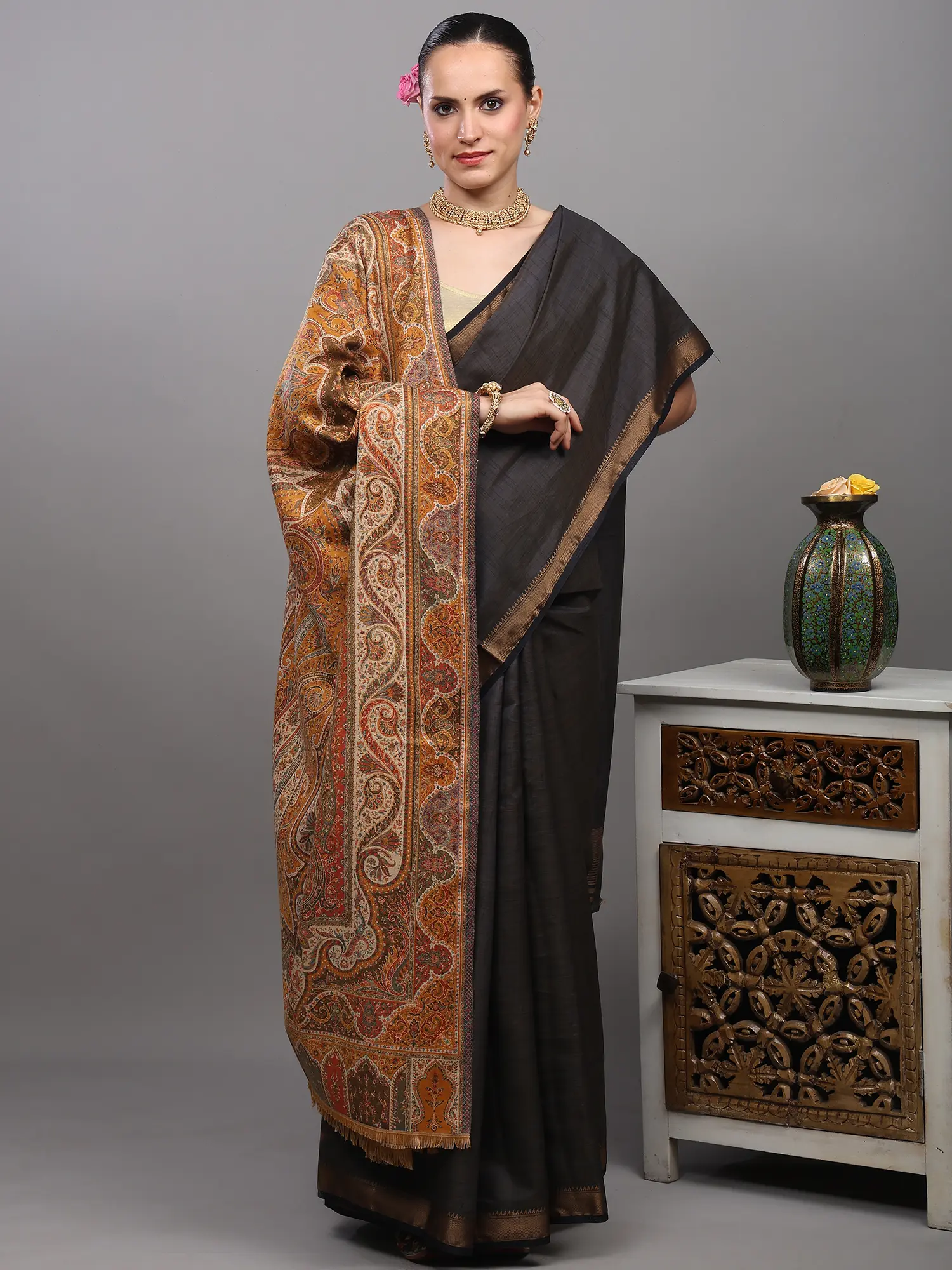 Black-Onyx Kani Jamawar Shawl from Amritsar with Woven Floral Jaal and Paisleys