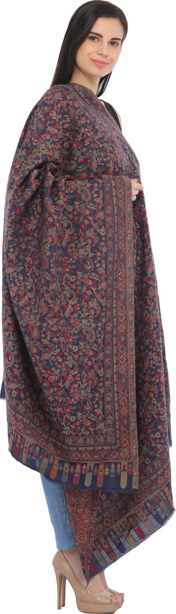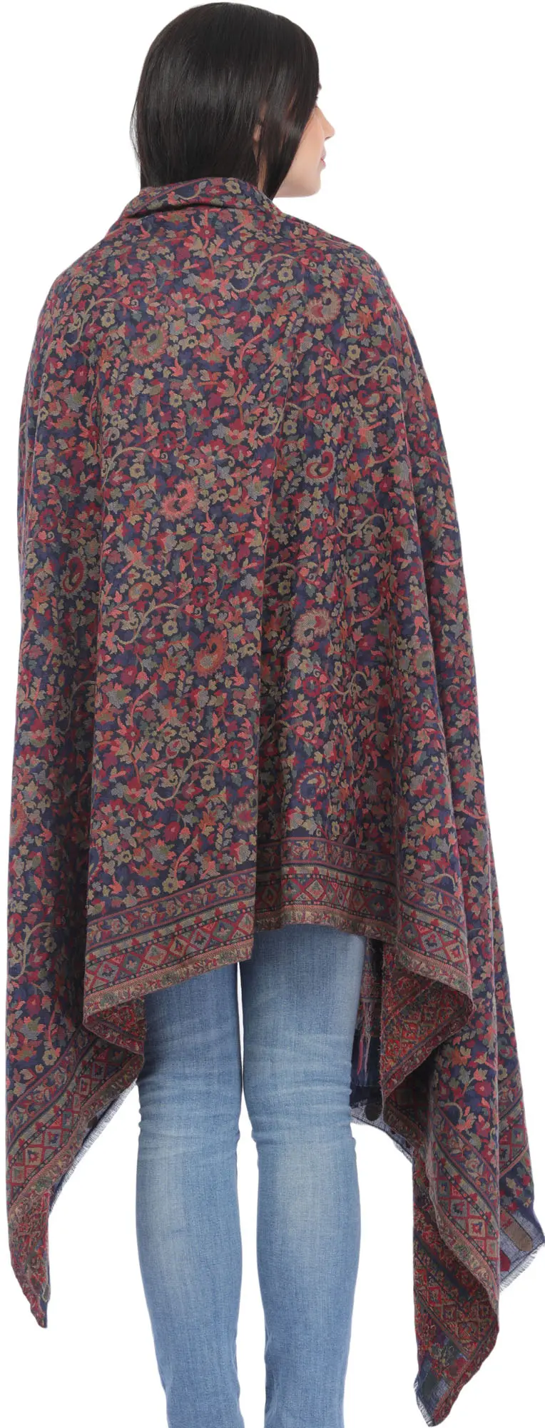 Indulge in the artistry of traditional craftsmanship with this exquisite Kani Jamawar shawl. Woven from a luxurious blend of cotton and wool, this piece offers a sophisticated drape and a comforting warmth, making it a versatile addition to any wardrobe. The deep, rich navy blue base serves as a canvas for a breathtaking floral weave, meticulously detailed with an array of vibrant colors, including deep reds, earthy greens, and subtle hints of gold and rust.