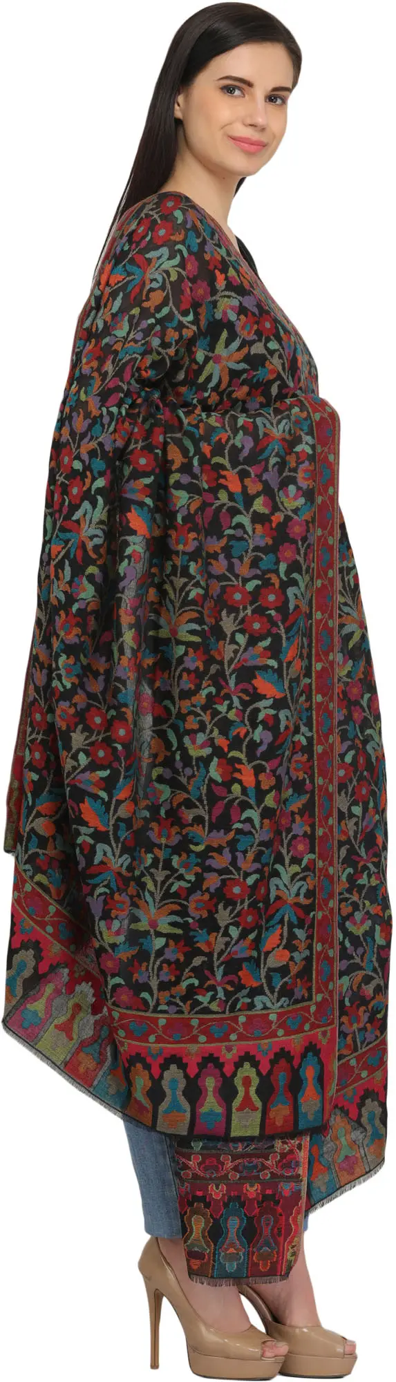 Black-Onyx Kani Jamawar Shawl from Amritsar with Woven Floral Jaal and Paisleys