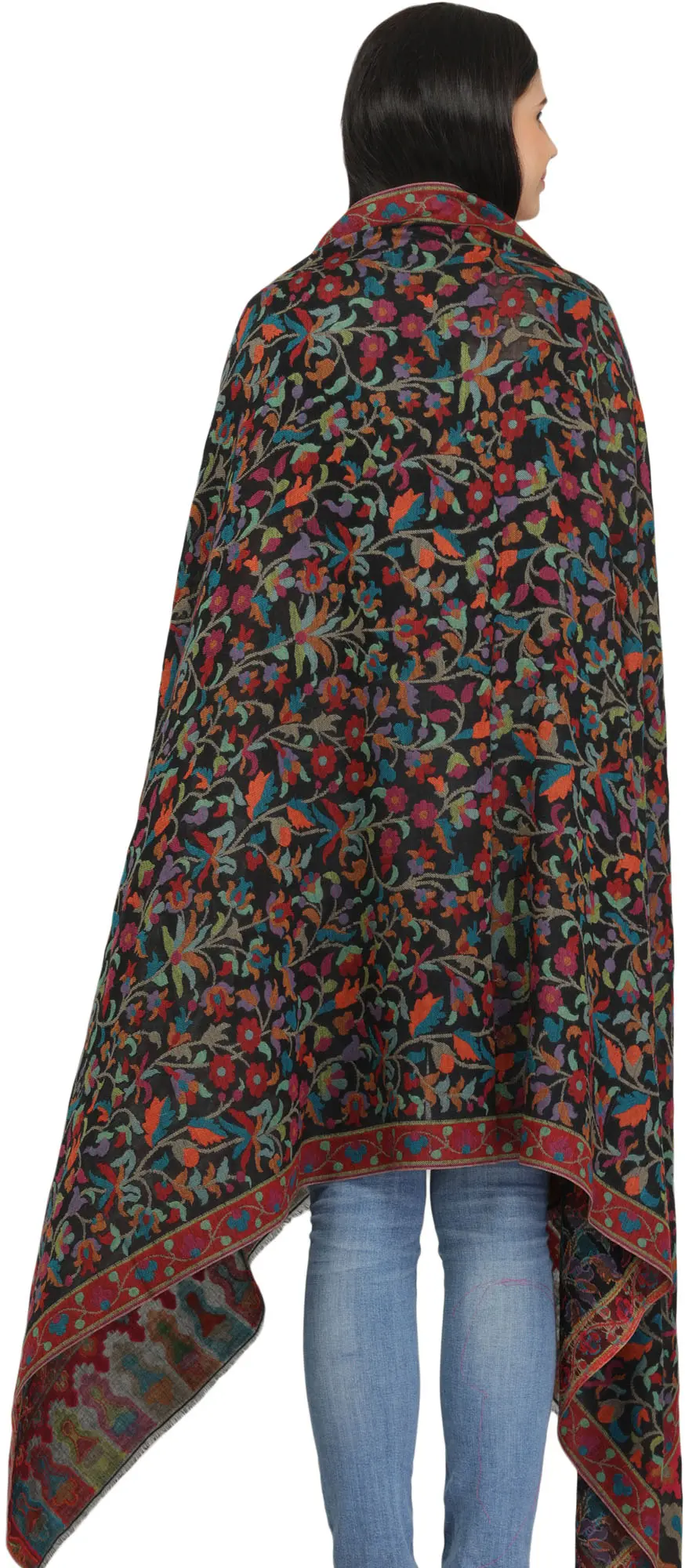 Black-Iris Cashmere Shawl from Amritsar with Kani Woven Multicolor Flowers and Paisleys