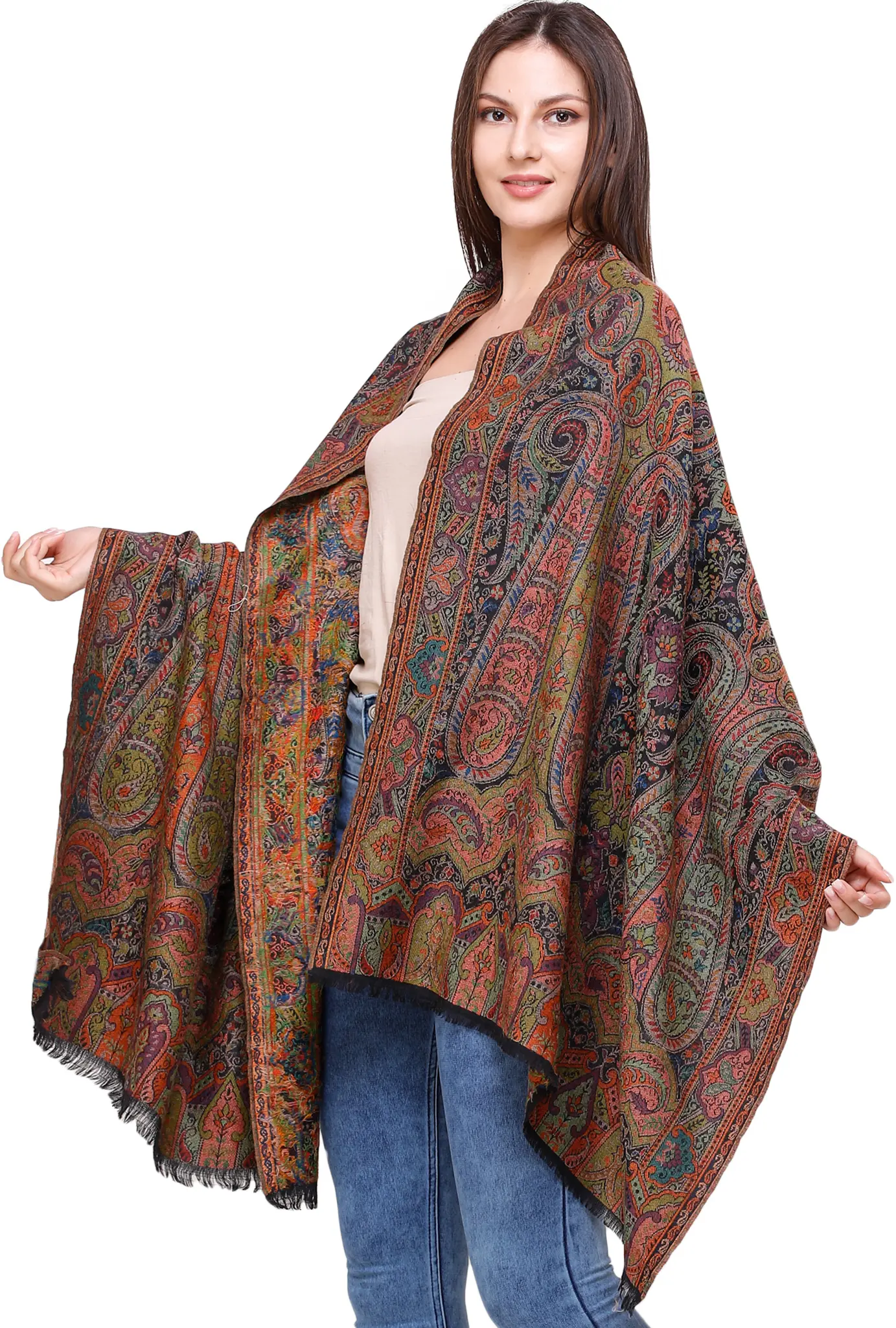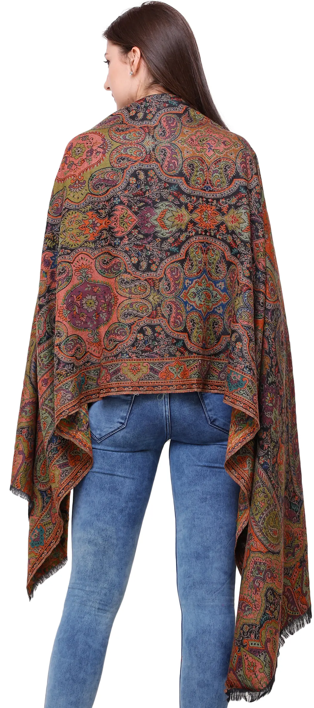 The defining feature of this shawl is its breathtaking Jamawar pattern, meticulously woven with multicolor threads. Swirling paisleys, reminiscent of teardrop-shaped leaves, interlace with delicate floral motifs, creating a mesmerizing dance of color and form. Shades of deep crimson, verdant green, rich orange, and vibrant blues are intricately blended, evoking the opulence of an exotic garden in full bloom. The subtle interplay of these hues creates a depth and dimension that draws the eye, making each viewing a new discovery of hidden details and masterful shading. The edges of the shawl are finished with a fine fringe, adding a delicate movement and an extra touch of sophistication.