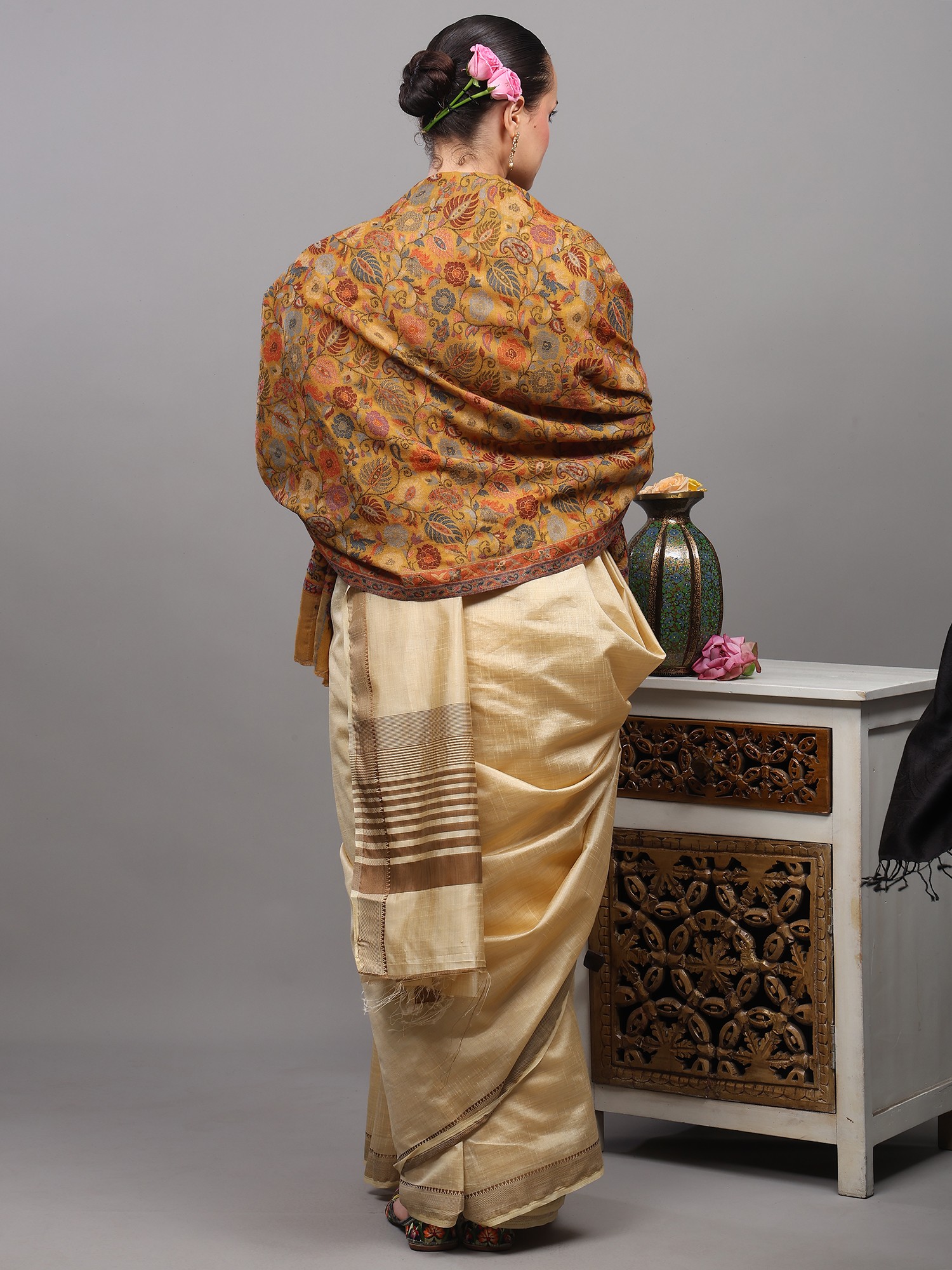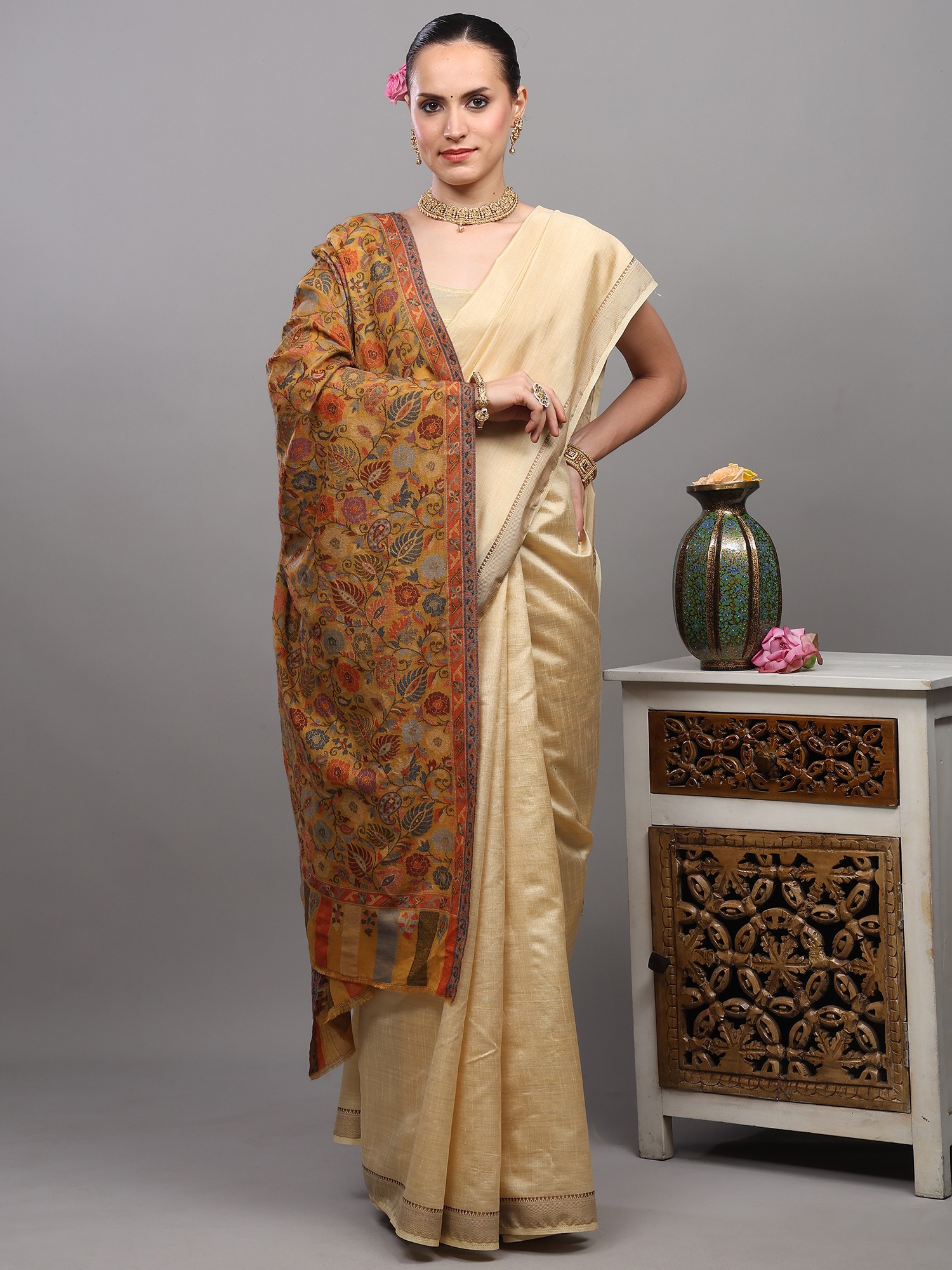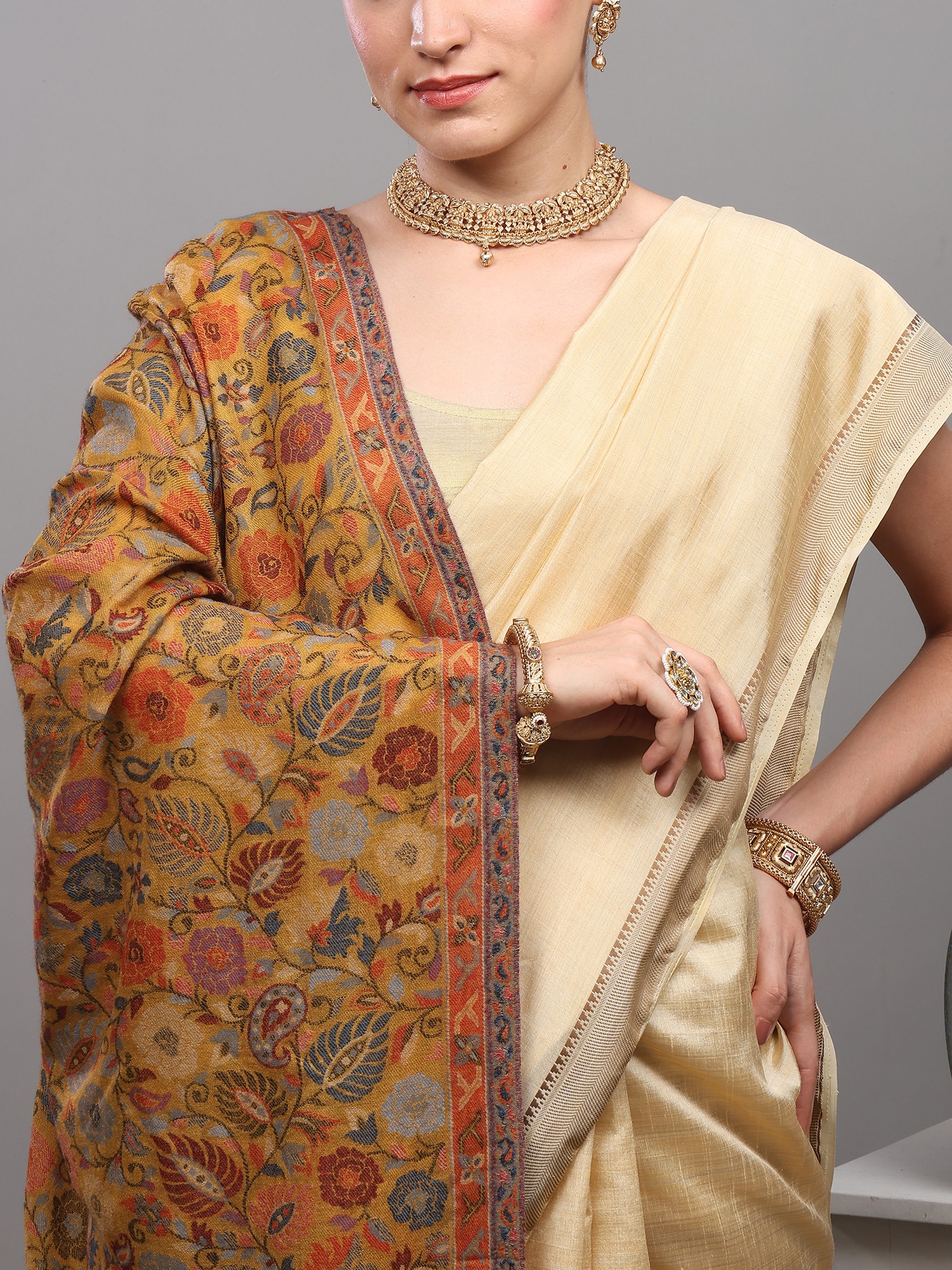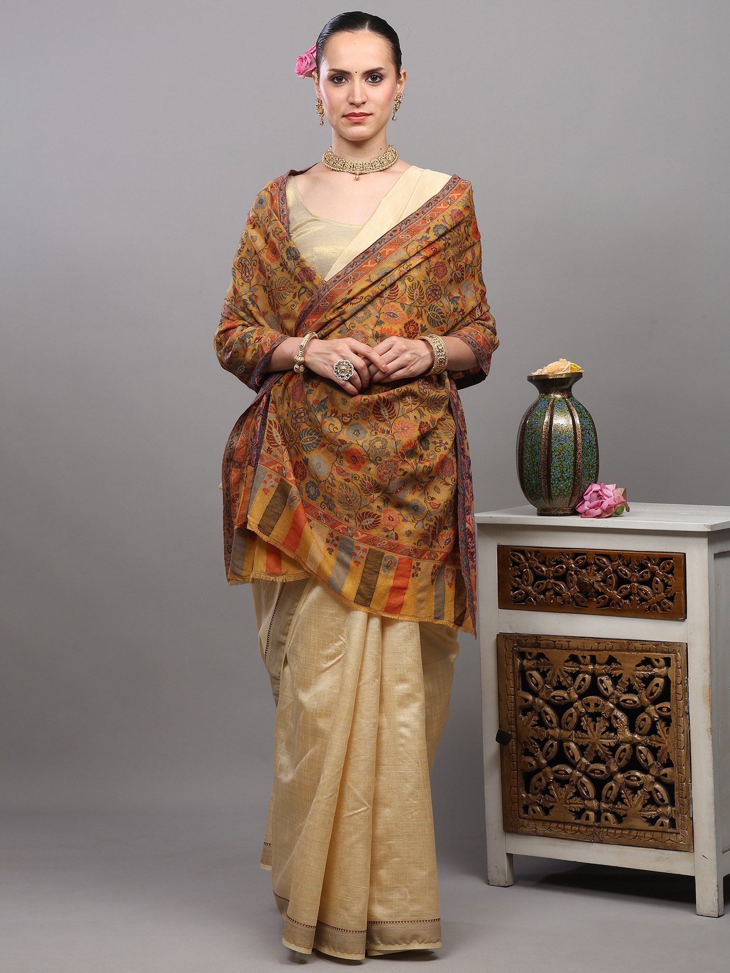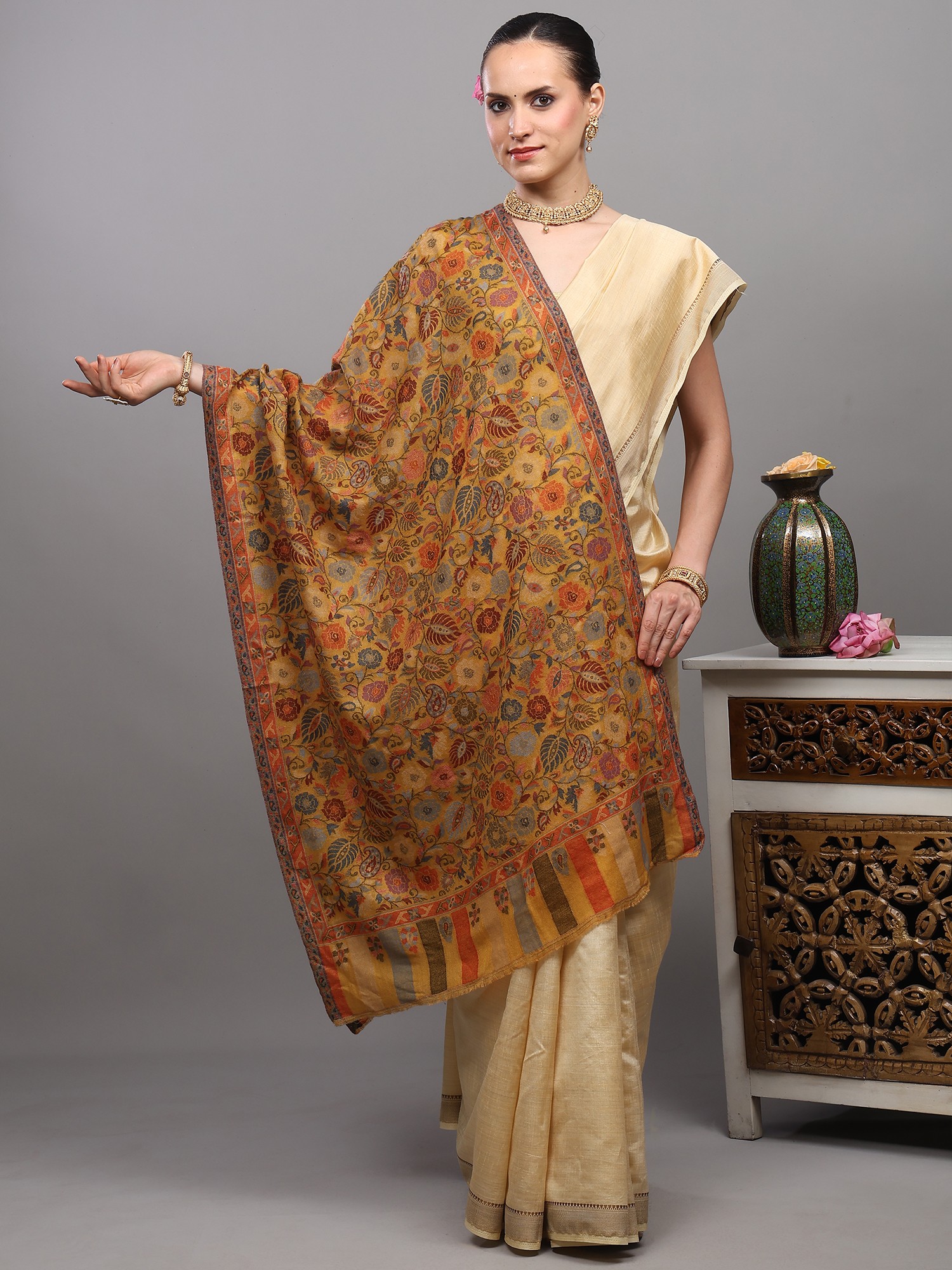 An ancestral-looking piece, worked on by expertise keeping patience and focus on every twisting and turning of the needle, this remarkable Kani jamawar stole lets you relish various different color options. Made with genuine pure wool, this gorgeous piece emits songs of beauty and charm that can be seen through the delicate detailing of floral wines of multi-colored motifs.