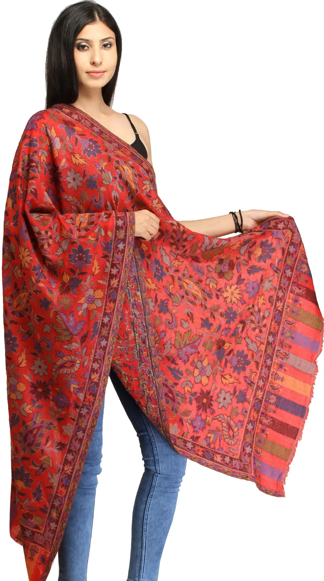 Discover the exquisite craftsmanship of this Kani Jamawar stole, a testament to traditional artistry and luxurious comfort. Woven from the finest pure wool, this piece offers unparalleled softness and warmth, making it a perfect accessory for any season. The rich red hue serves as a vibrant canvas for an intricate tapestry of woven flowers, showcasing a mesmerizing floral pattern that evokes the beauty of a blooming garden. Each bloom and leaf is meticulously rendered, creating a visual symphony that is both captivating and sophisticated.