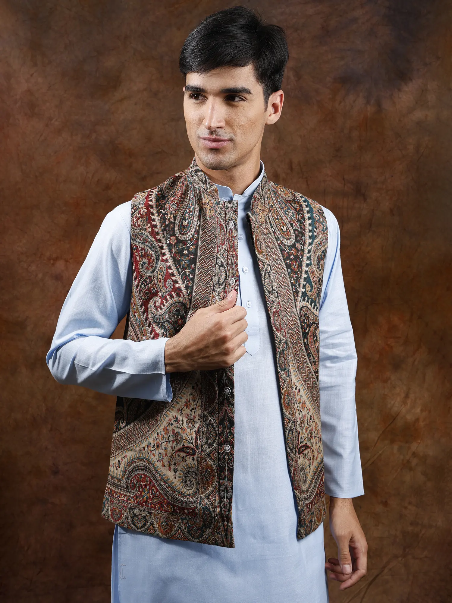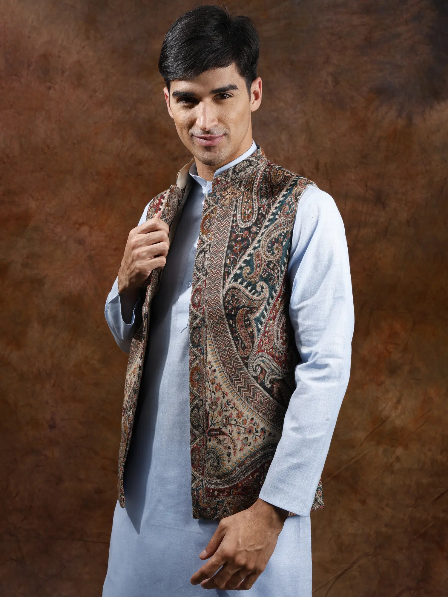 Crystal-Rose Art Silk Ethnic Nehru Jacket Waistcoat with Multicolor Floral Silk Embroidery and Sequin Work