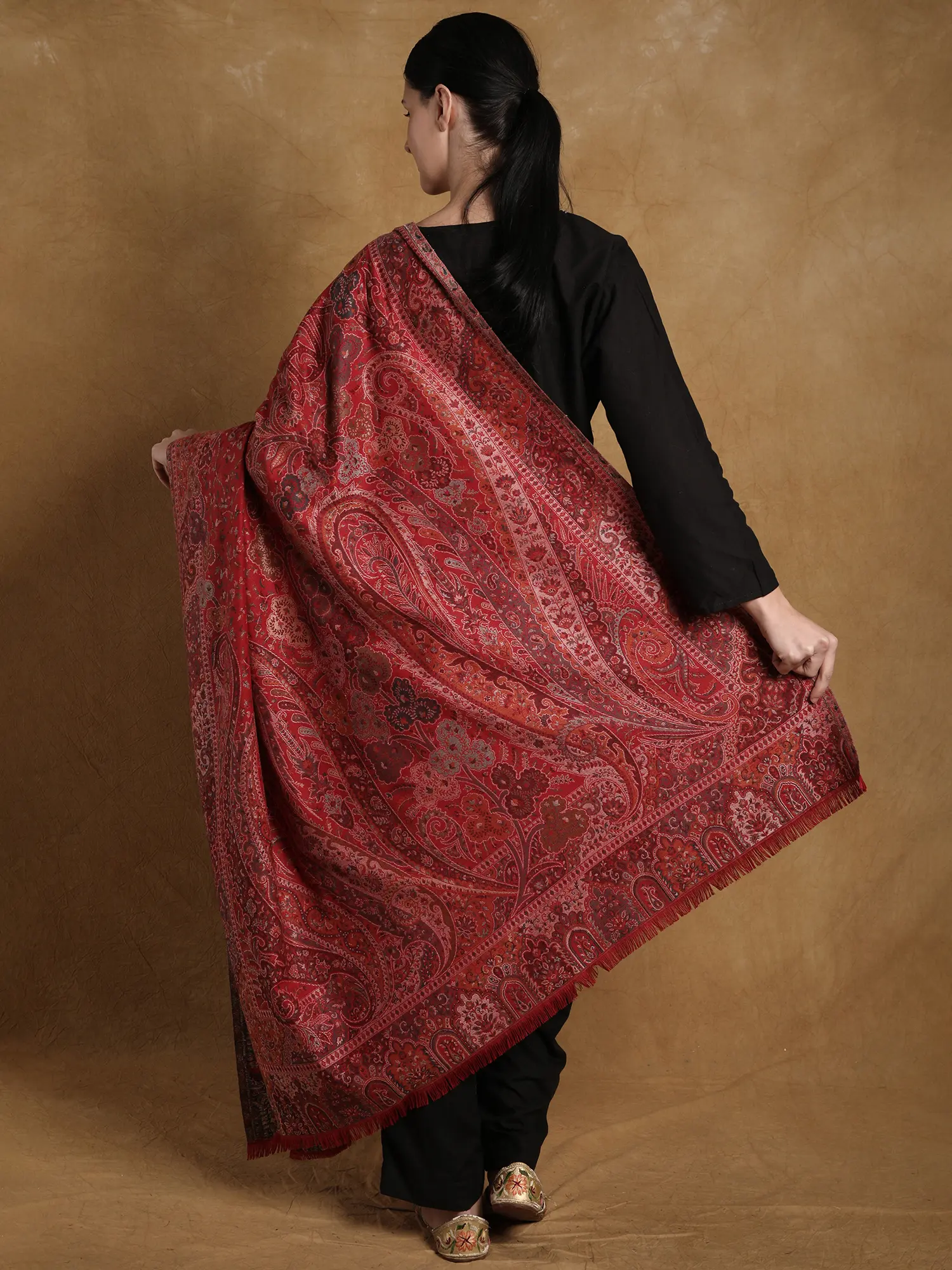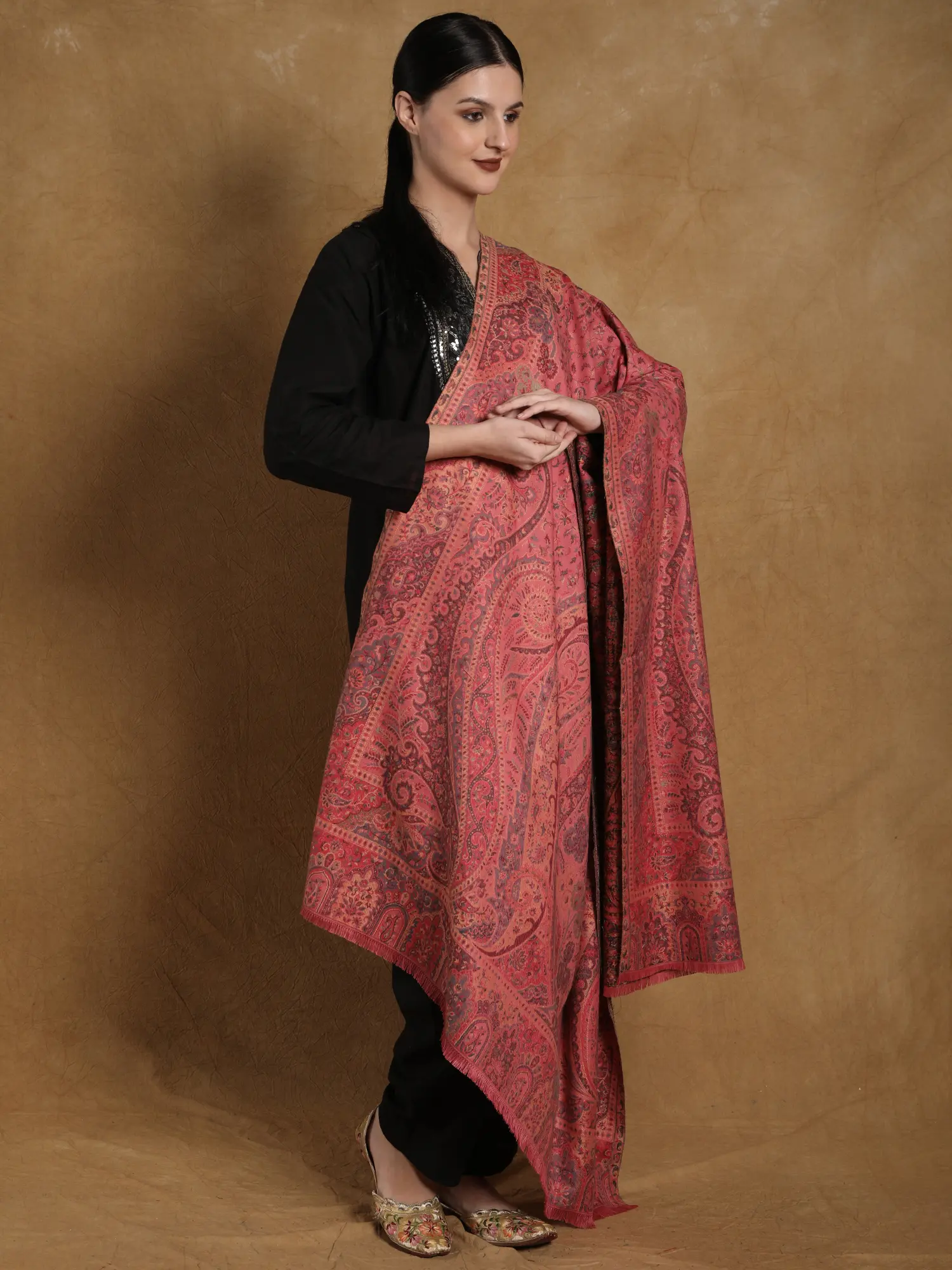This “Amritsar-made Kani Jamawar Wool Shawl” is a tribute to exceptional craftsmanship and eternal beauty. Sprawled across its opulent fabric are vivid, colorful weaved flowers, each whispering a narrative of tradition and artistic mastery.