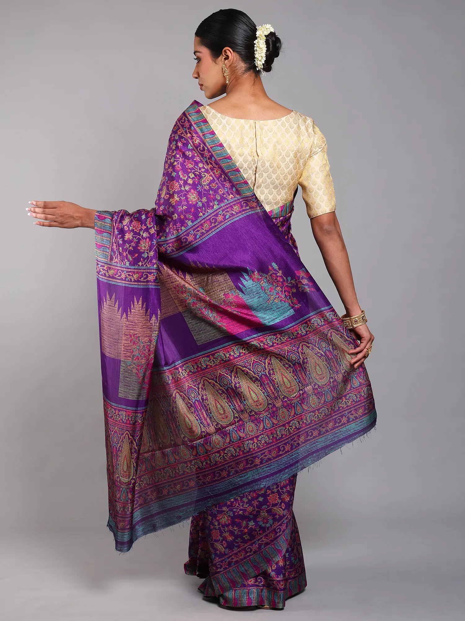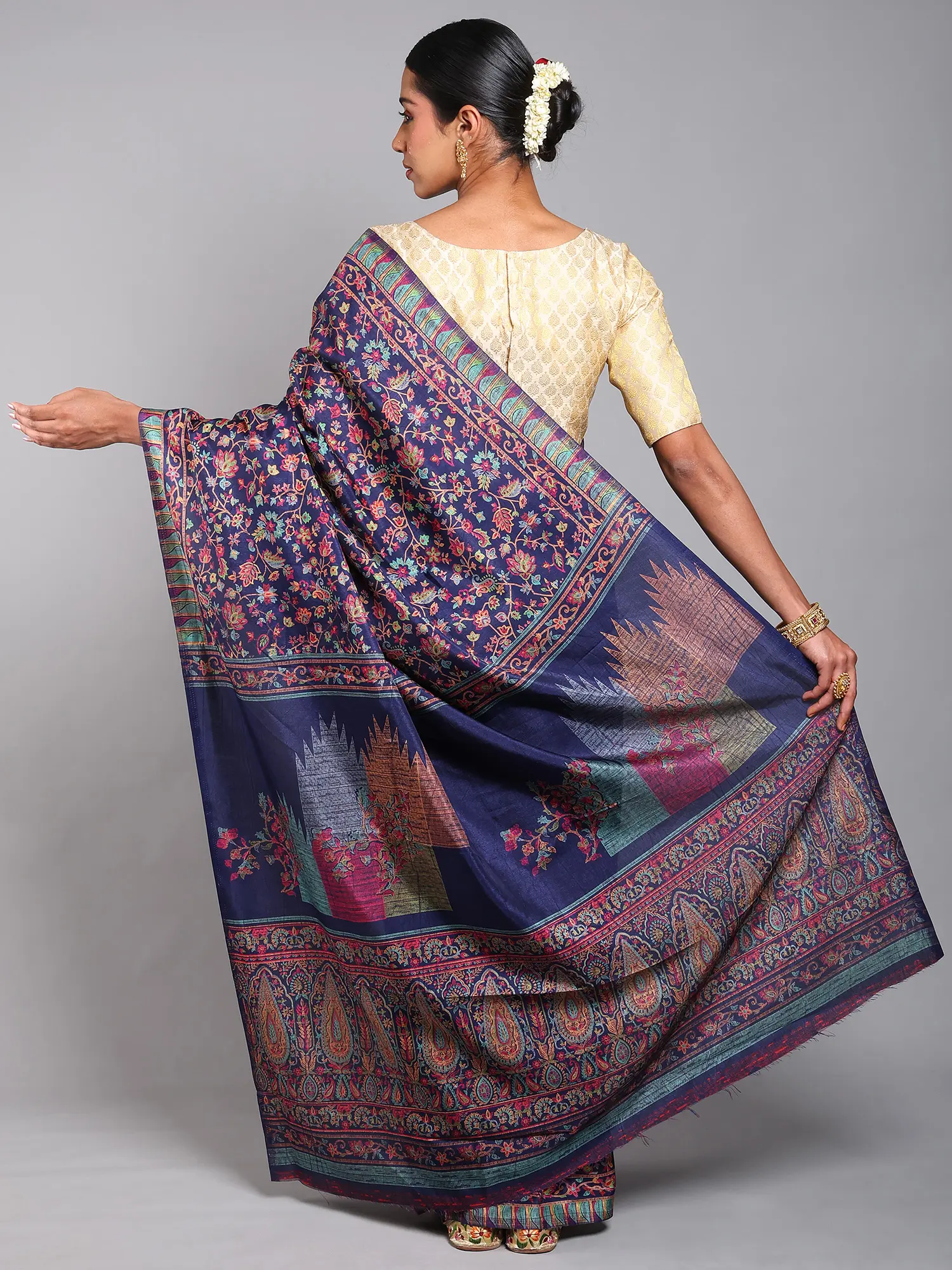 Dark-Blue Digital Printed Floral Pallu Kani Polyester Saree with Shawl