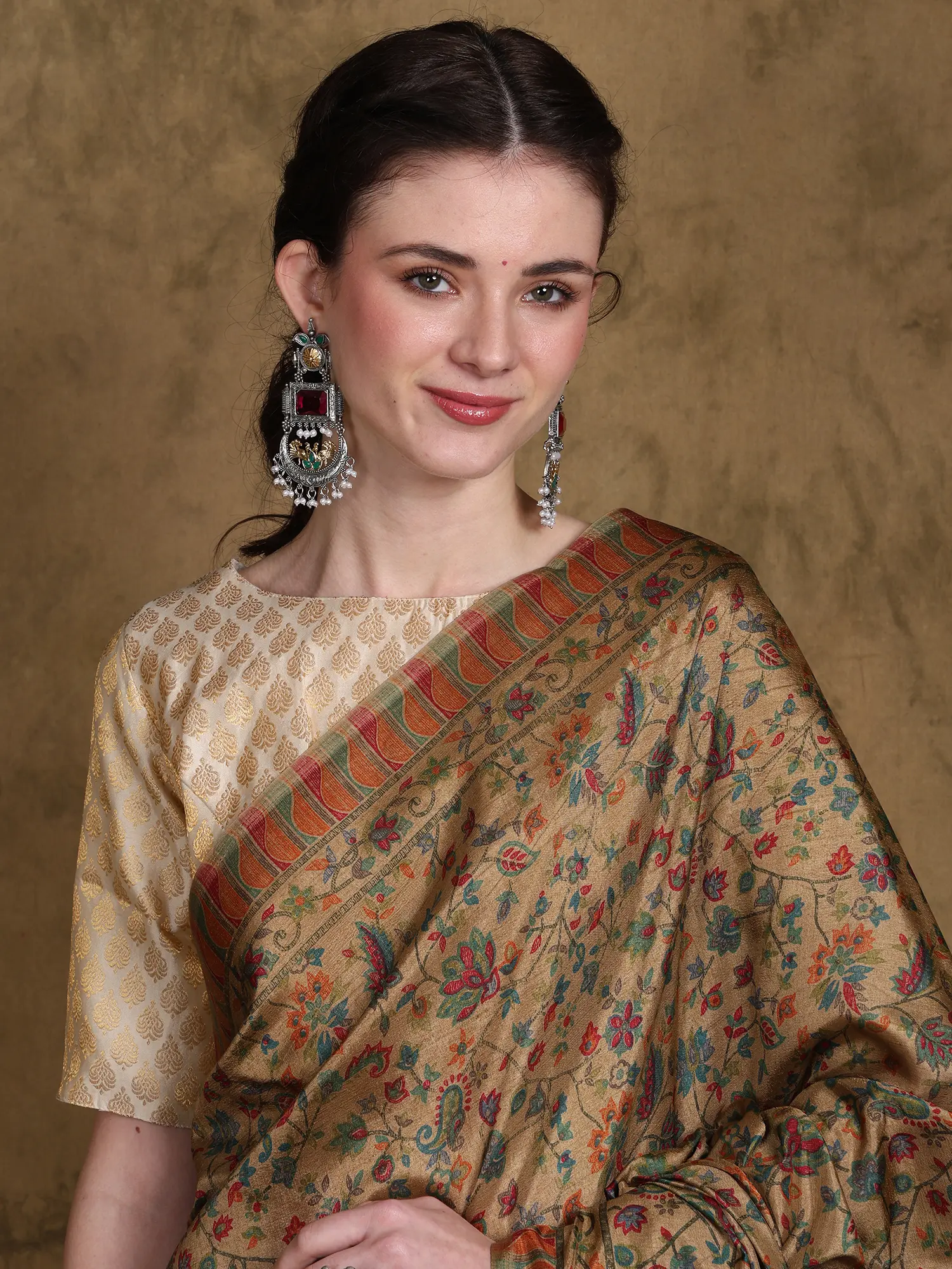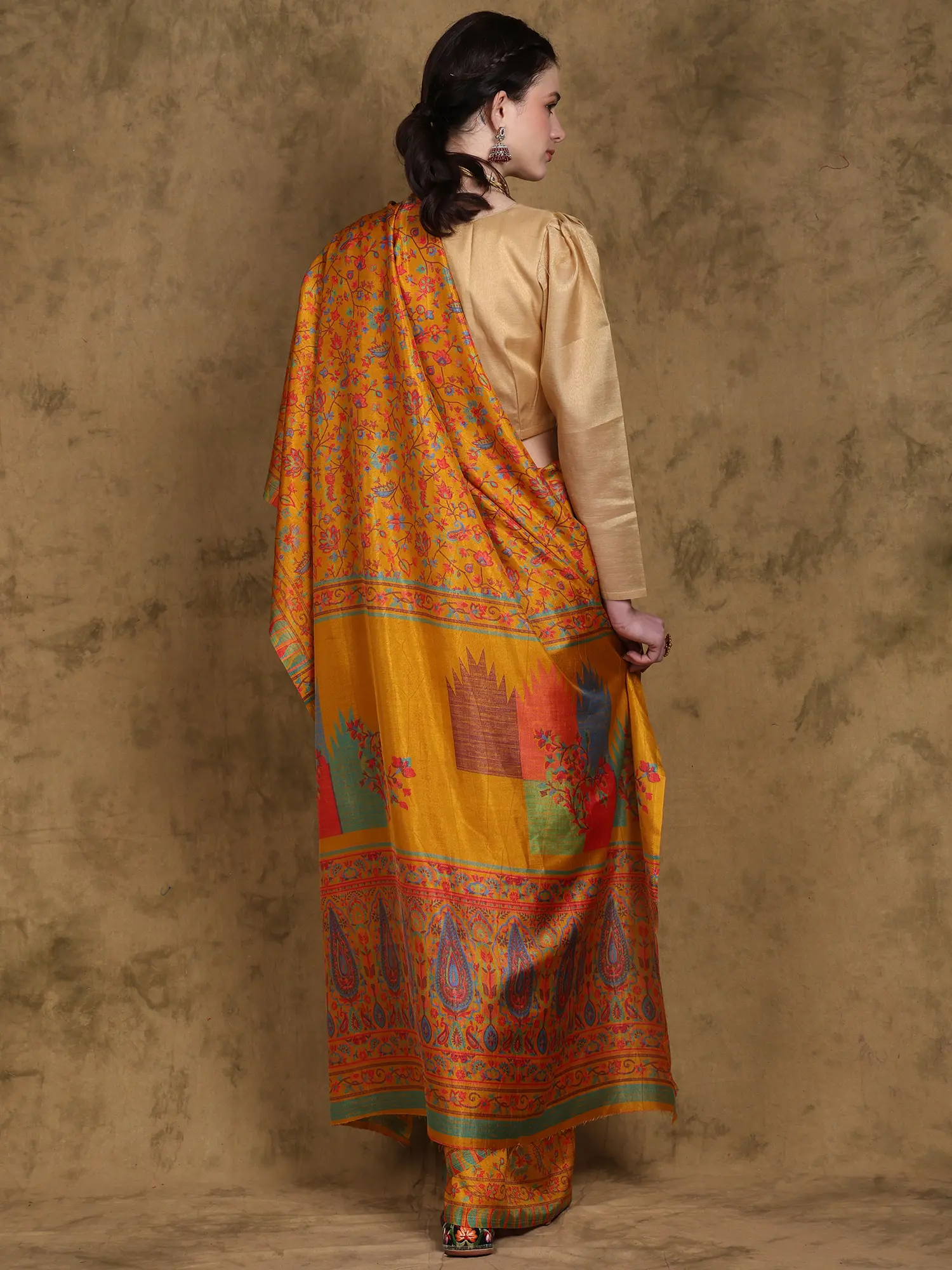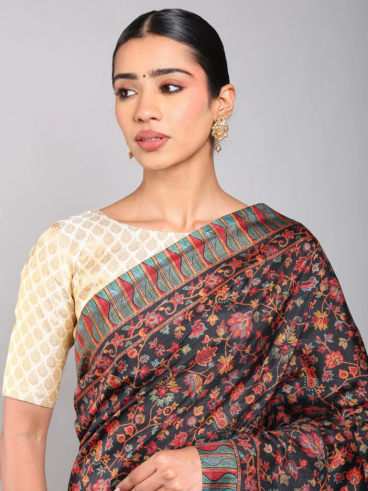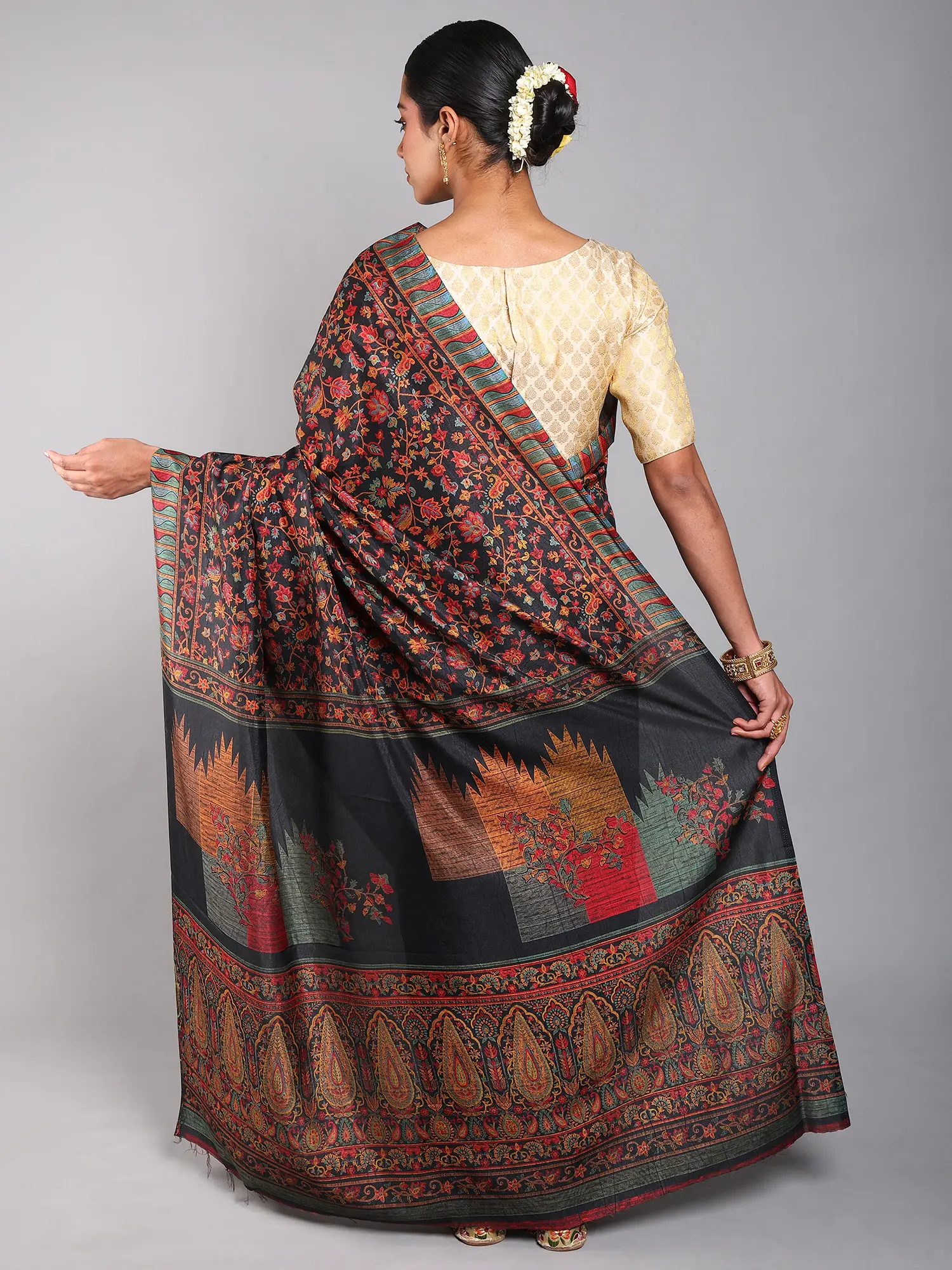 Jet-Black Digital Printed Kani Polyester Saree with Tassels Palla Shawl and Blouse
