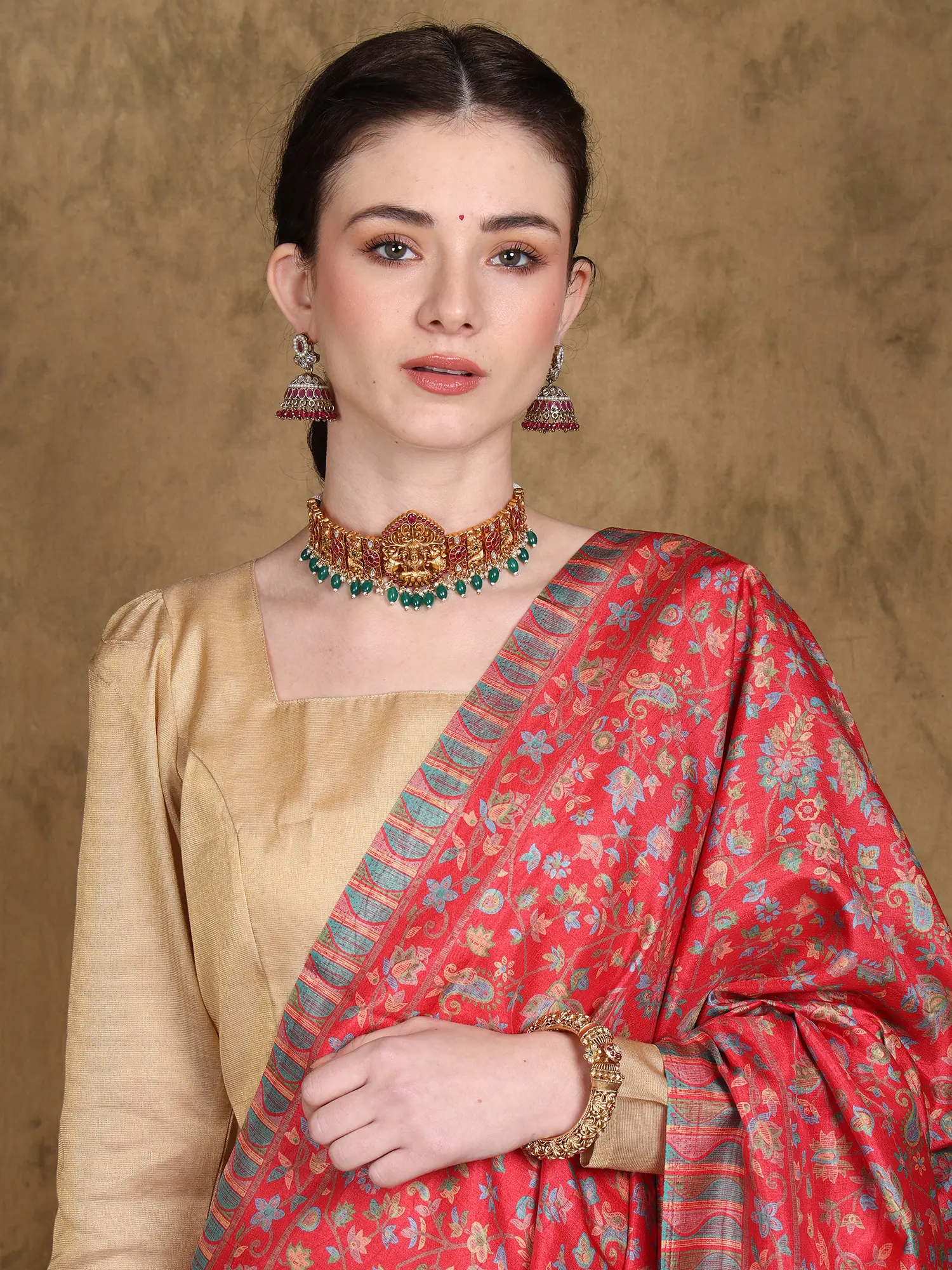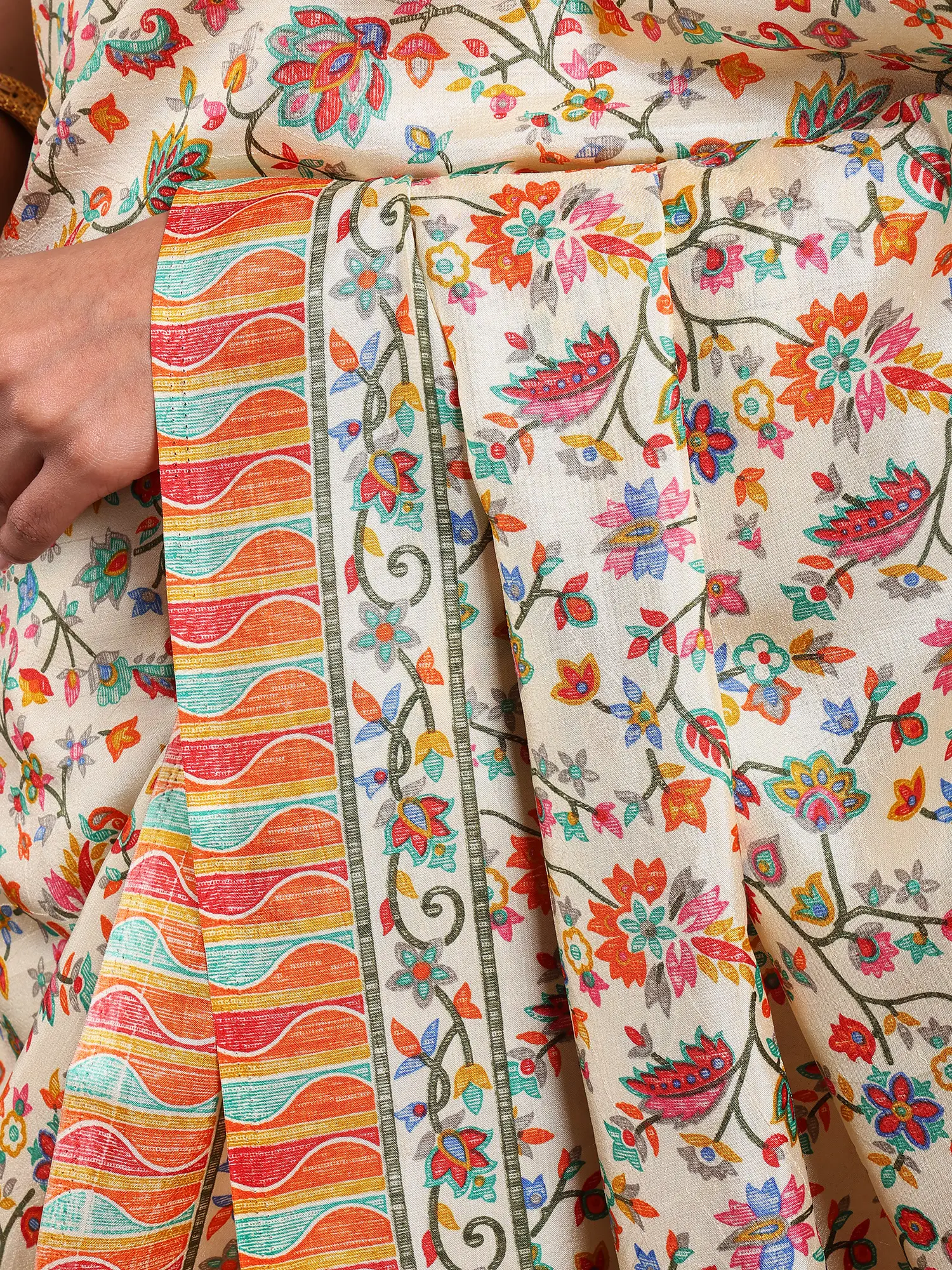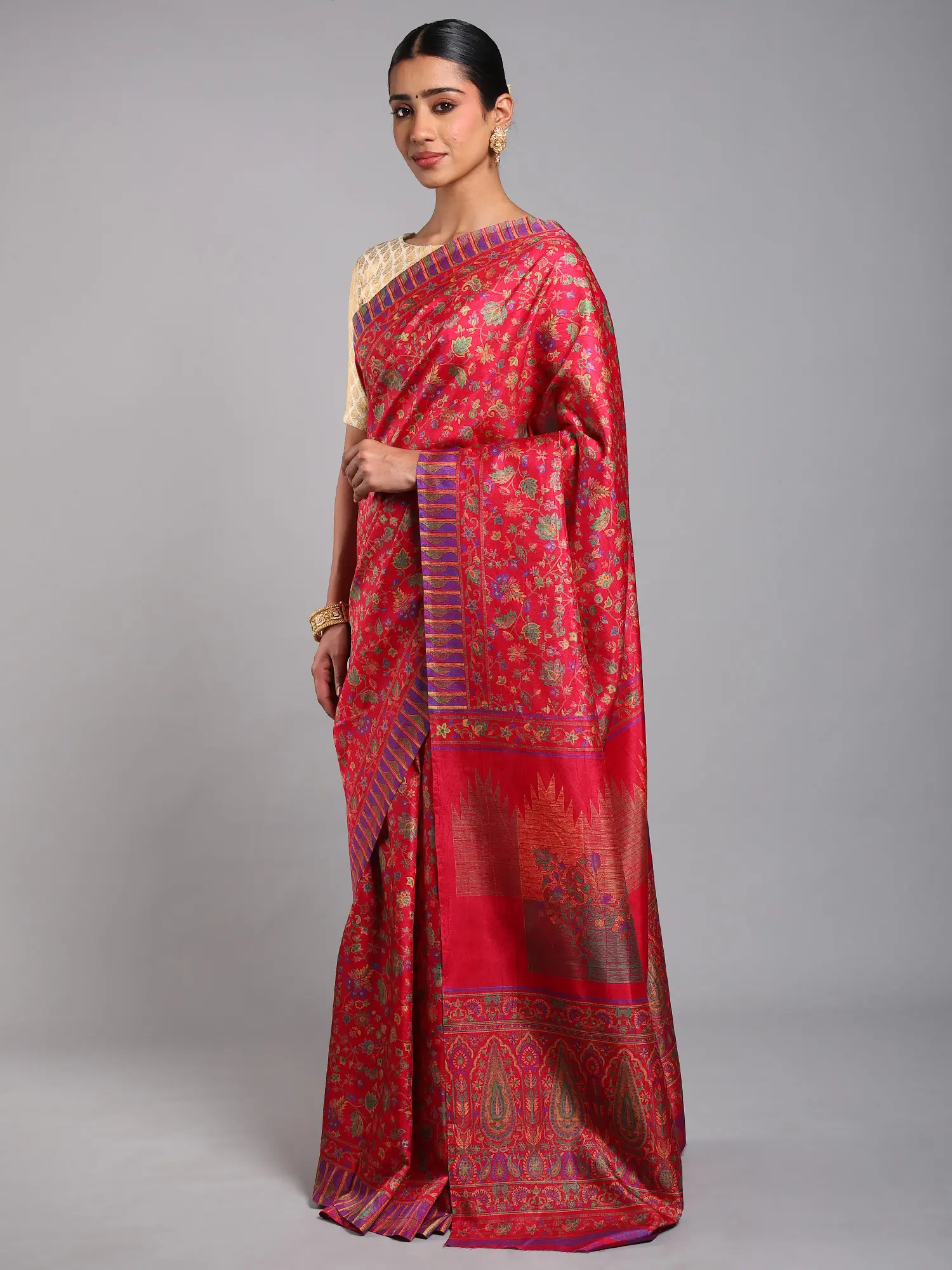 Vermillion-Orange Border All Over Floral Motif Kani Polyester Saree with Shawl and Blouse