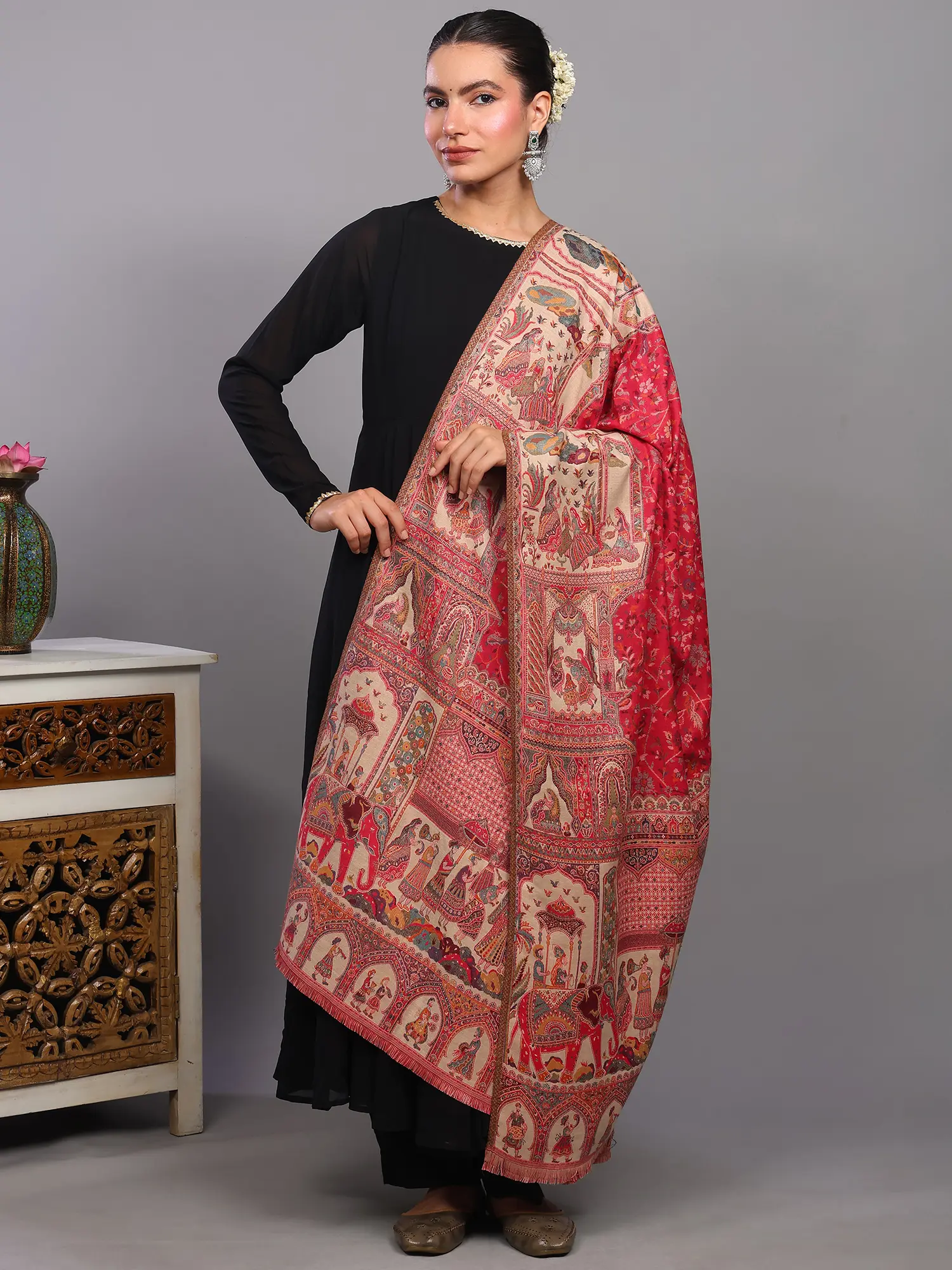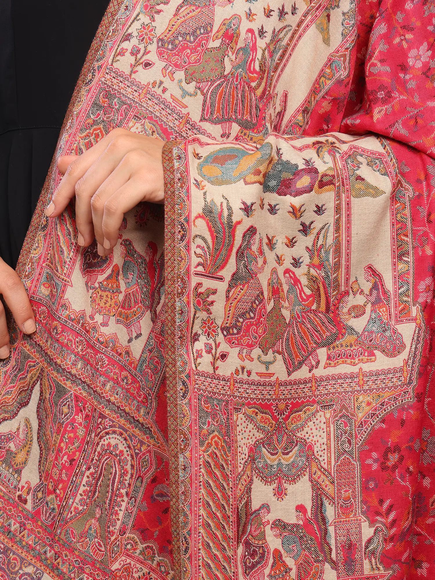 Multicolor Pure Wool Kani Shawl with Woven Marriage Procession and Zari Weave