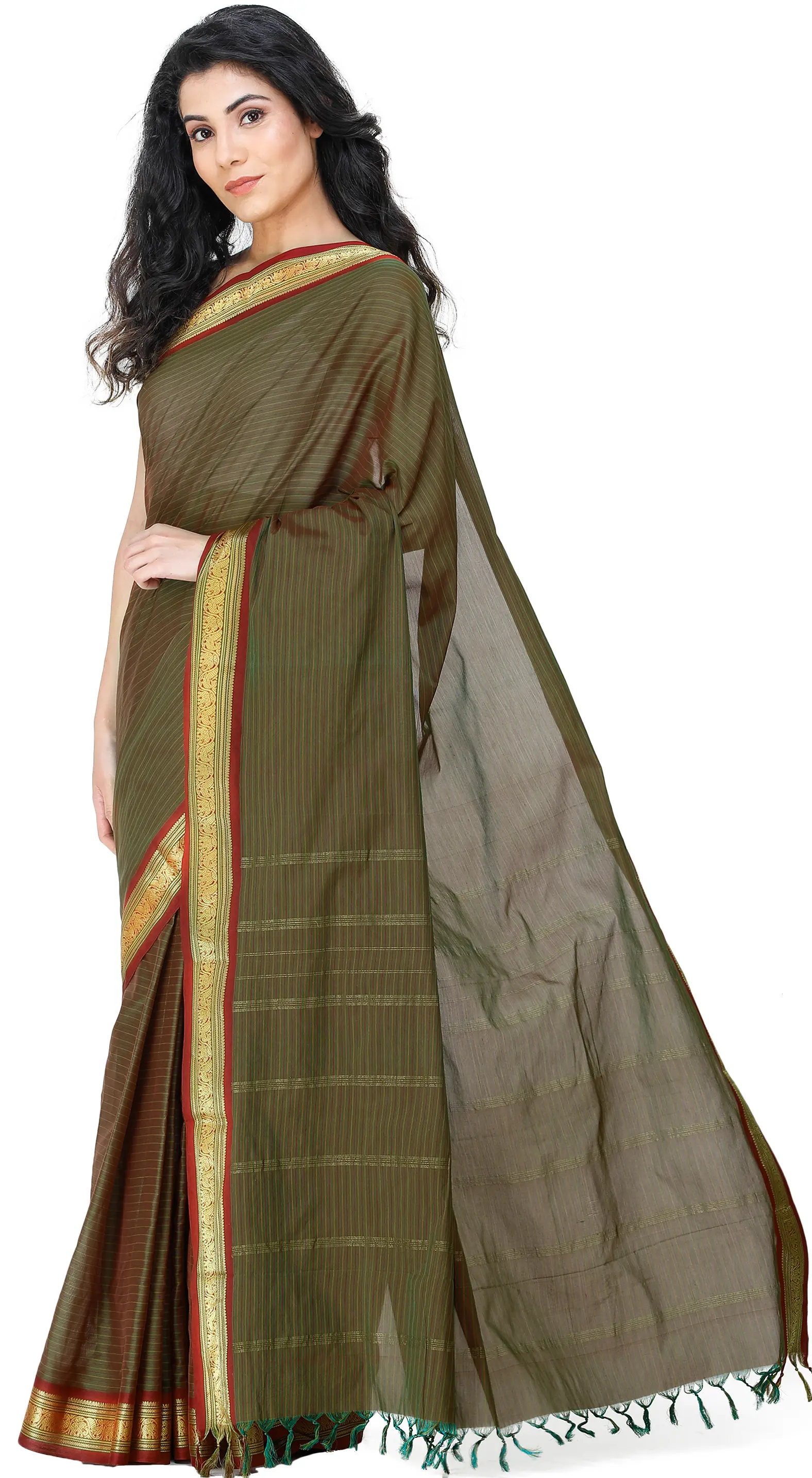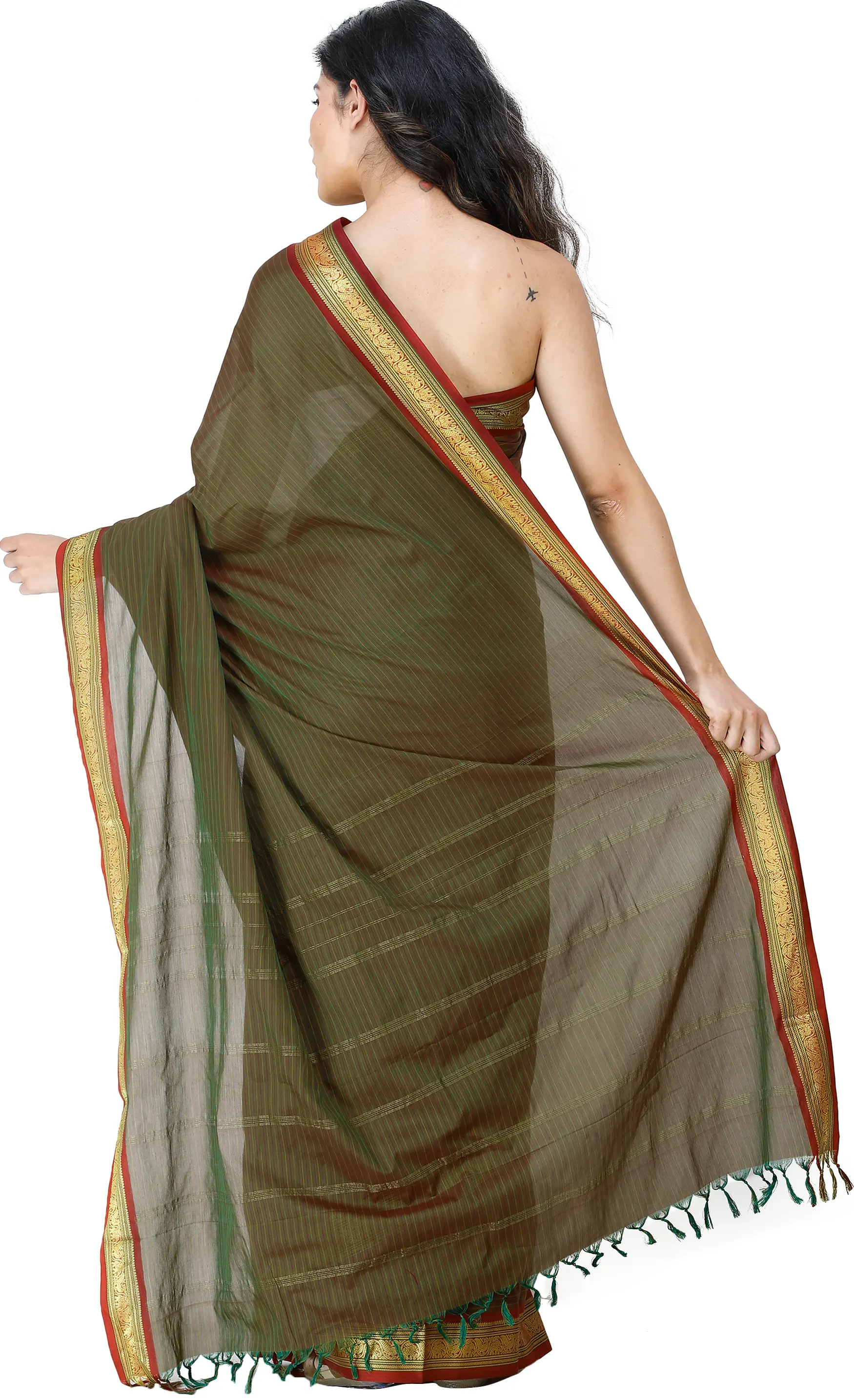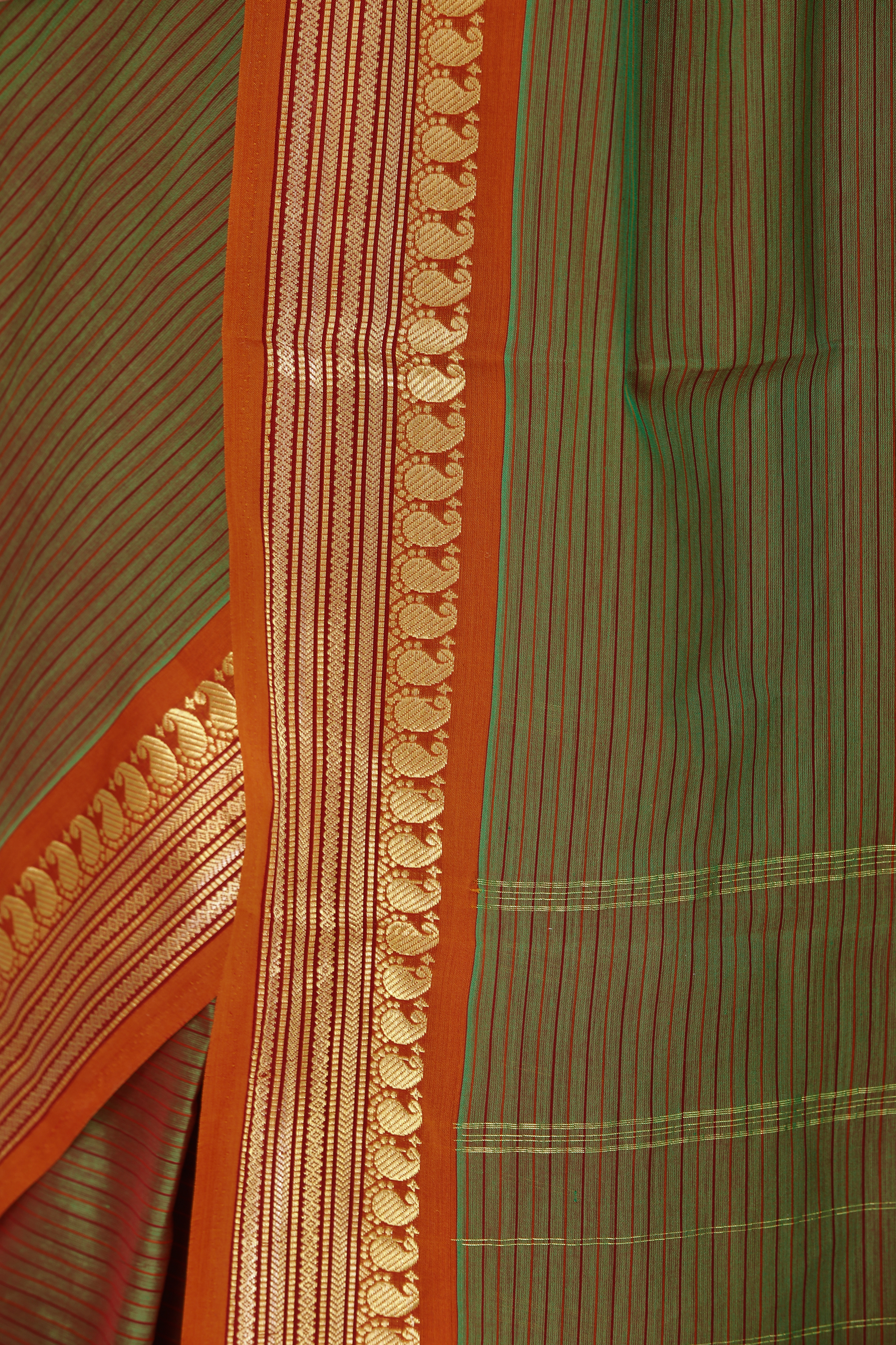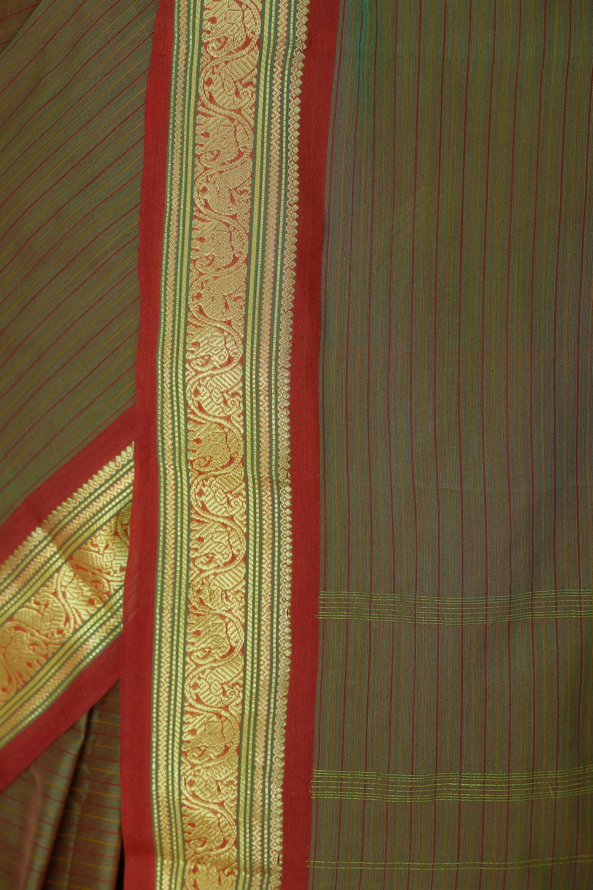 Kanji-Cotton Saree from Chennai with Zari-Woven Animals on Border and Pin-Stripes