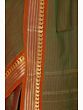 The true highlight of this saree lies in its magnificent border, meticulously woven with lustrous zari. This intricate gold threadwork features a charming motif of animals, adding a touch of regal elegance and a playful spirit to the overall design. The detailed artistry of the zari border is a visual delight, showcasing the mastery of the weavers. Complementing the animal motifs are layers of vibrant red and deep green, interspersed with more golden zari bands, creating a rich and eye-catching frame for the entire saree. The pallu, a drape that cascades with graceful folds, continues this exquisite border, ensuring that this saree makes a statement from every angle.