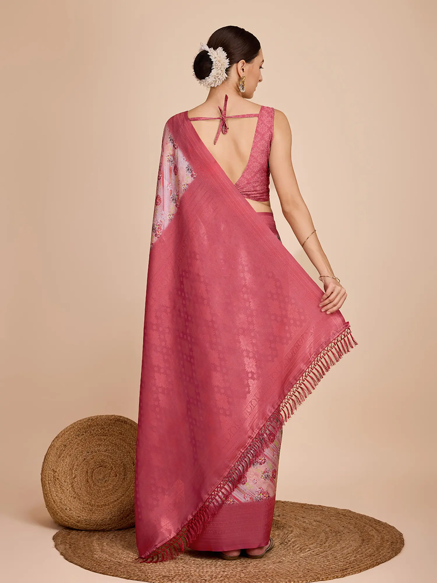 The saree's base is a delicate canvas of soft, blush pink, adorned with a captivating floral print. Sprigs of roses and subtle geometric patterns are woven throughout, creating a visual tapestry that is both romantic and sophisticated. The intricate details of the floral motifs, rendered in subtle shades of pink, violet, and hints of green, add depth and dimension, drawing the eye with their subtle charm. This charming pattern makes the saree a perfect choice for daytime events and celebratory gatherings alike.