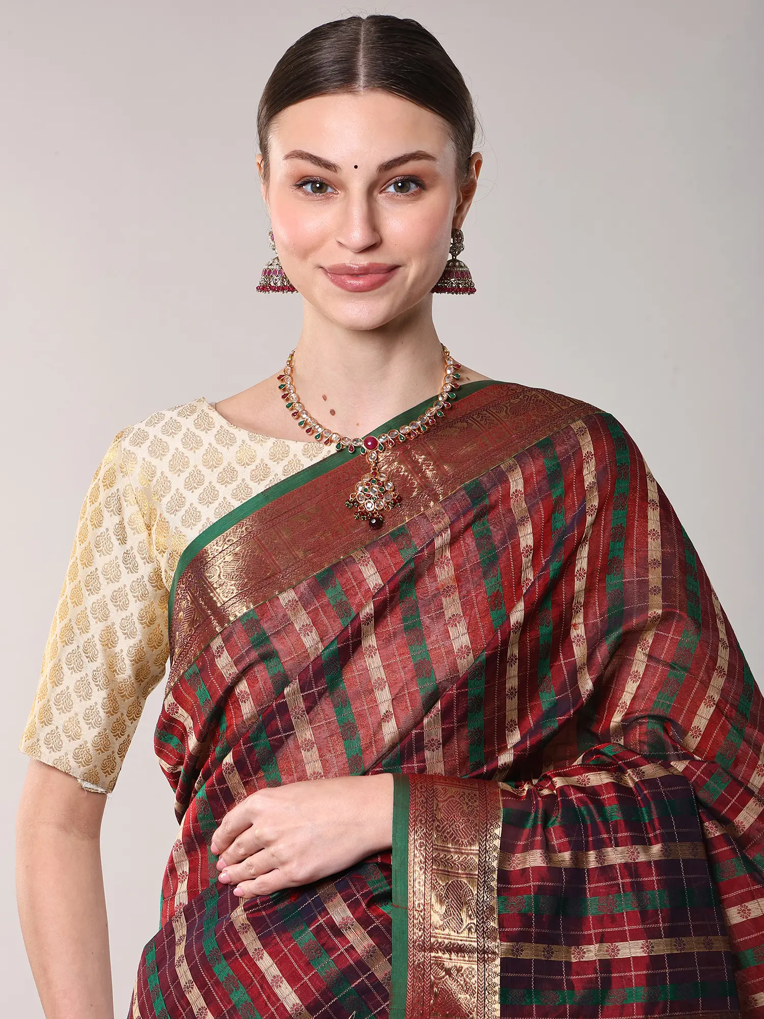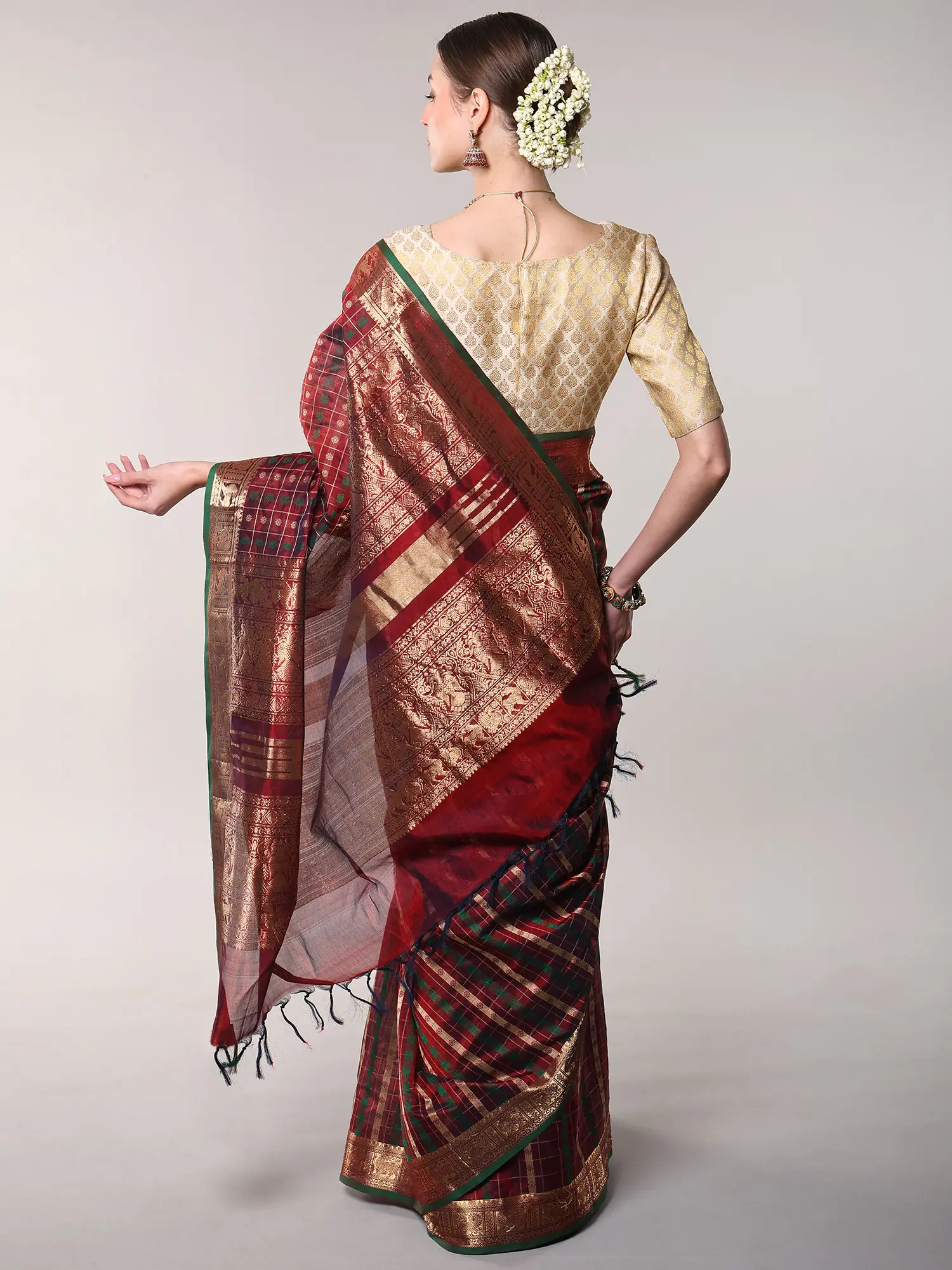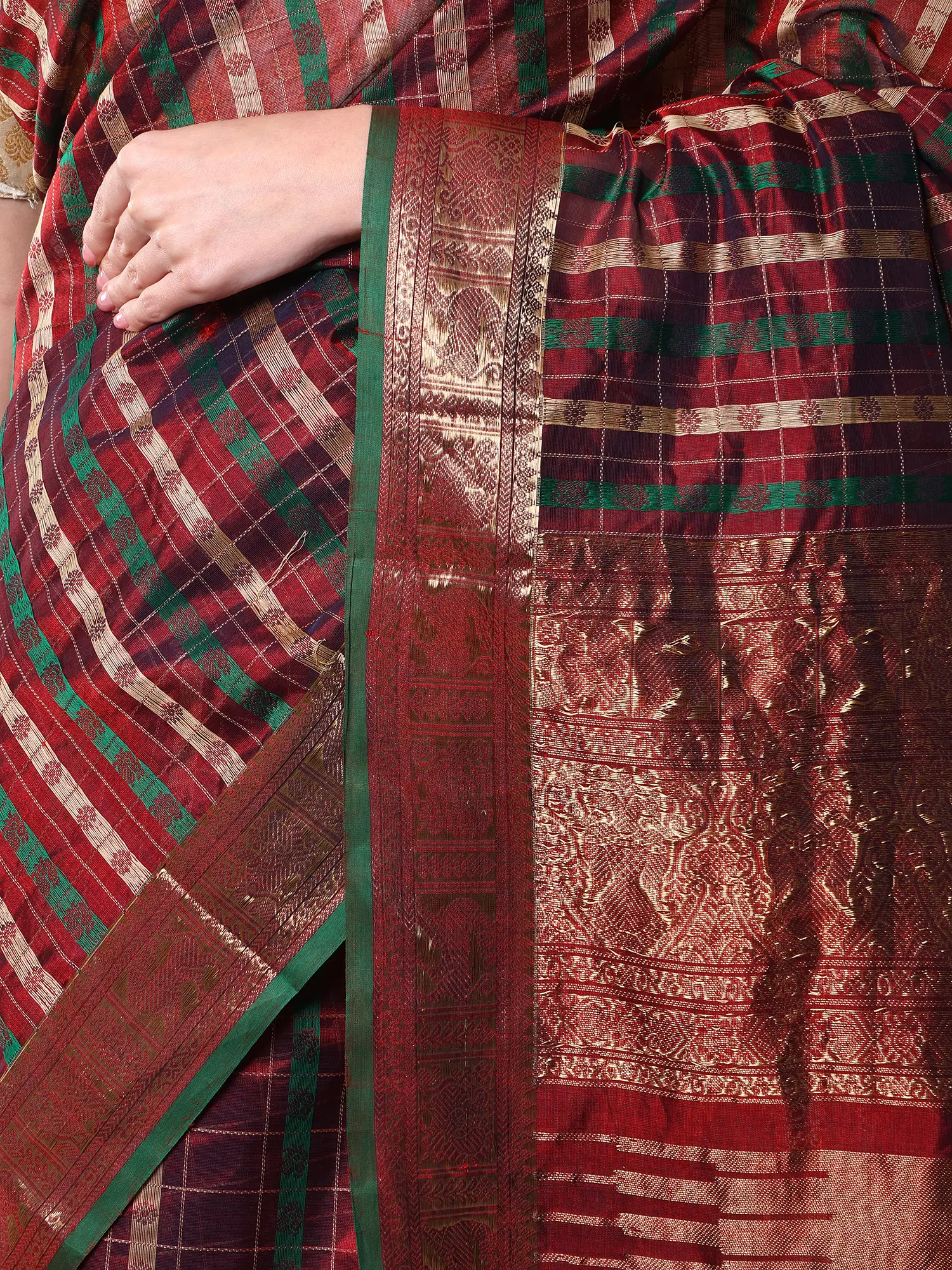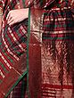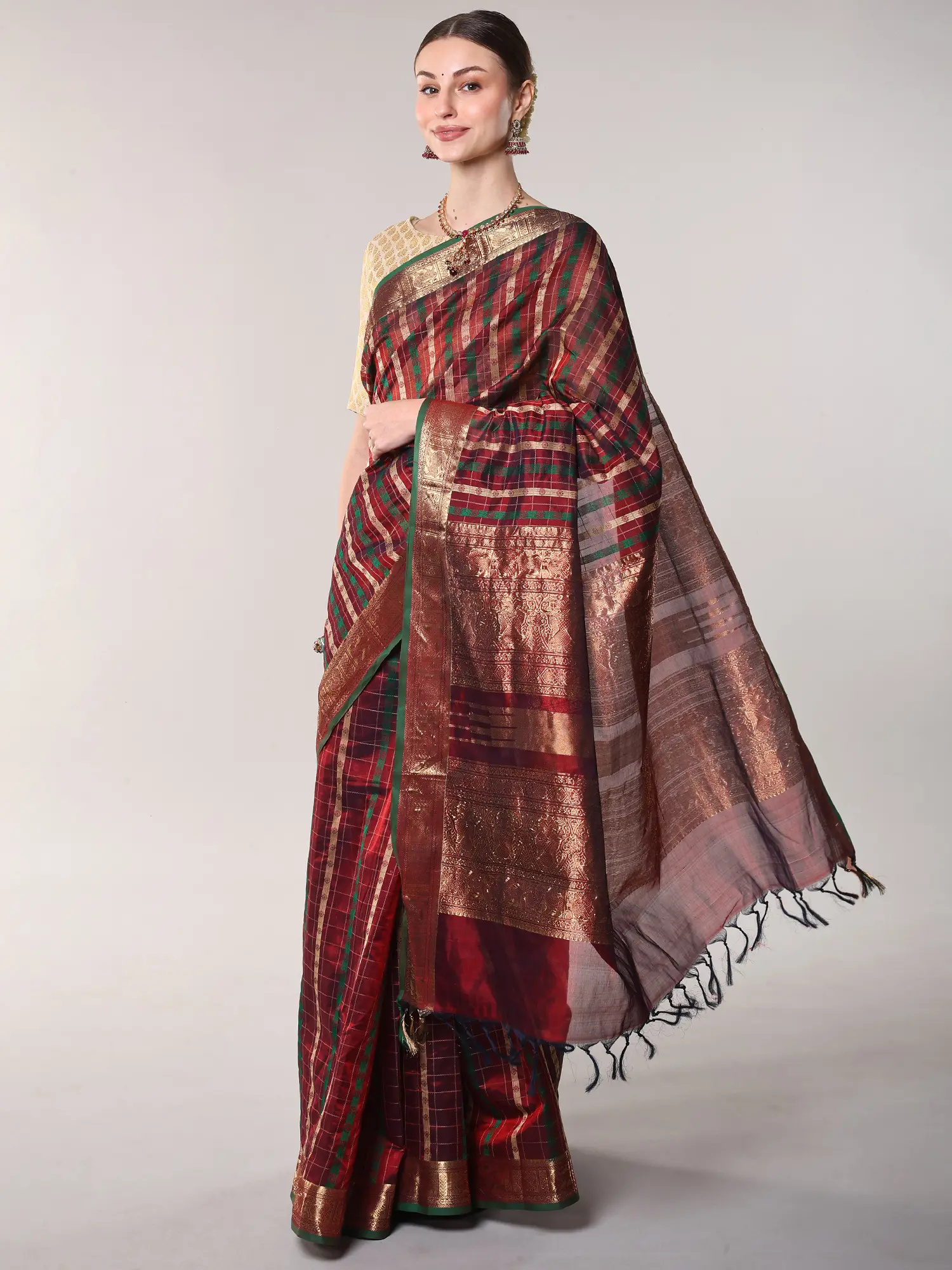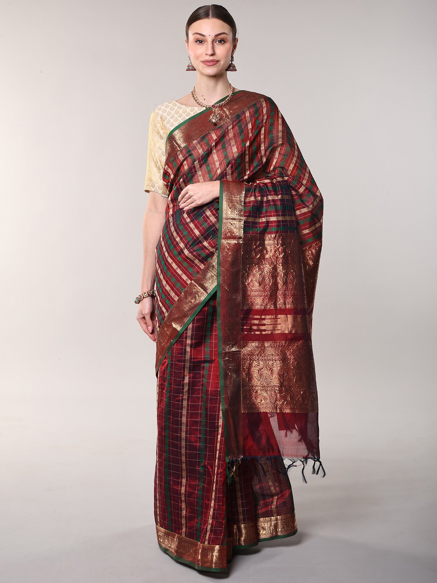 The body of this striking textile is adorned with a sophisticated plaid of deep reds and forest greens, interlaced with fine gold threads that catch the light with every movement. Its broad border is a masterpiece of traditional weaving, showcasing the auspicious motif of chakras alongside elegantly rendered peacocks in shimmering gold, creating a visual narrative of prosperity and beauty. The pallu, with its sheerer weave, offers a delicate contrast, finished with a charming fringe that adds a final touch of finesse.