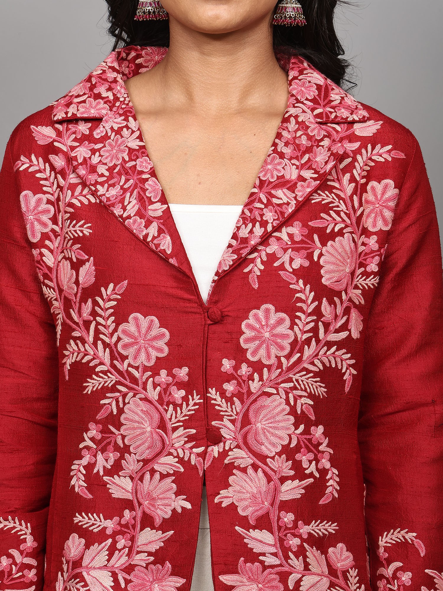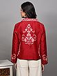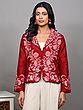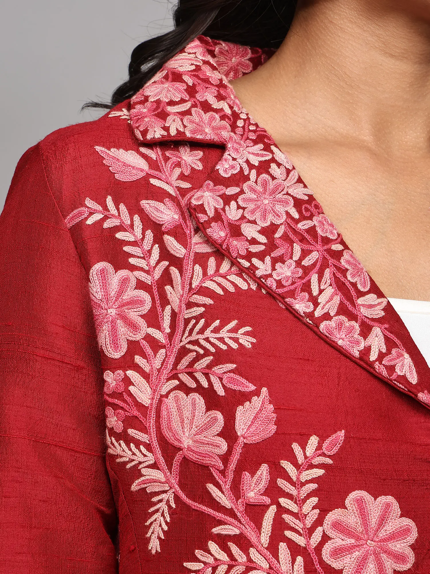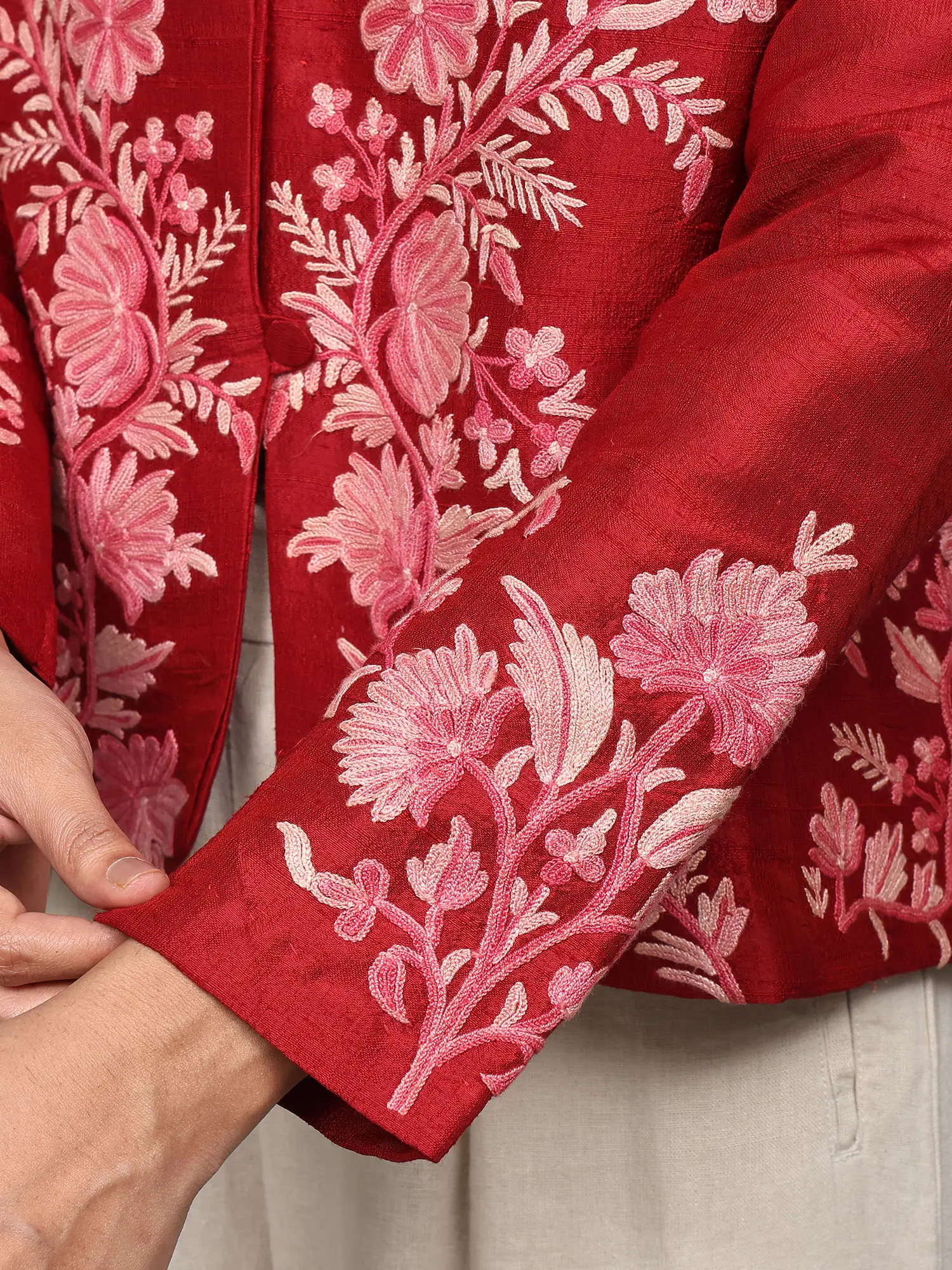 Elevate your wardrobe with this stunning short jacket, a true testament to the rich artistry of Kashmiri craftsmanship. Crafted from the finest pure silk, this piece offers a luxurious feel and an elegant drape that is unparalleled. The vibrant red hue serves as a rich canvas for an intricate, hand-embroidered floral vine design, meticulously created using the traditional Aari technique. This ancient embroidery method involves using a hook-like needle to create chain stitches, resulting in a raised, textured pattern that truly brings the motifs to life.