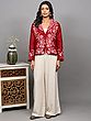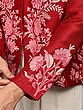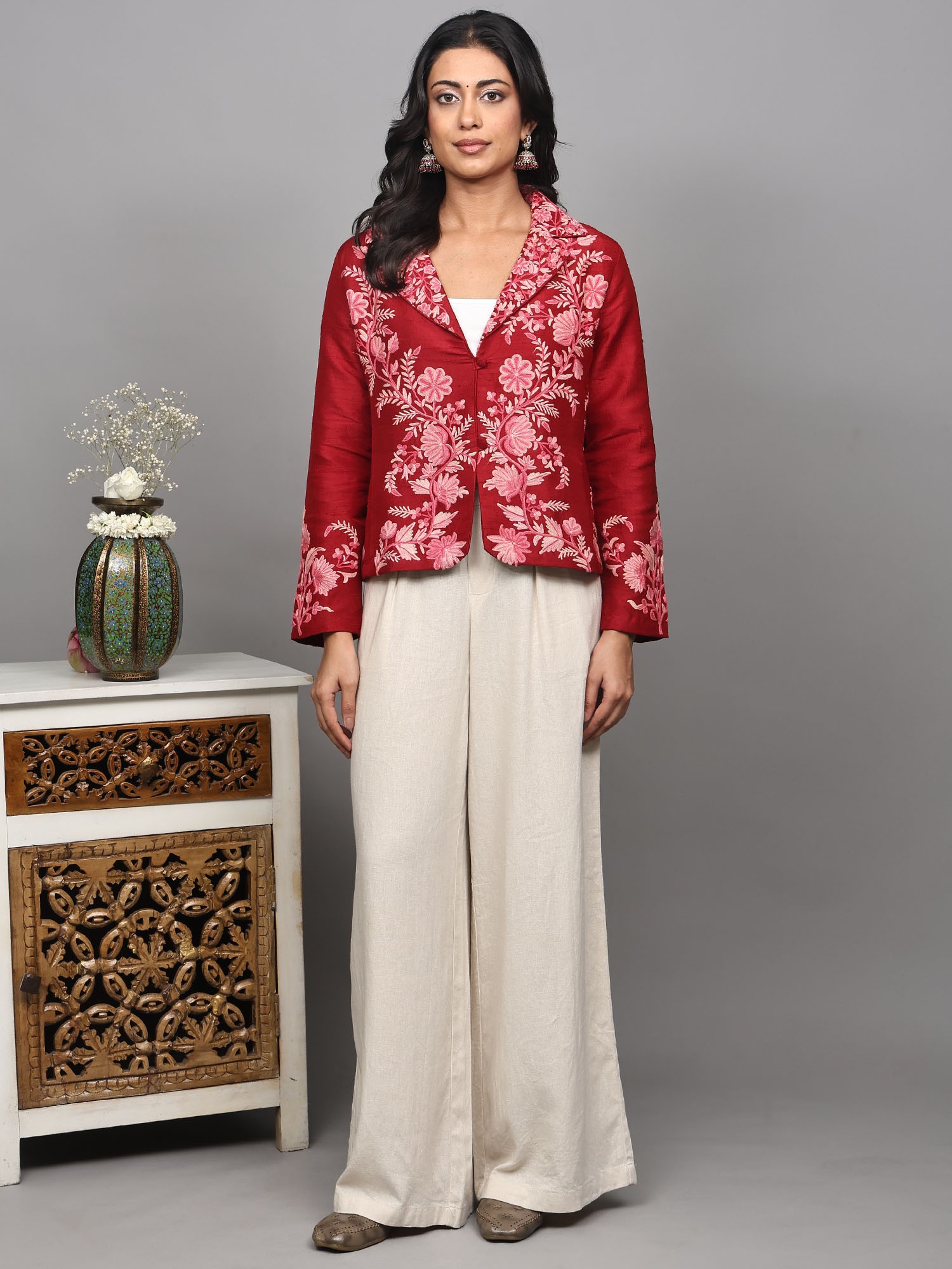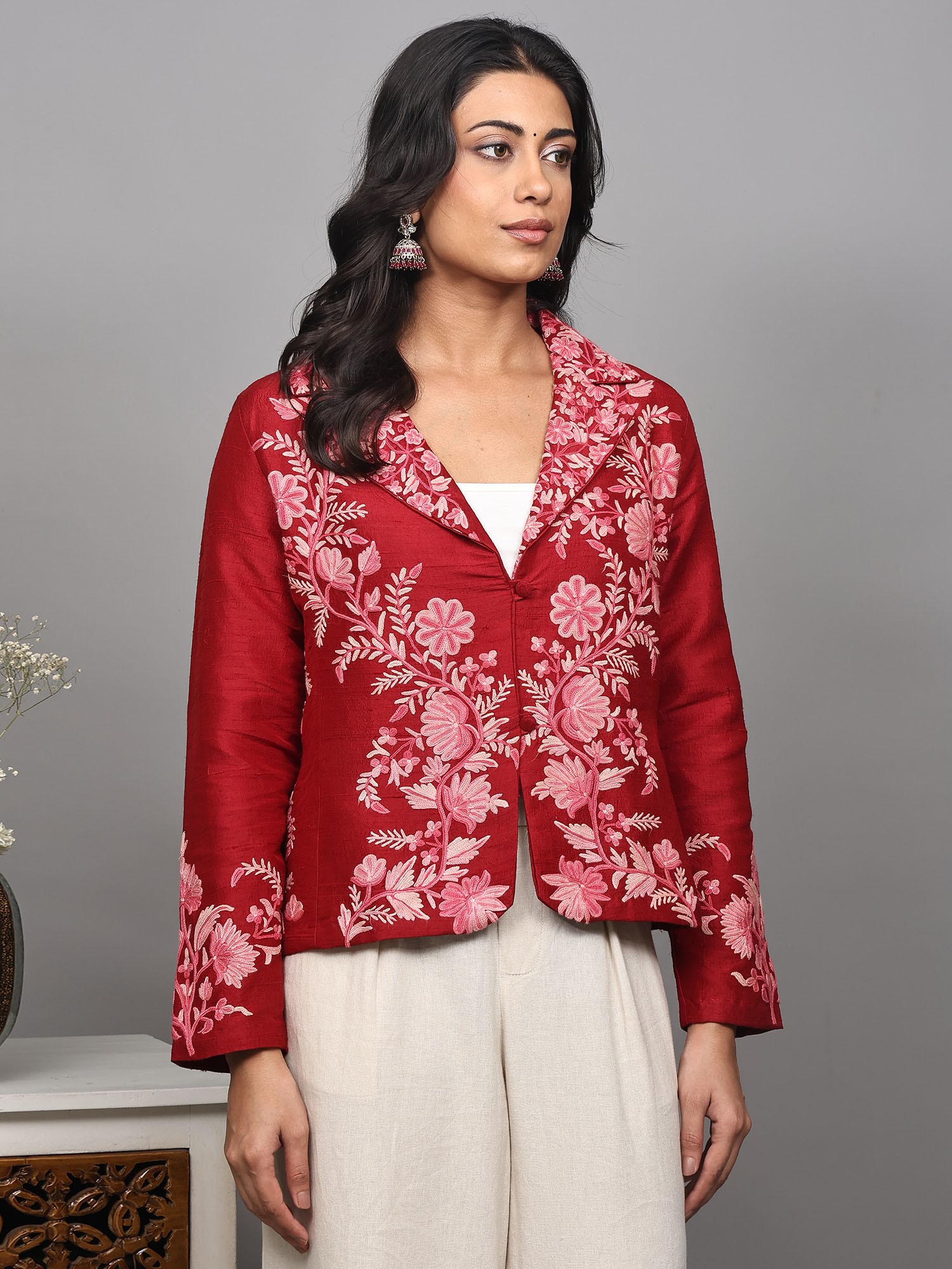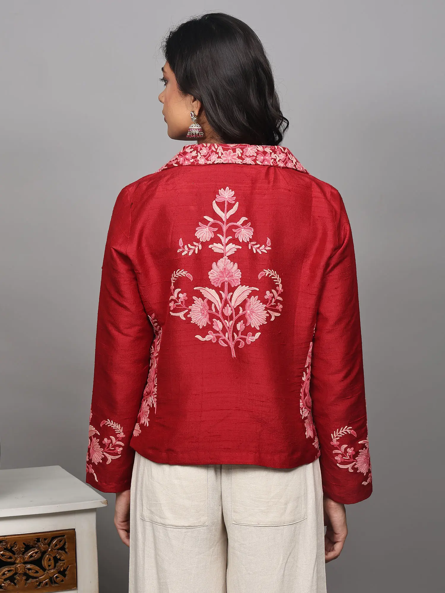 Elevate your wardrobe with this stunning short jacket, a true testament to the rich artistry of Kashmiri craftsmanship. Crafted from the finest pure silk, this piece offers a luxurious feel and an elegant drape that is unparalleled. The vibrant red hue serves as a rich canvas for an intricate, hand-embroidered floral vine design, meticulously created using the traditional Aari technique. This ancient embroidery method involves using a hook-like needle to create chain stitches, resulting in a raised, textured pattern that truly brings the motifs to life.